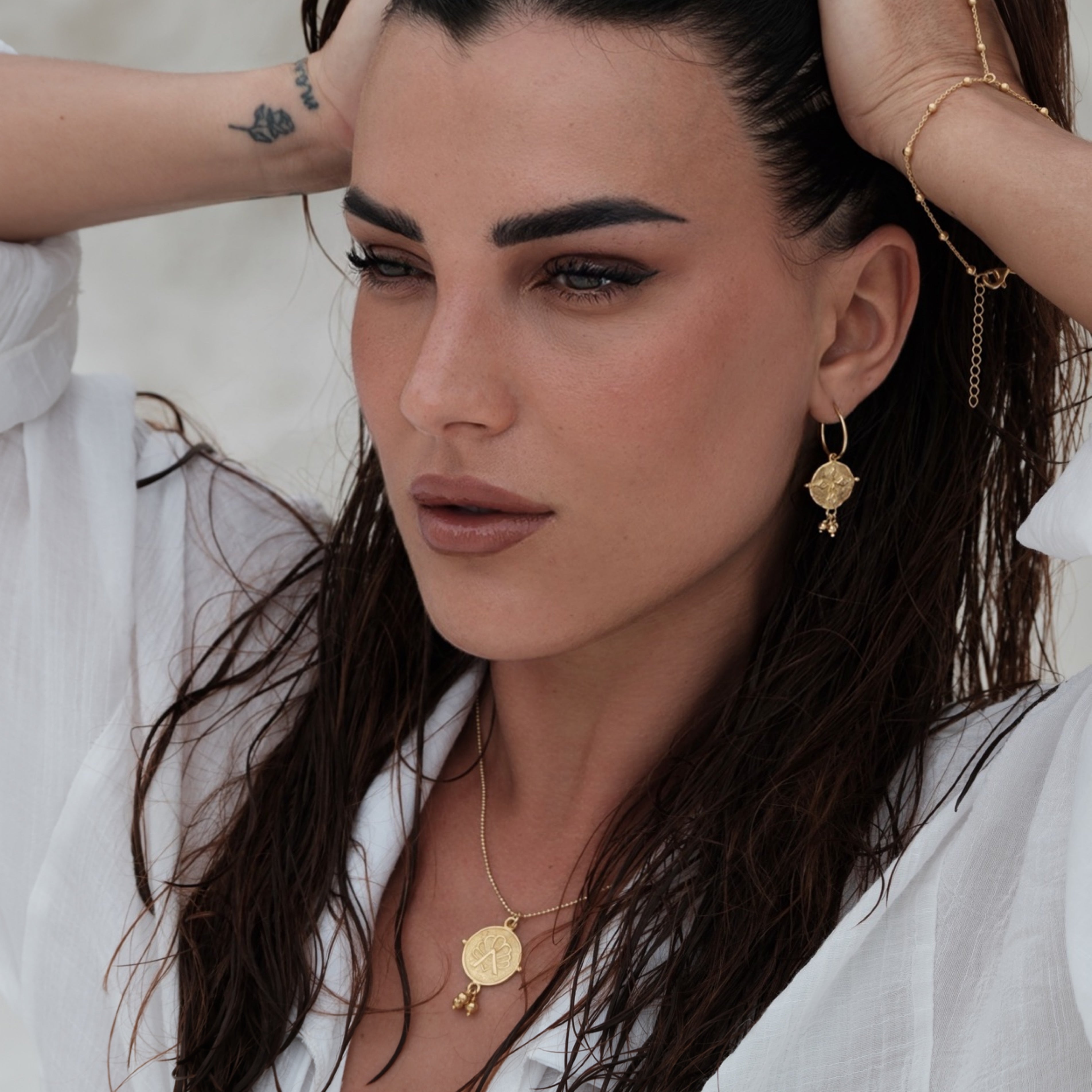 Ogni gioiello, realizzato a mano in argento placcato oro 18k, racconta storie millenarie attraverso dettagli che richiamano le tradizioni e la bellezza senza tempo di questa terra straordinaria.
