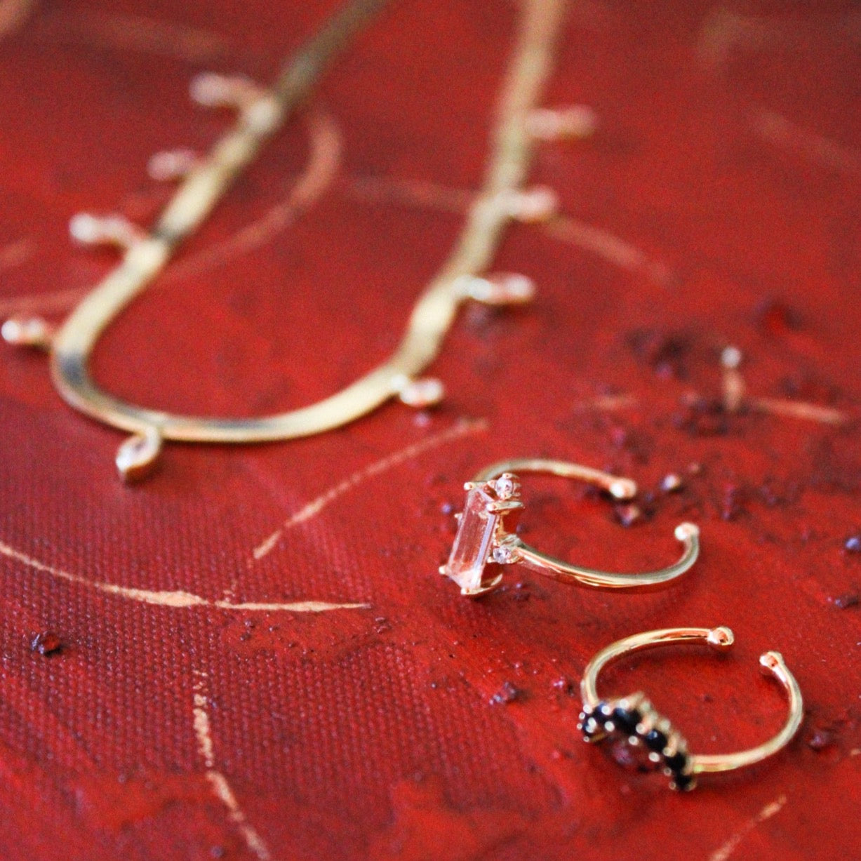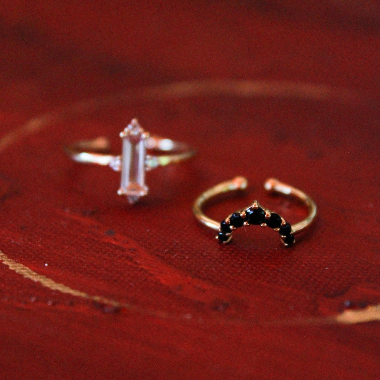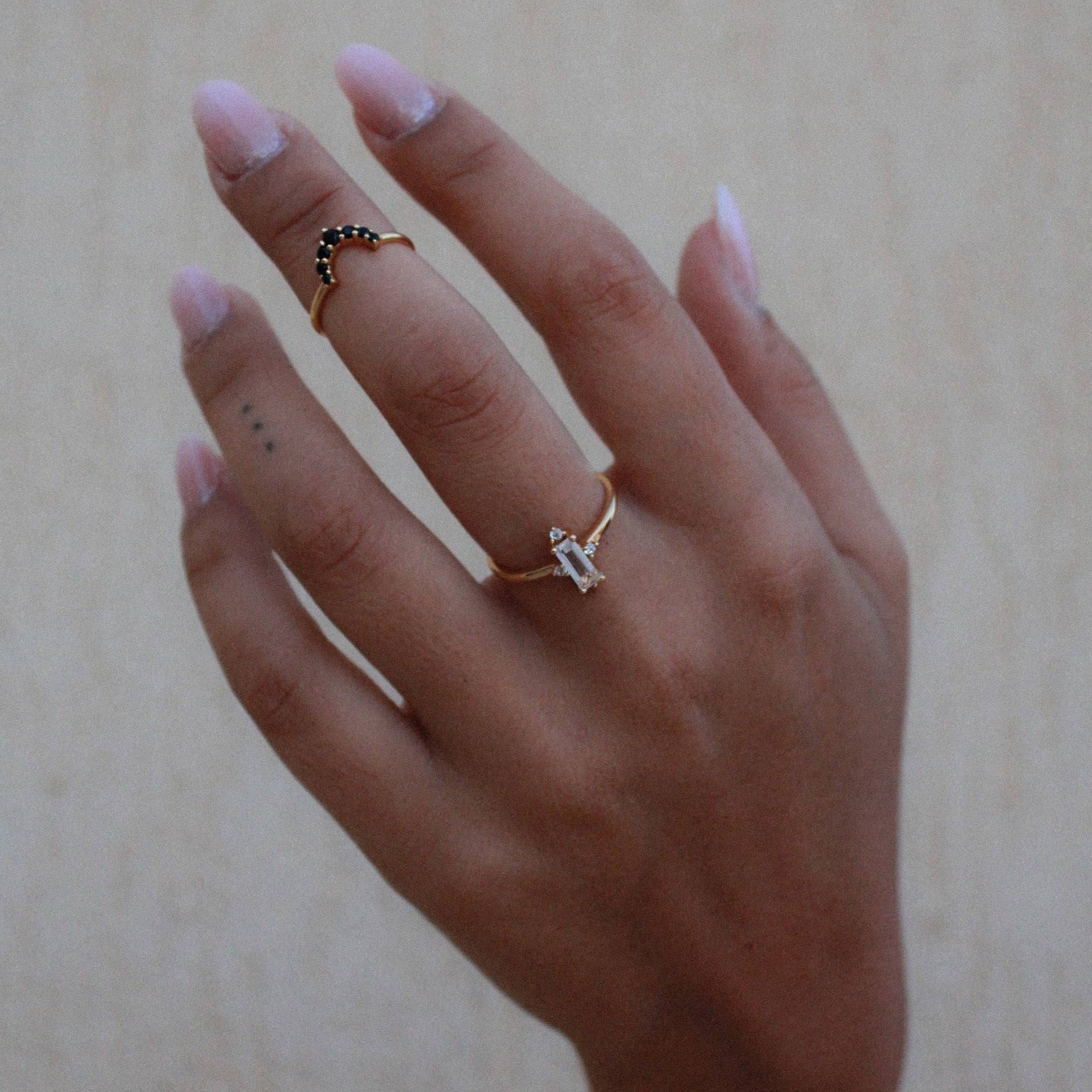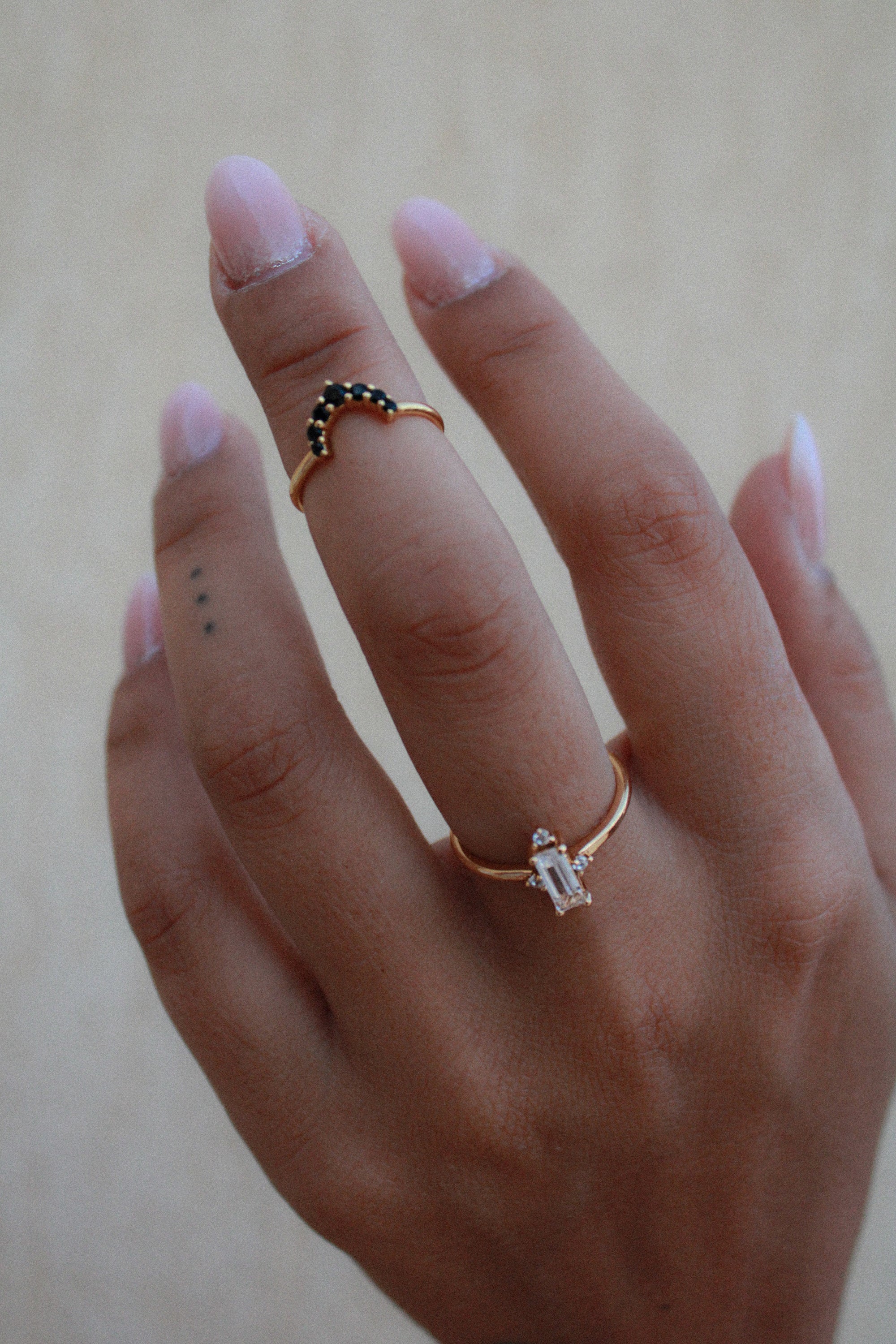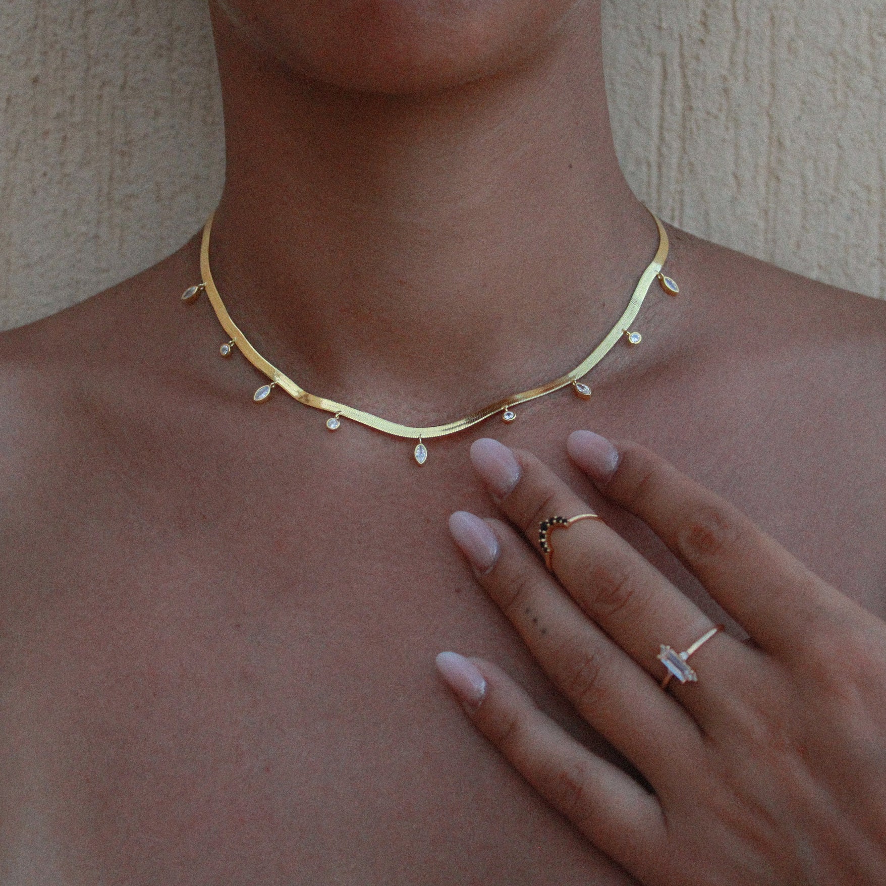 Ho voluto ispirarmi alla raffinatezza del suo stile per fare questa parure, composta da una collana shake girocollo piatta con punti luce bianchi e due anelli da mano: uno con un raffinato zircone baguette e piccoli punti luce sulla cornice e l’altro, a mezzo dito o chevalier avente una semicorona di zirconi neri che, indossati assieme, renderanno le tue mani preziose come quelle di Nefertiti.