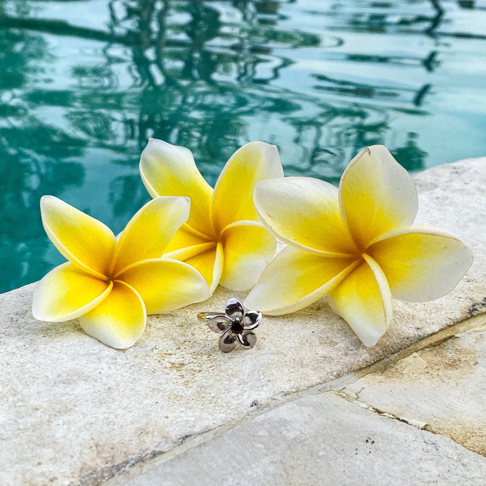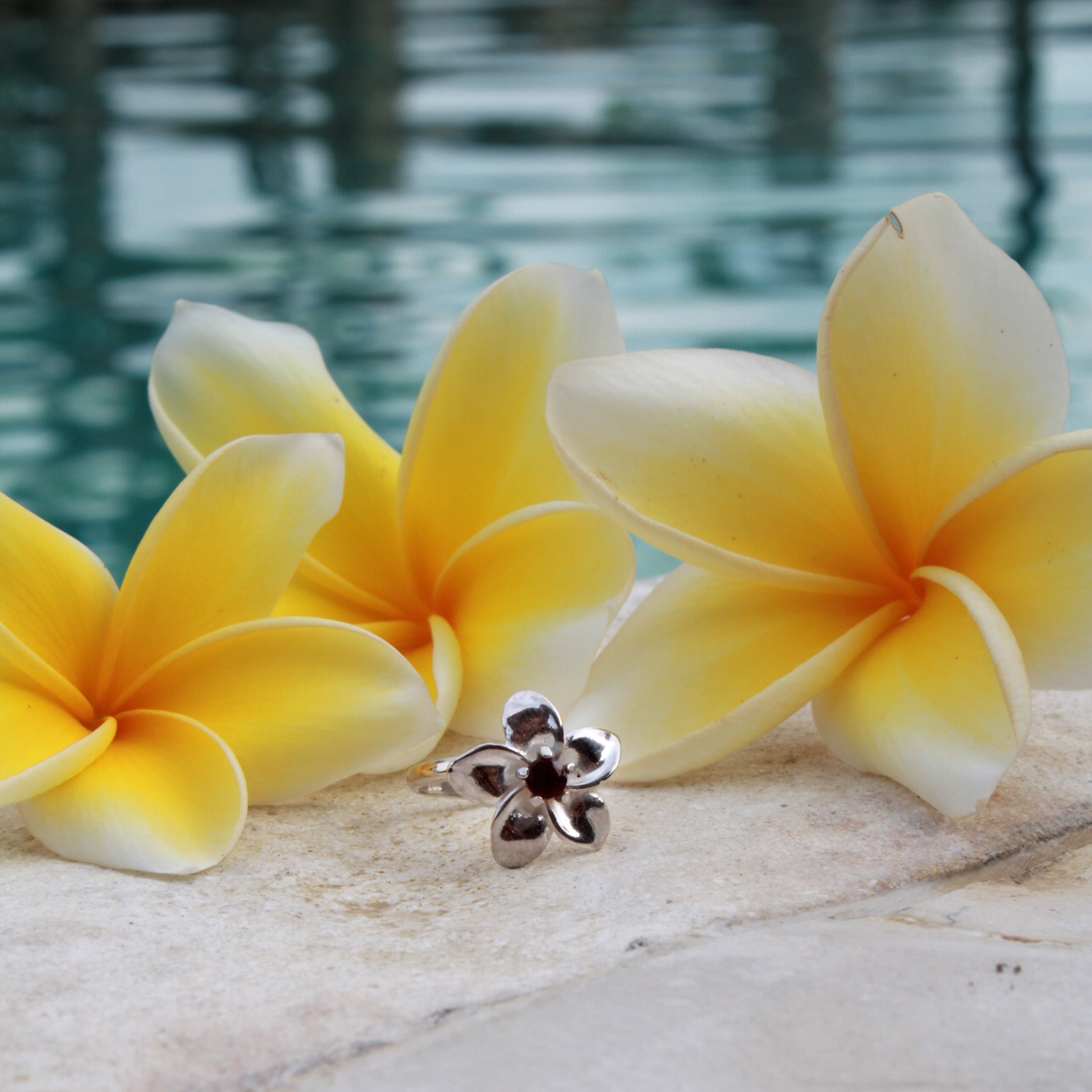Anello regolabile in Argento 925 a forma di fiore di frangipani con pietra tormalina.