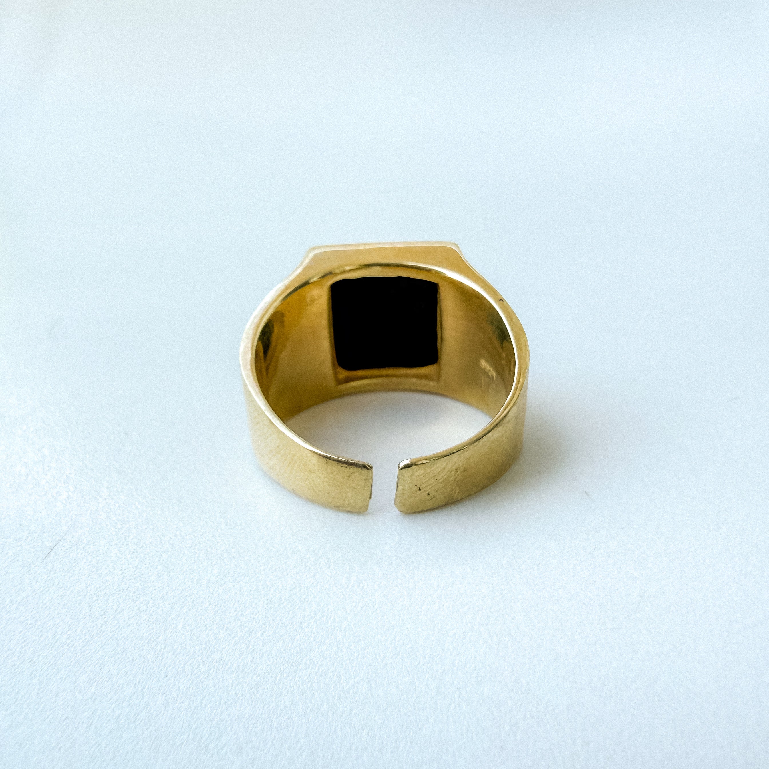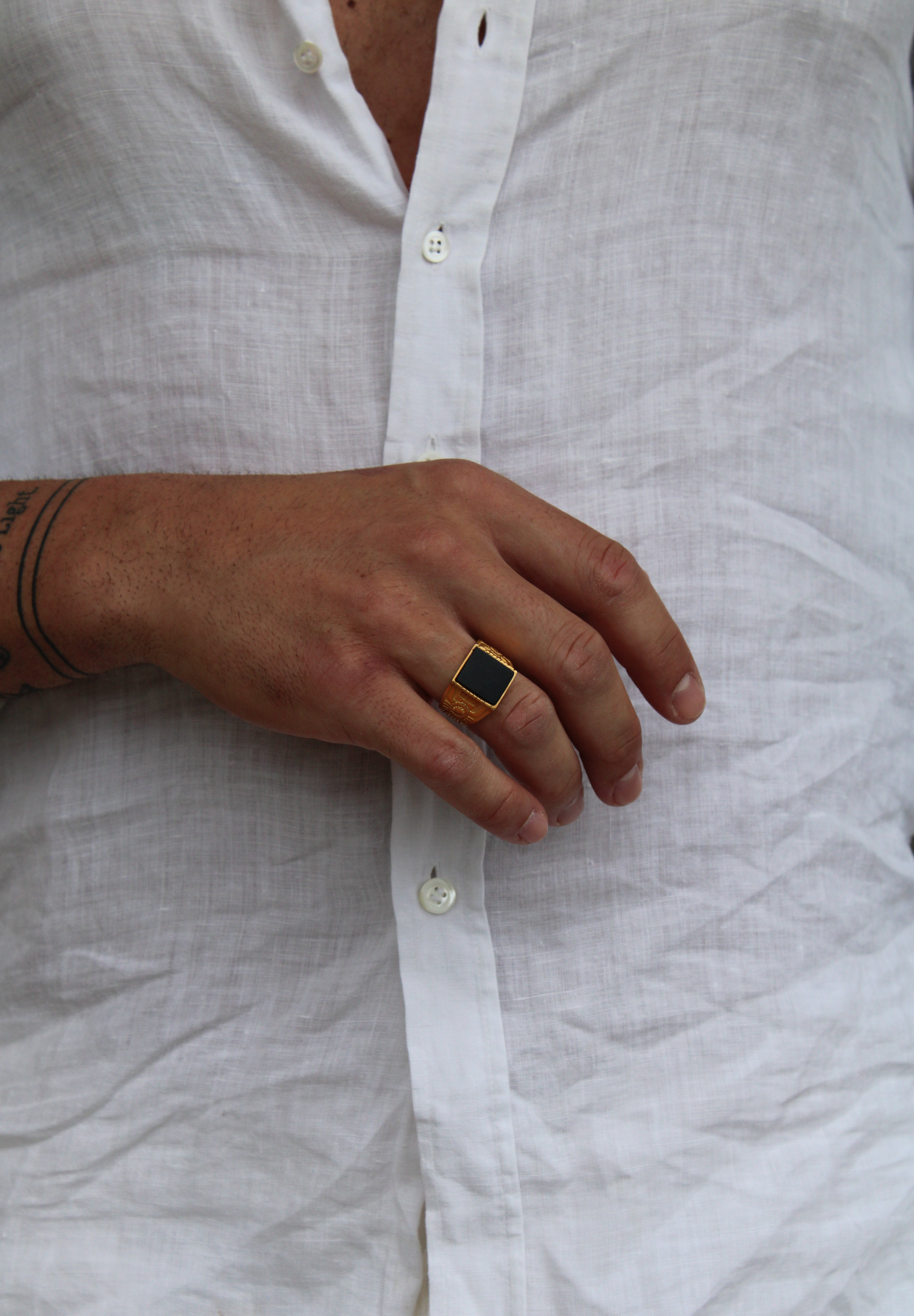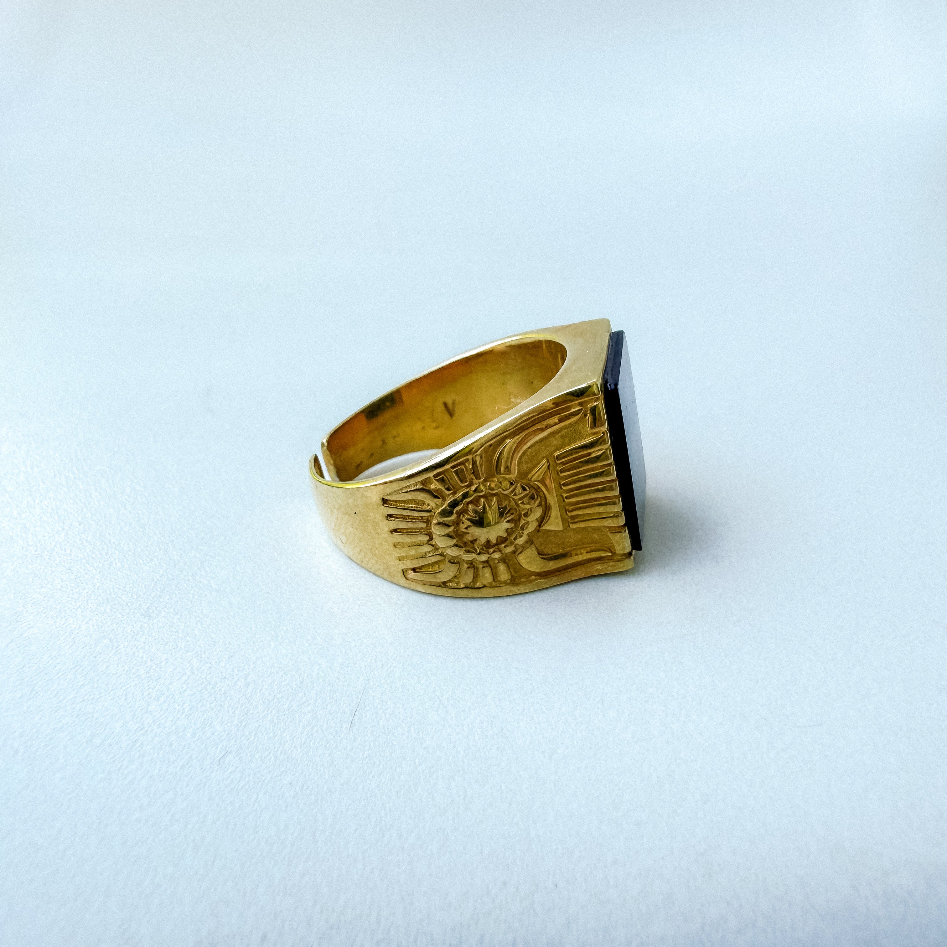 Anello uomo in Argento 925 placcato Oro 18k fatto a mano, regolabile con gemma quadrata di onice nero e ricami egizi sulla fascia.