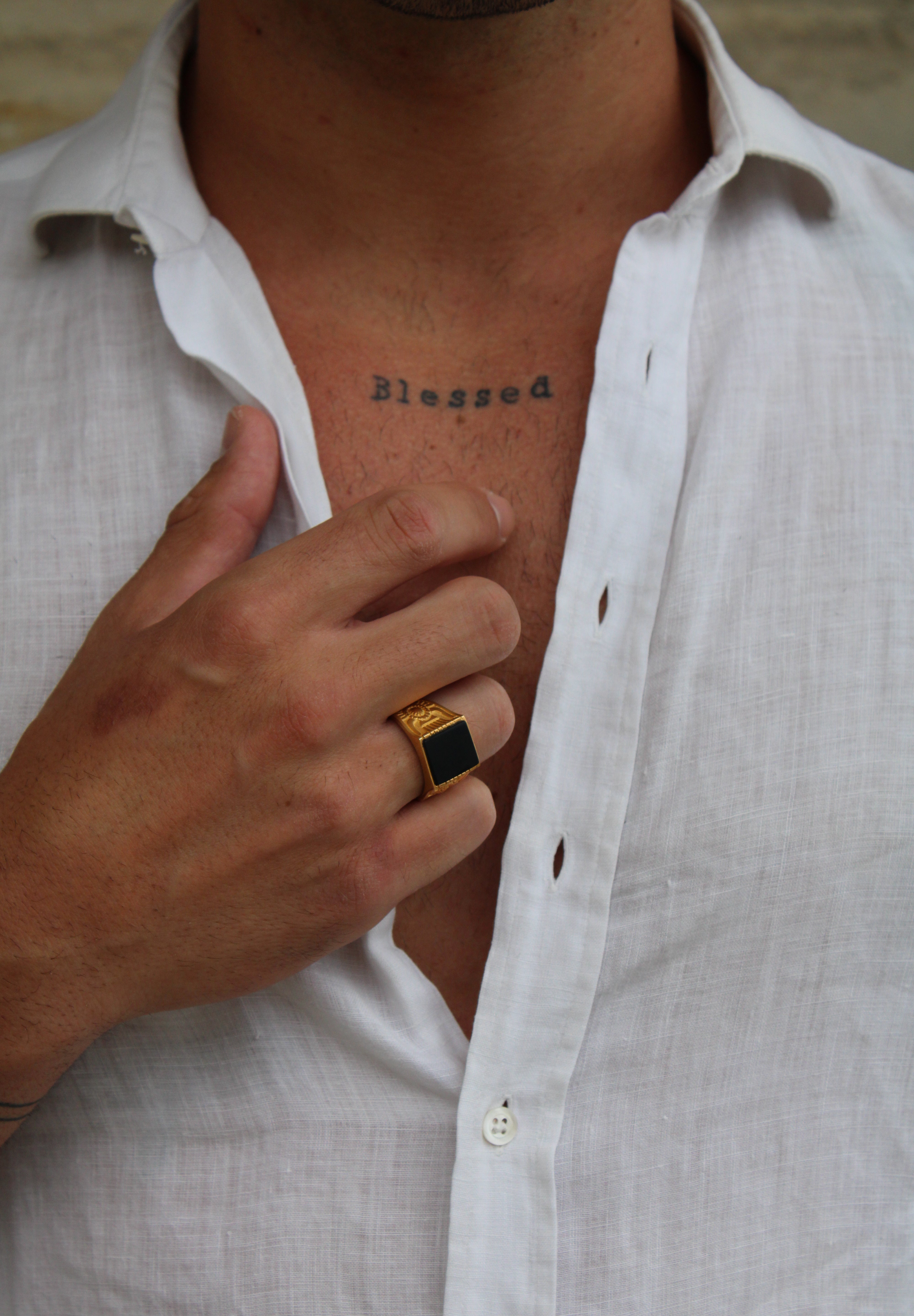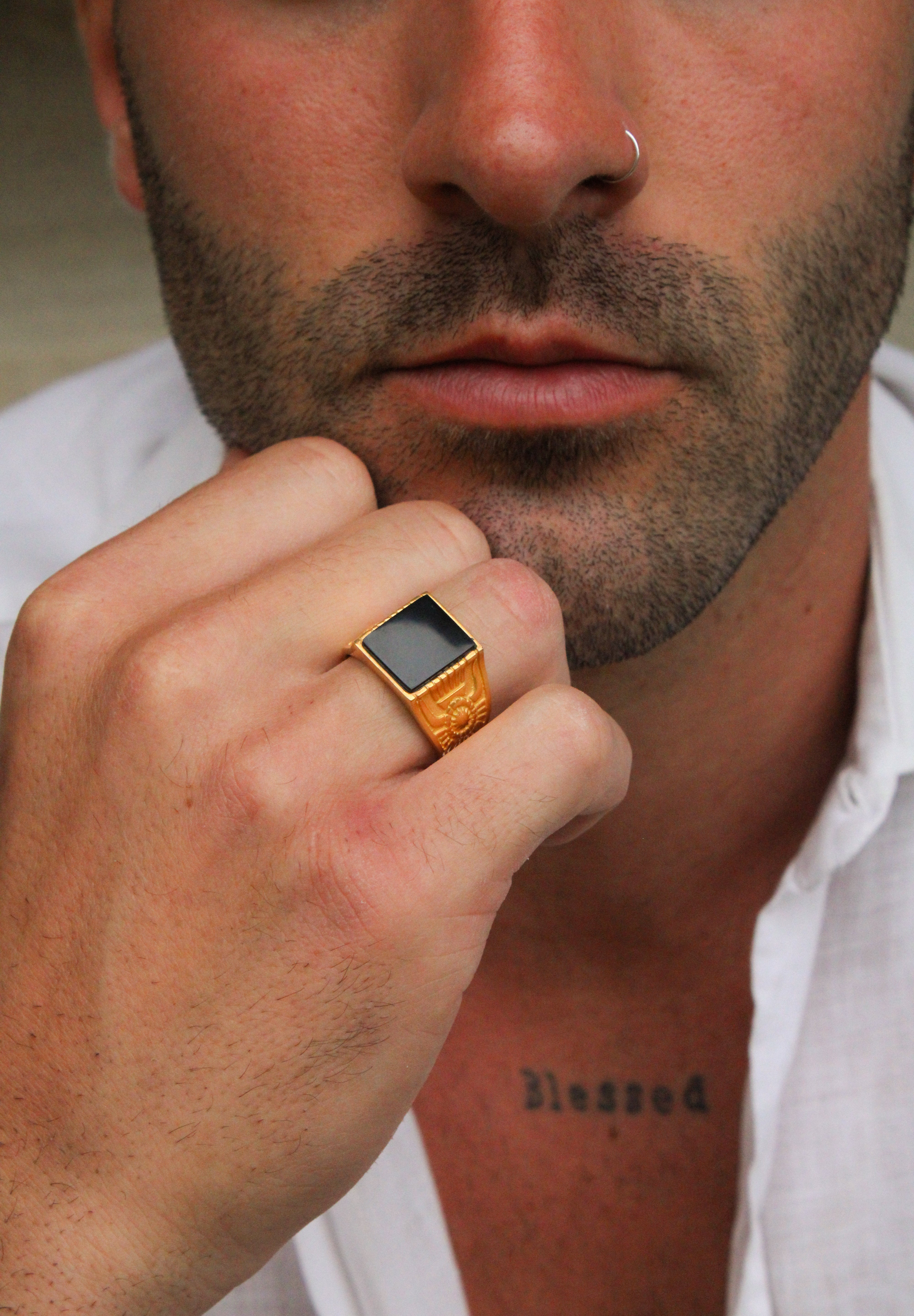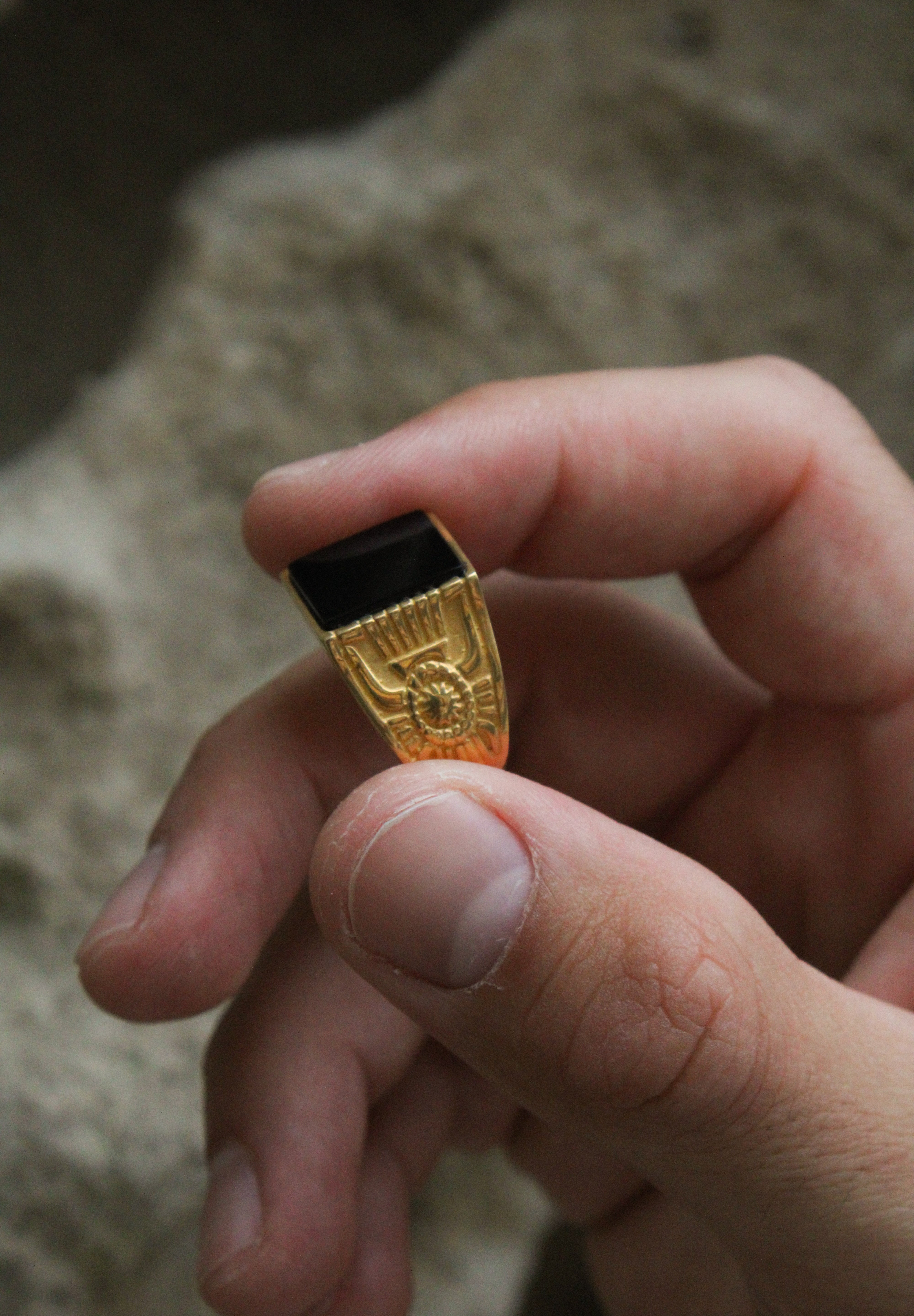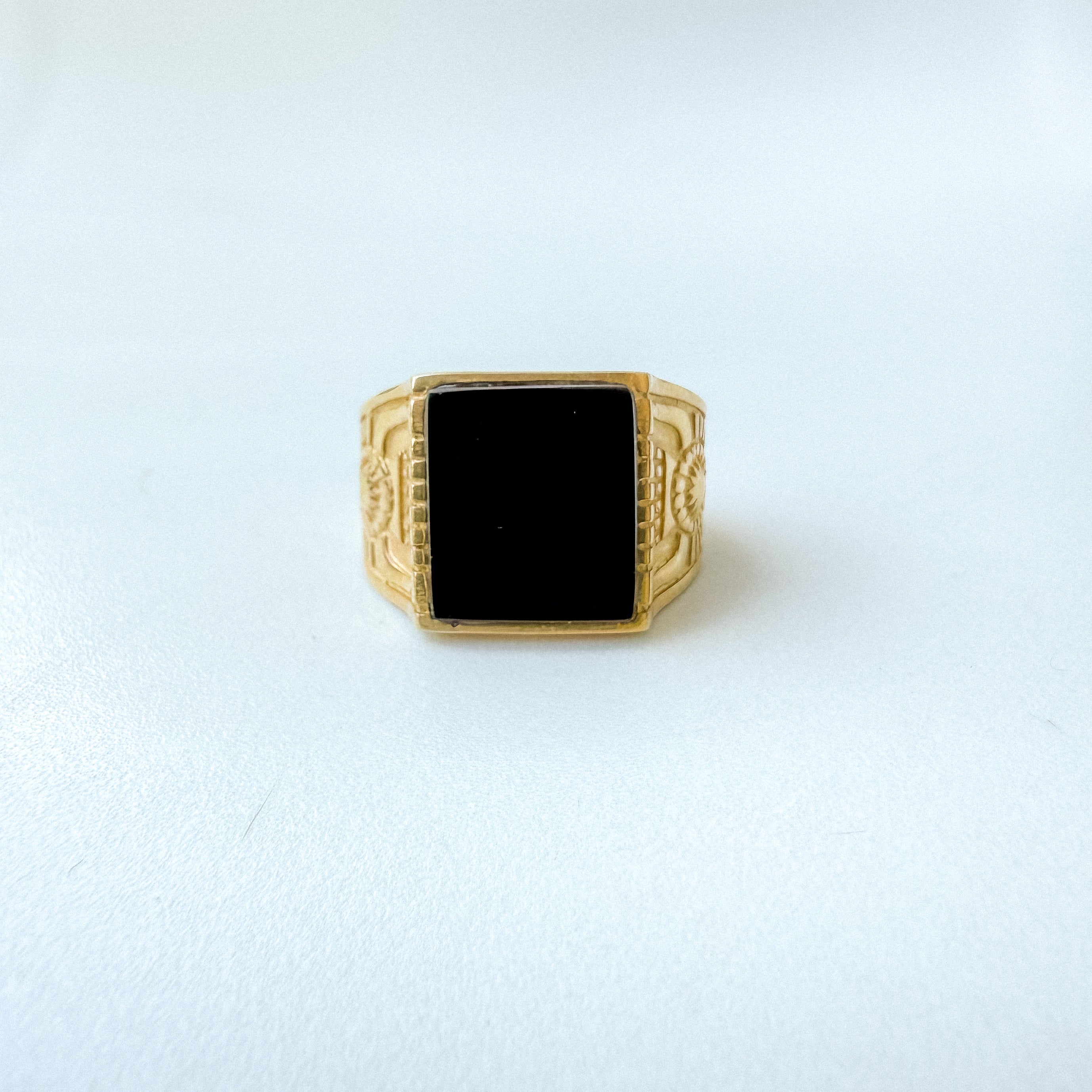 Anello uomo in Argento 925 placcato Oro 18k fatto a mano, regolabile con gemma quadrata di onice nero e ricami egizi sulla fascia.