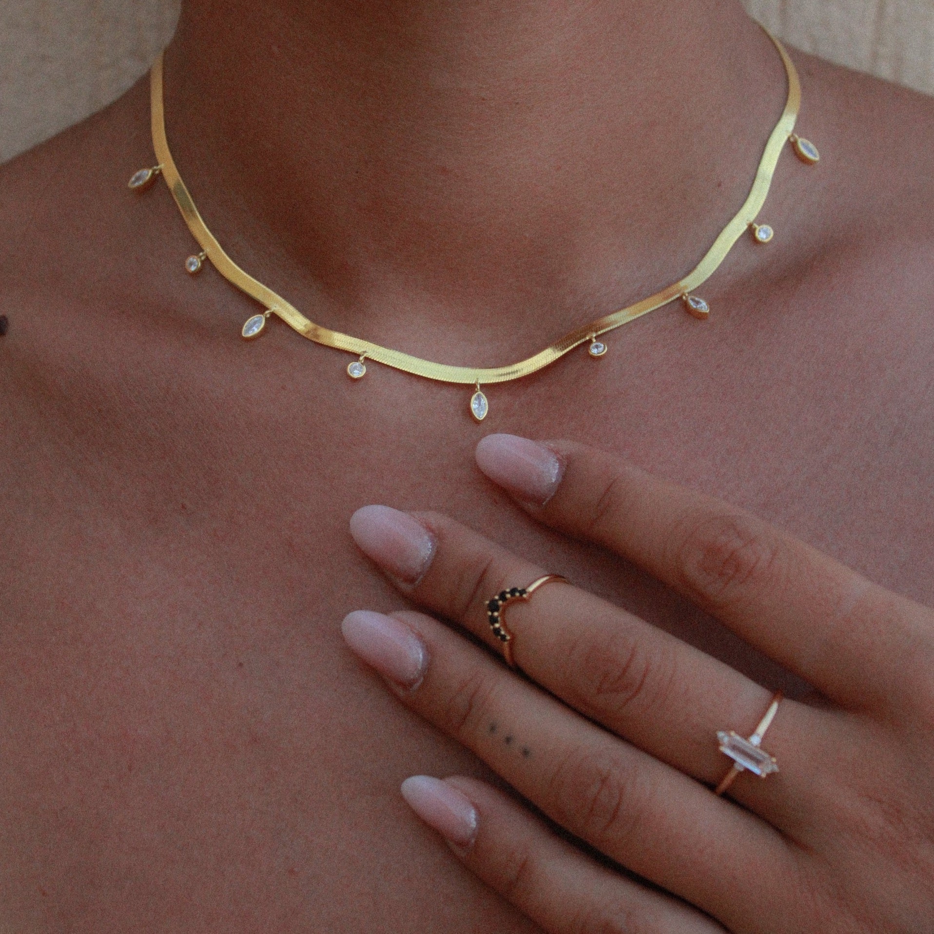 Ho voluto ispirarmi alla raffinatezza del suo stile per fare questa parure, composta da una collana shake girocollo piatta con punti luce bianchi e due anelli da mano: uno con un raffinato zircone baguette e piccoli punti luce sulla cornice e l’altro, a mezzo dito o chevalier avente una semicorona di zirconi neri che, indossati assieme, renderanno le tue mani preziose come quelle di Nefertiti.
