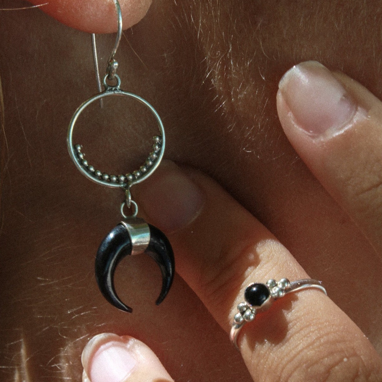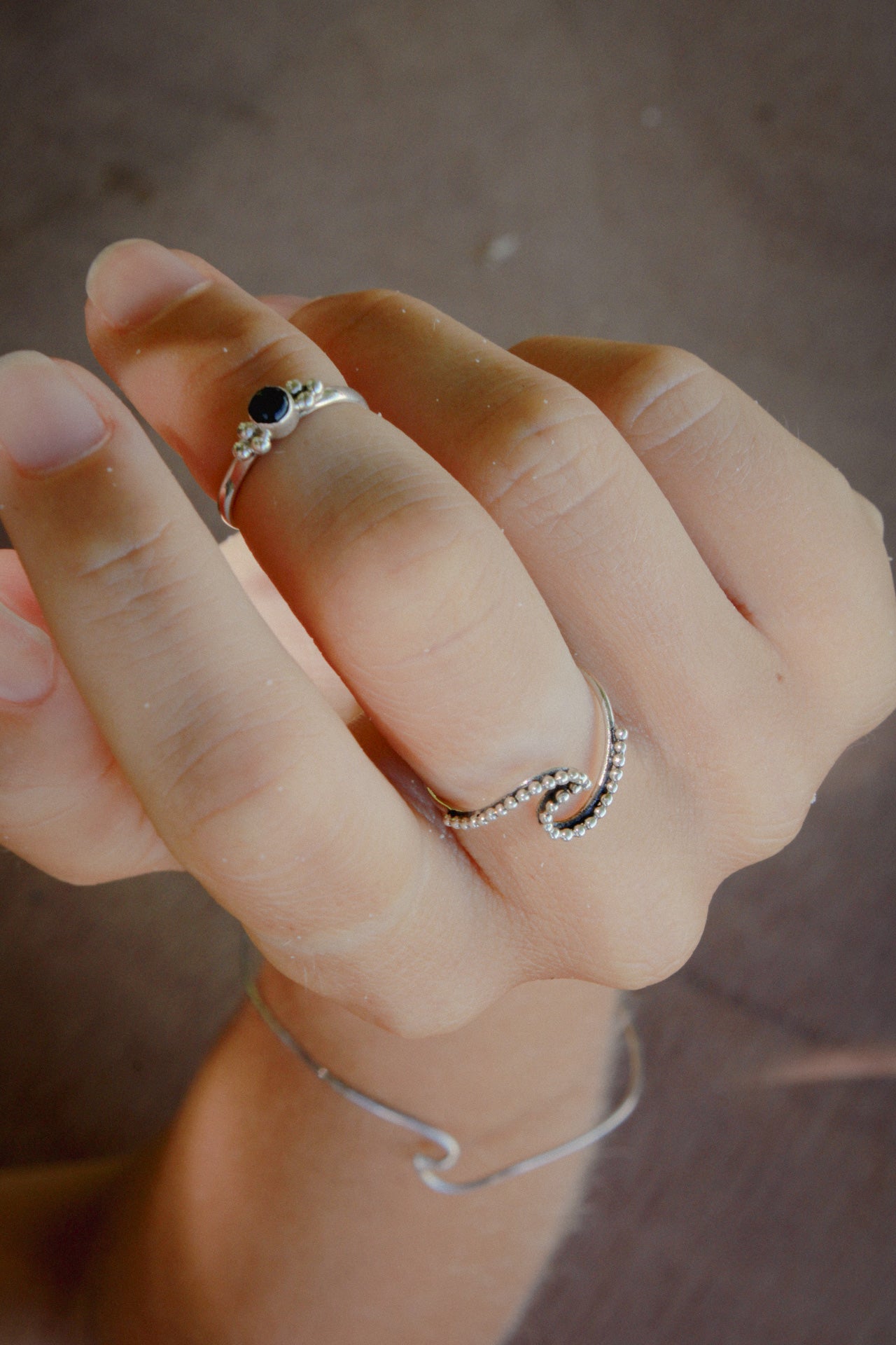 Torna protagonista l'onice nero in questa piccola gemma incastonata tra un trilogy di sfere d'argento posizionate in forma piramidale, per abbinarsi agli orecchini Ray ed arricchire le dita più piccole.
