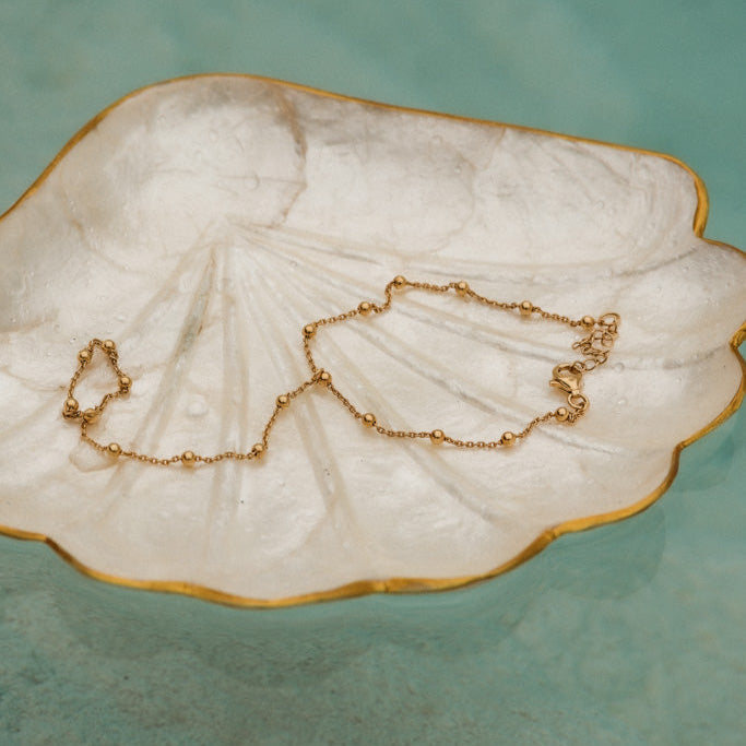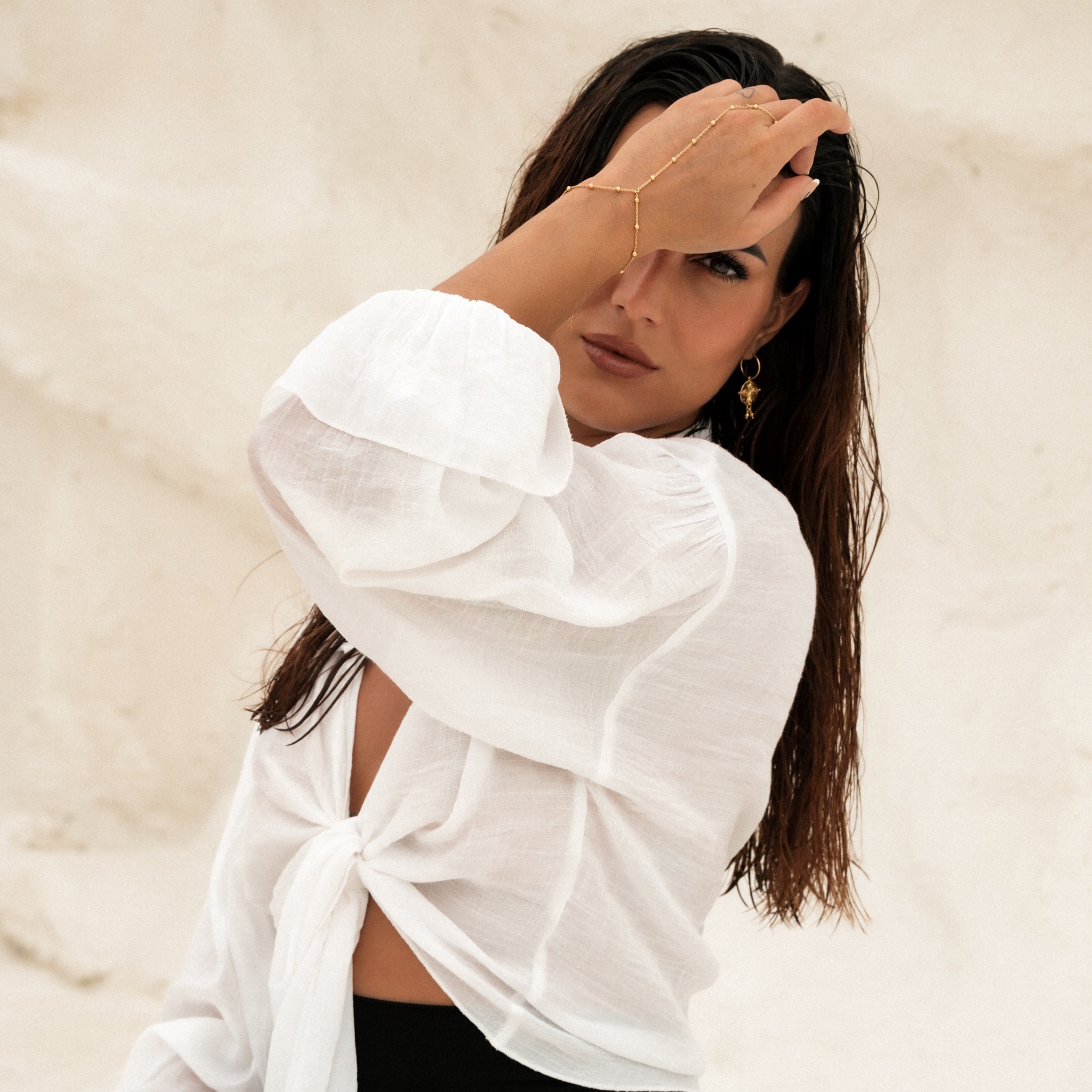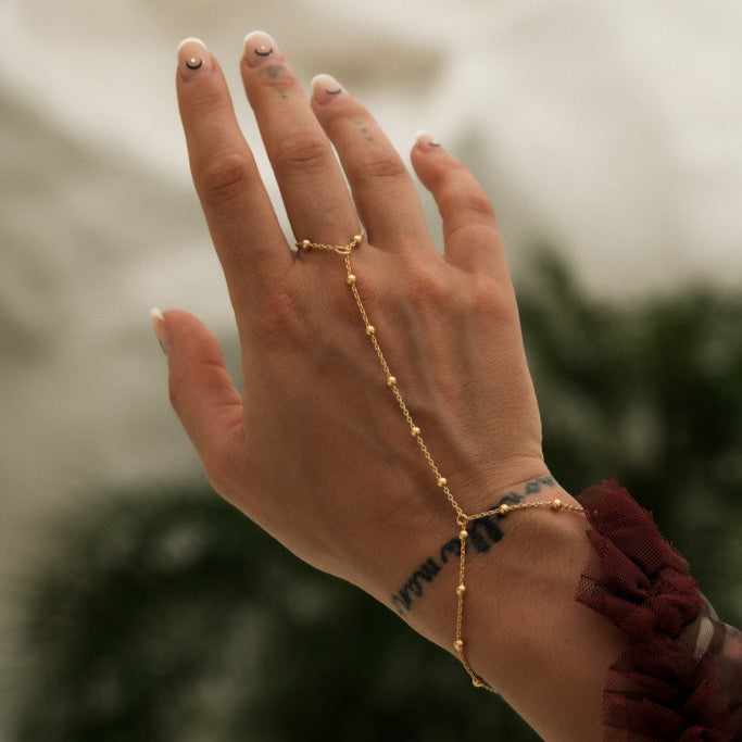 Una delicata catena dorata accarezza la mano, creando un equilibrio perfetto tra minimalismo ed eleganza. Le piccole sfere lungo la catena evocano i raggi del sole che danzano sulla pelle, rendendo questo gioiello un simbolo di luce e armonia. Perfetto per chi ama i dettagli raffinati e senza tempo.