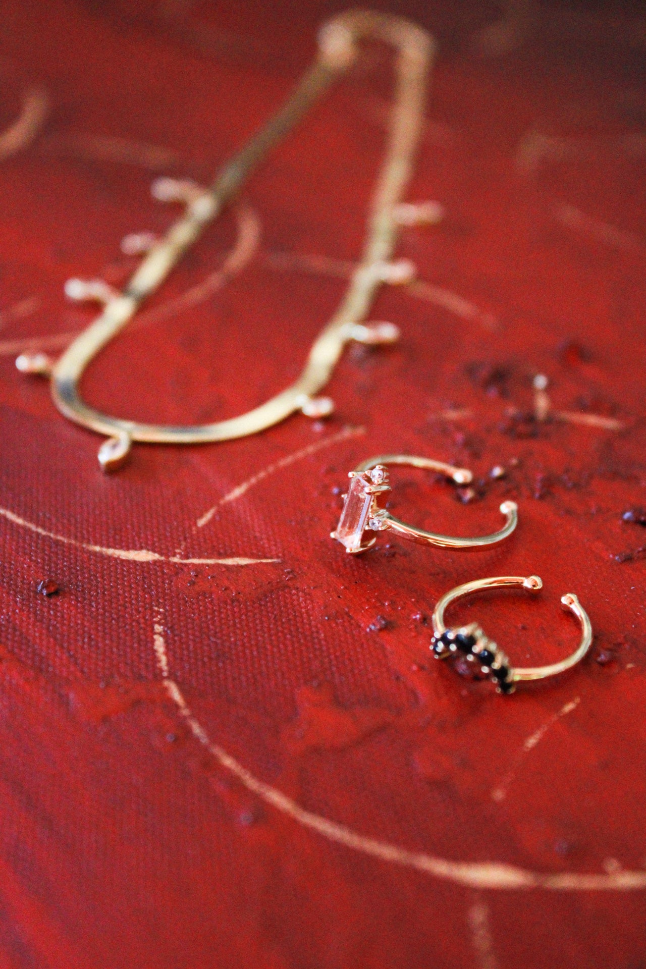 Ho voluto ispirarmi alla raffinatezza del suo stile per fare questa parure, composta da una collana shake girocollo piatta con punti luce bianchi e due anelli da mano: uno con un raffinato zircone baguette e piccoli punti luce sulla cornice e l’altro, a mezzo dito o chevalier avente una semicorona di zirconi neri che, indossati assieme, renderanno le tue mani preziose come quelle di Nefertiti.