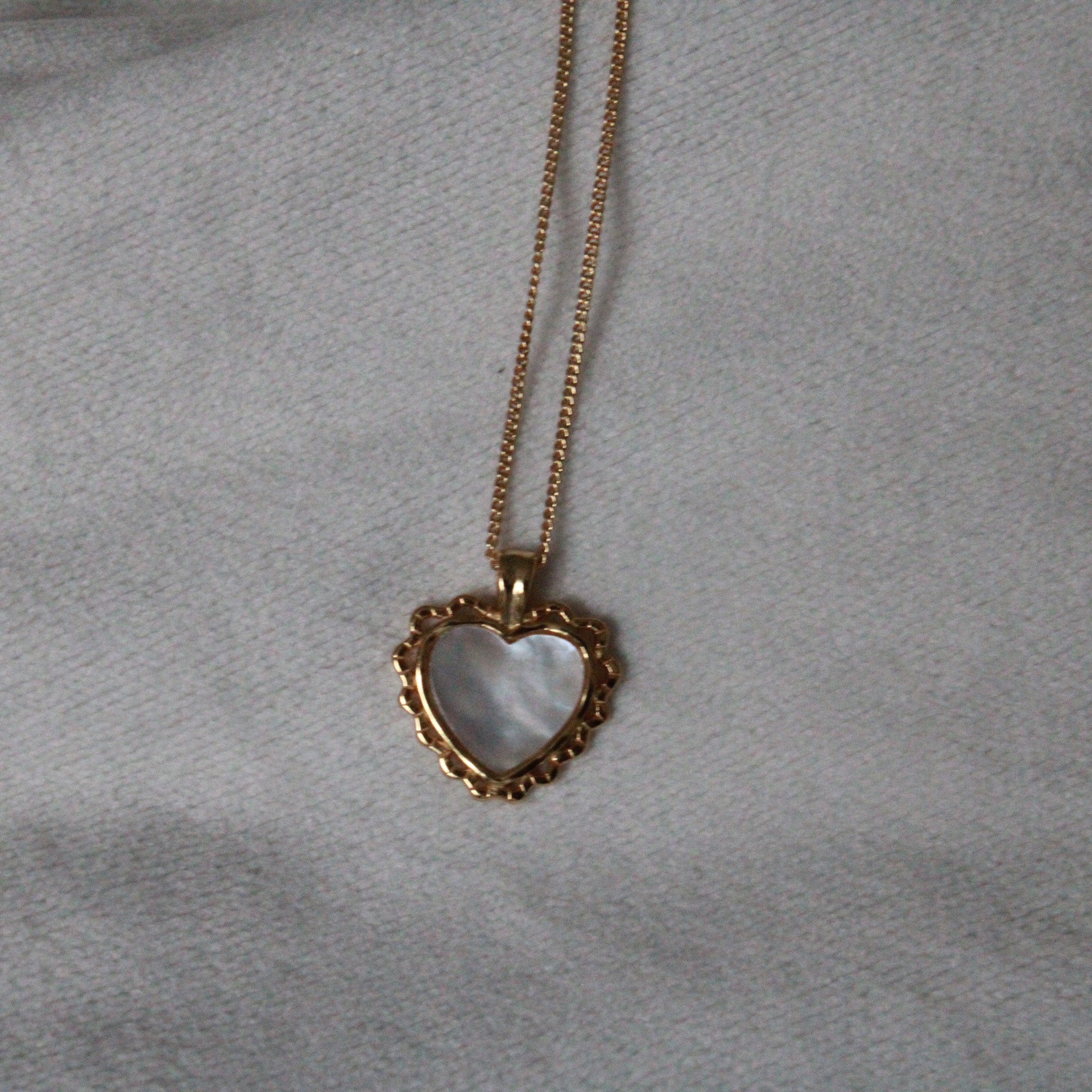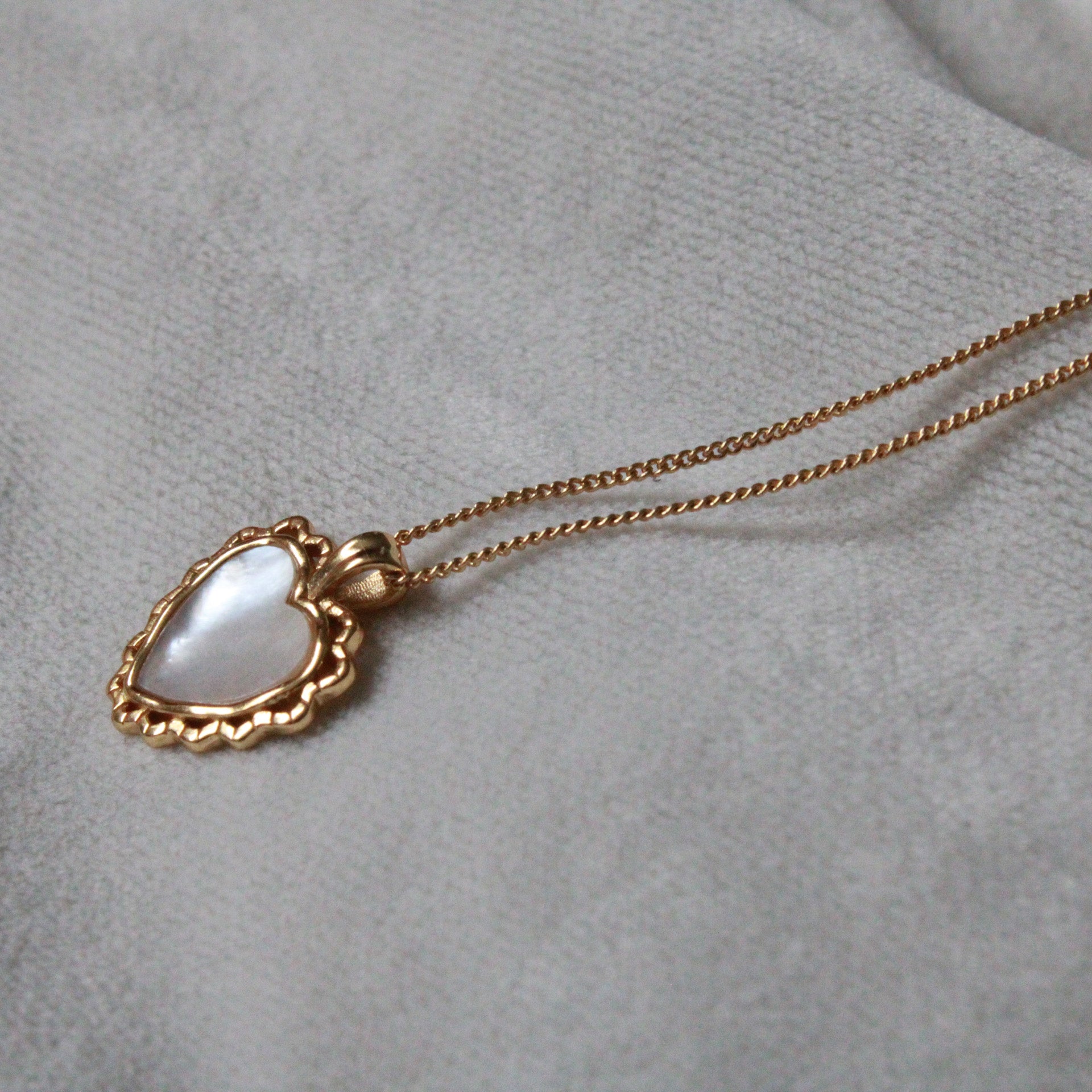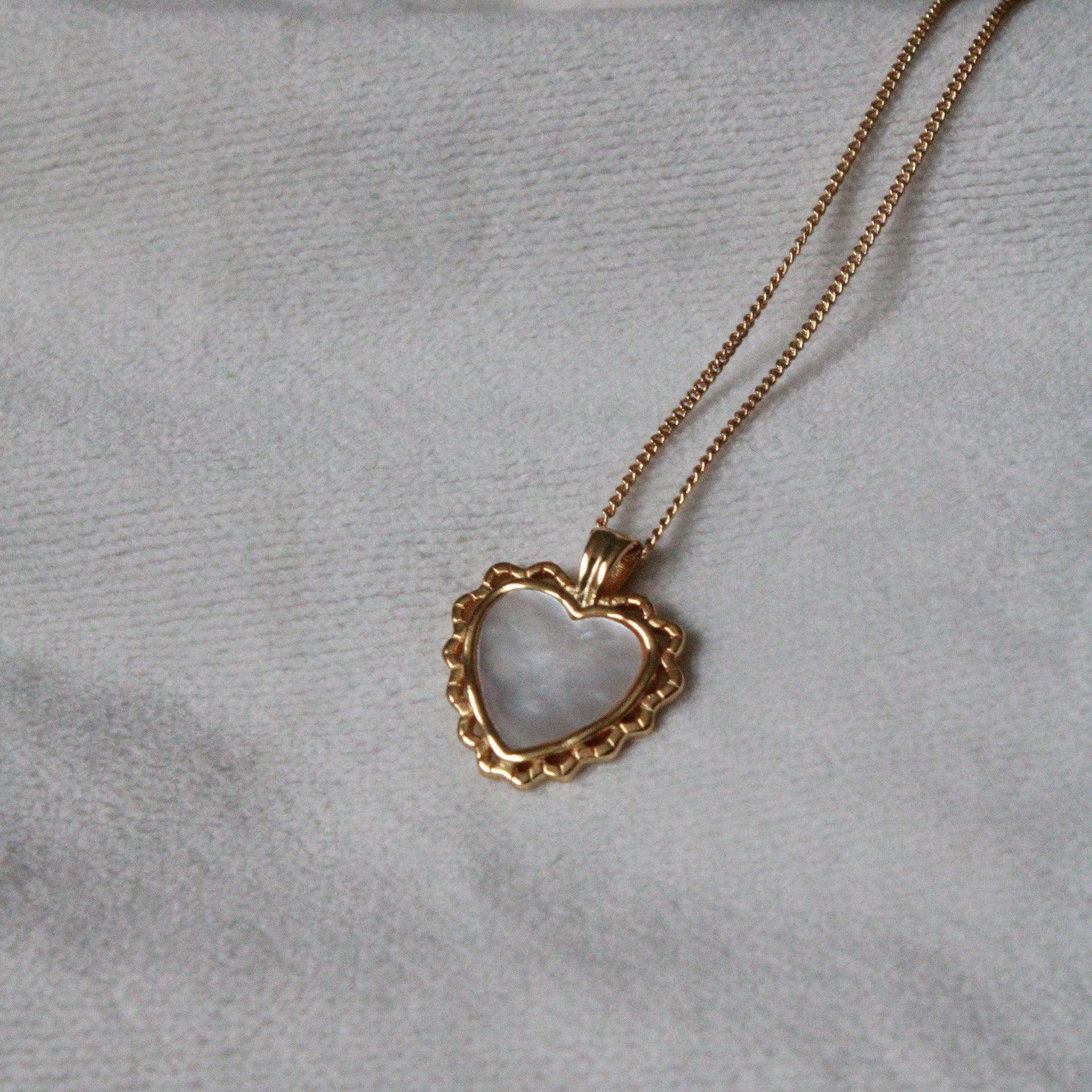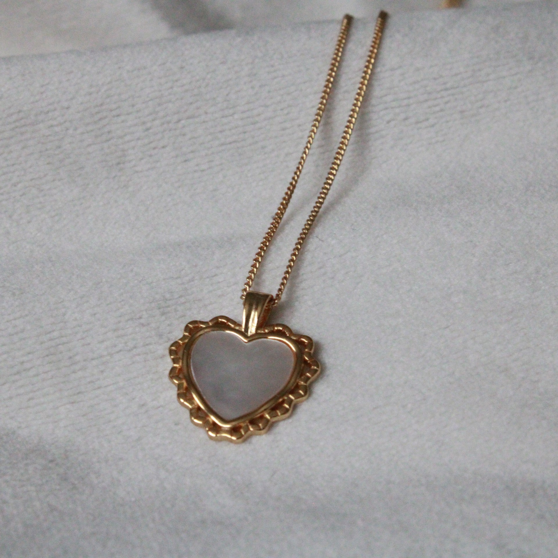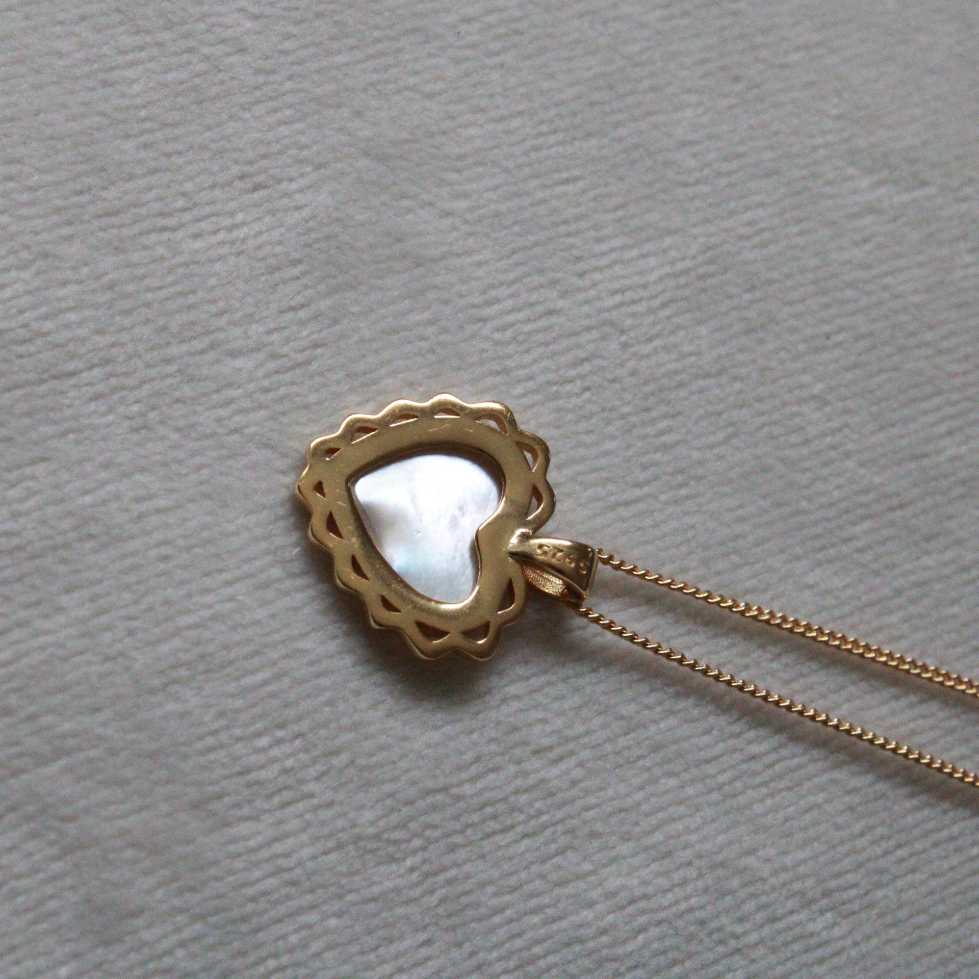 Collana in Argento 925 placcata Oro 18k con ciondolo a forma di cuore in madreperla con cornice in stile barocco.