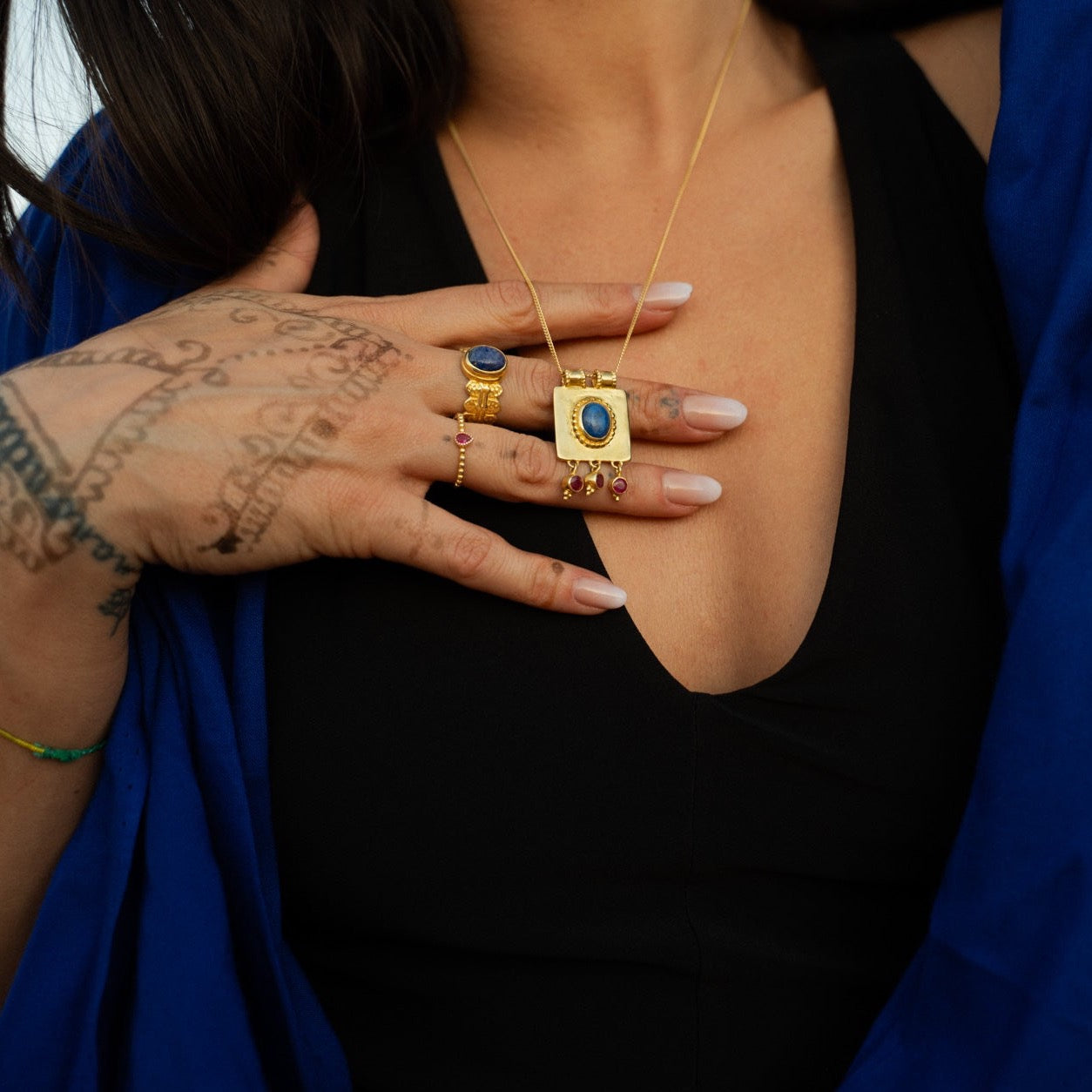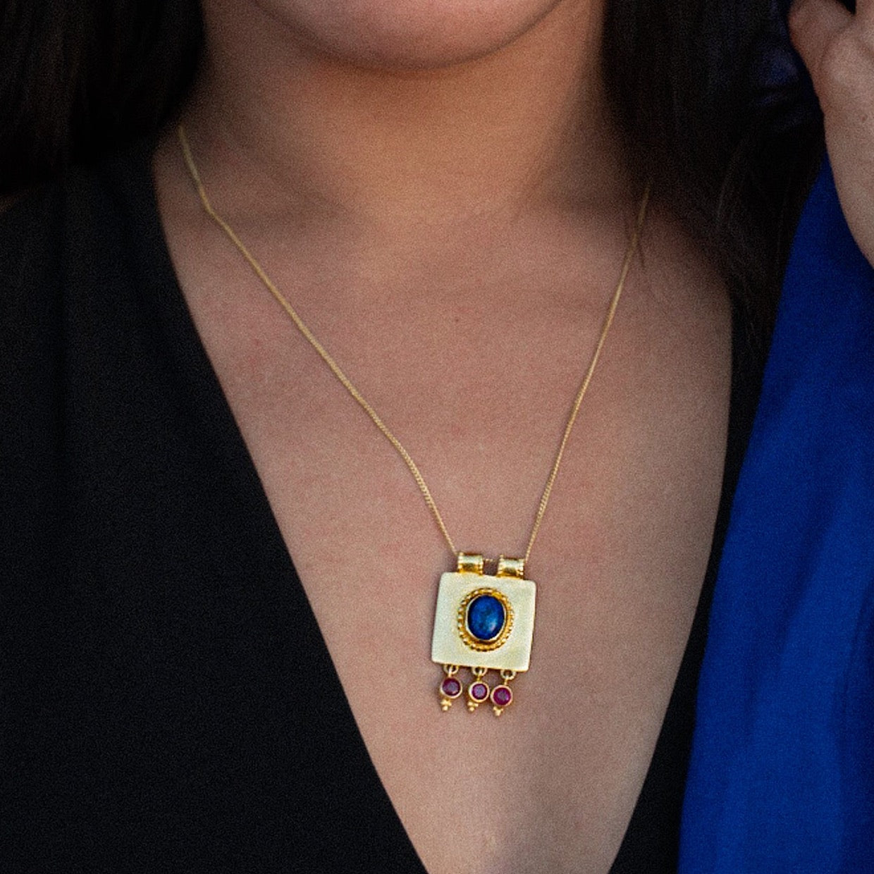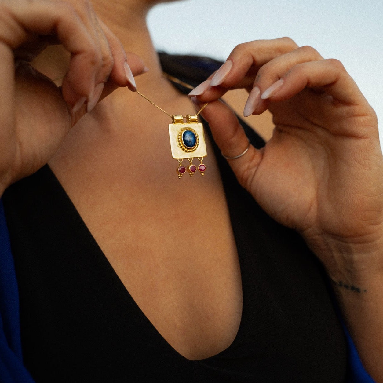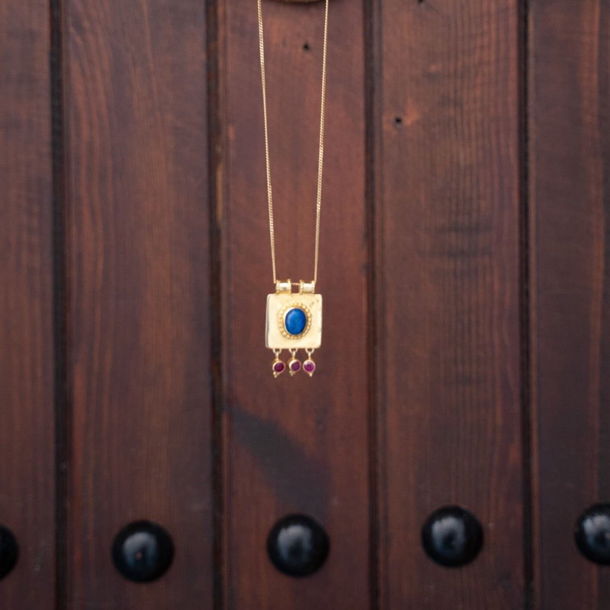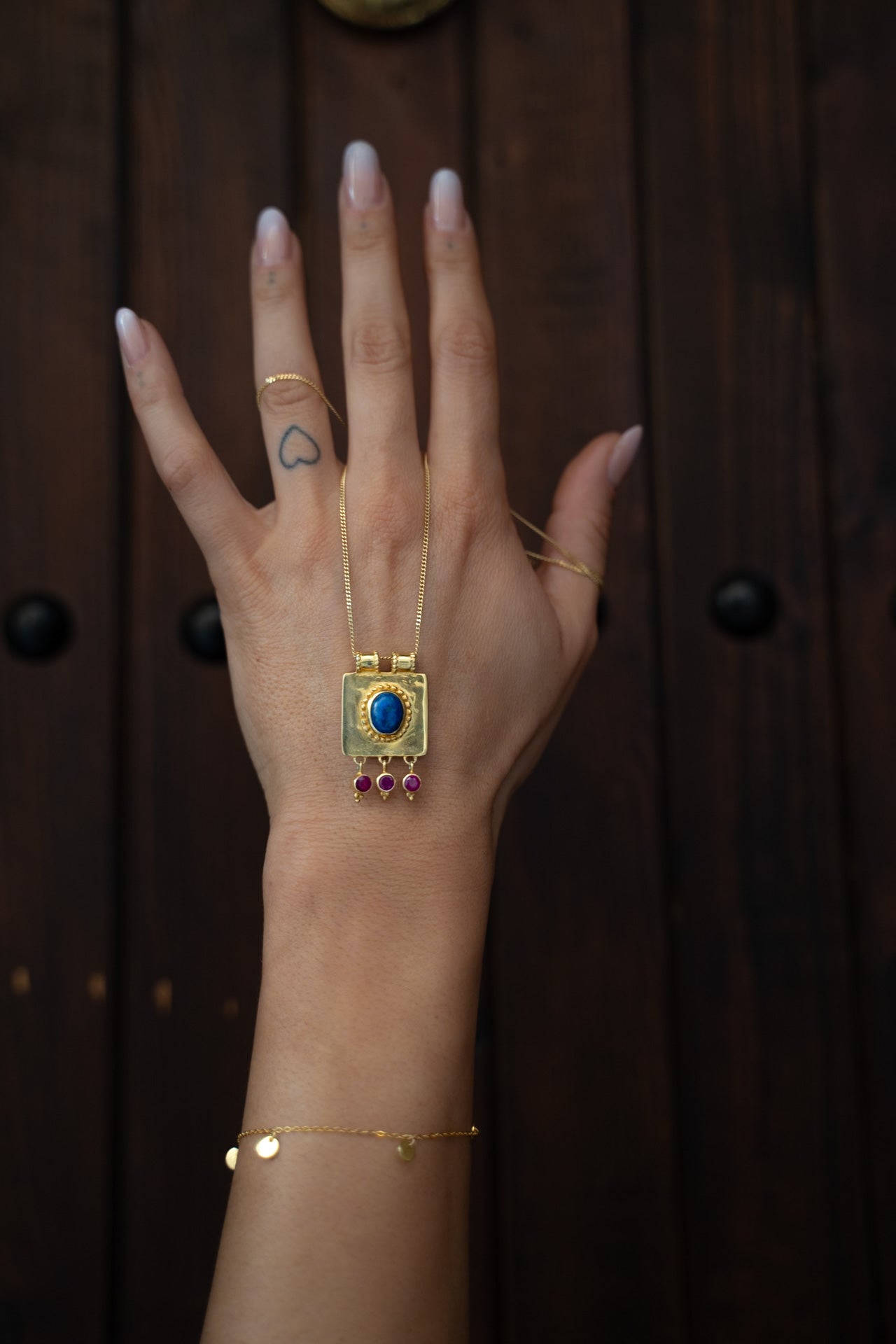 Collana in Argento S925 placcato Oro 18k con pendente quadrato con gemma di lapislazzuli e pepite di rubini.