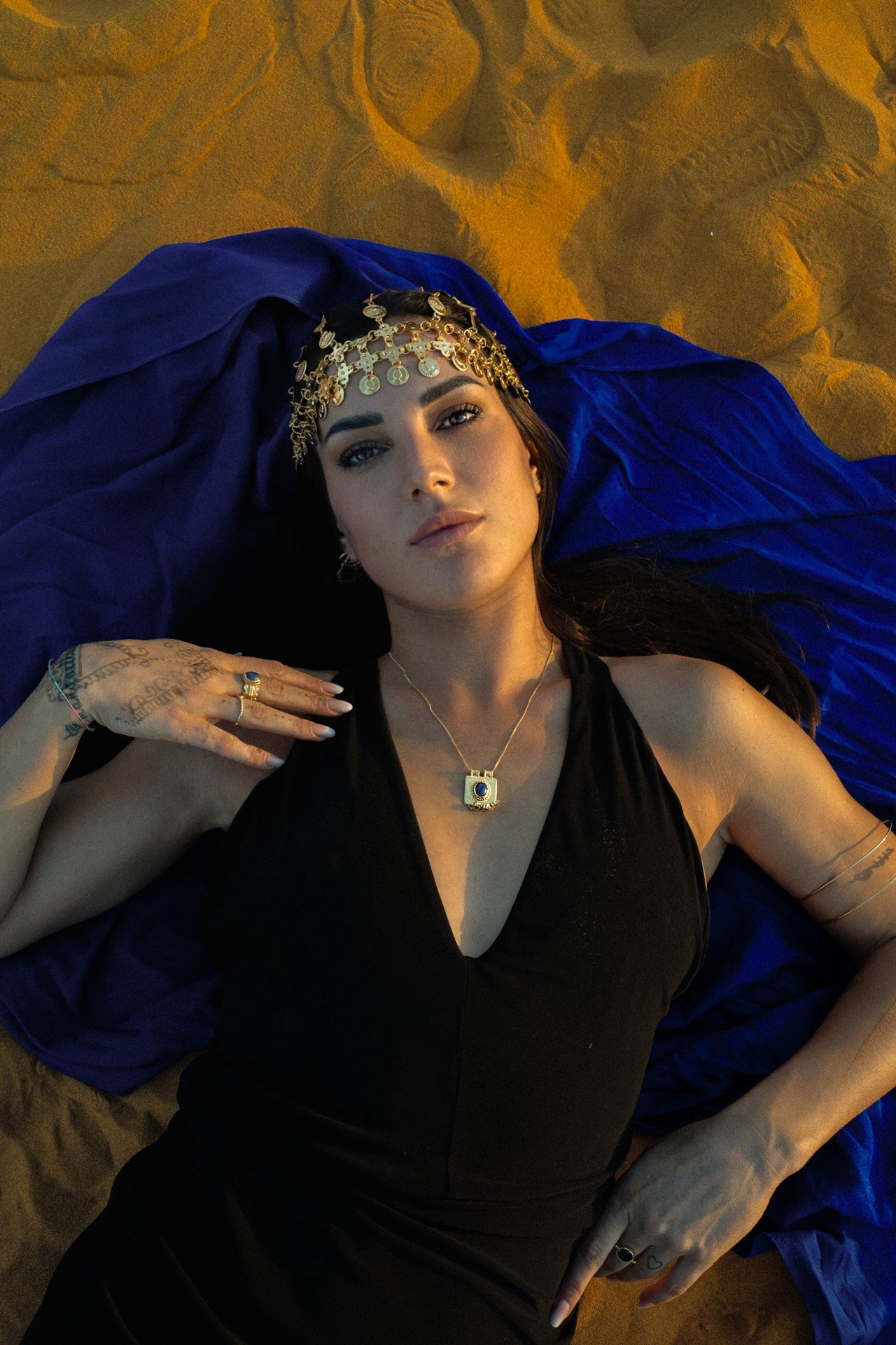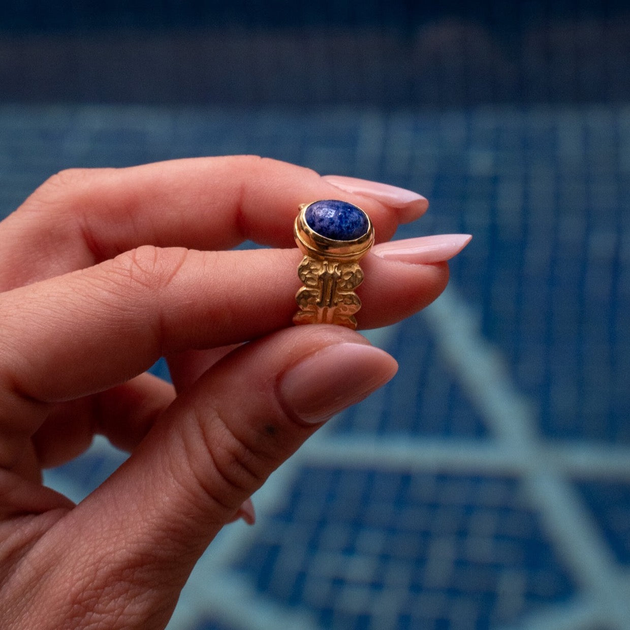 Il suo anello abbinato, richiama il medesimo frutto femminile in gemma di lapislazzulo accompagnato da una fascia larga 1cm avente forma astratta come i disegni fatti dalle tessitrici di lana.
