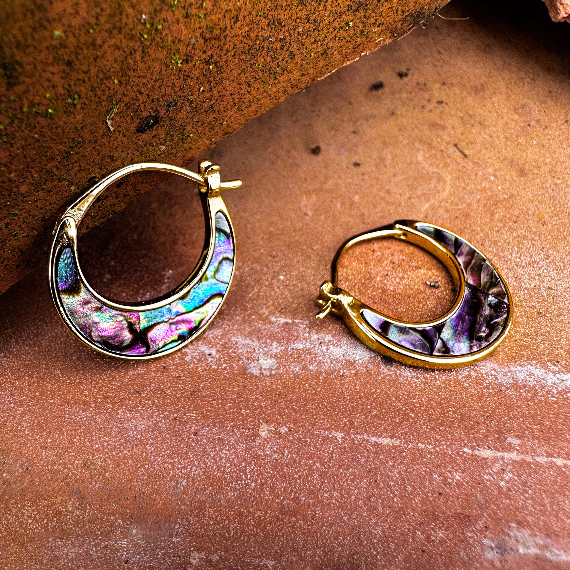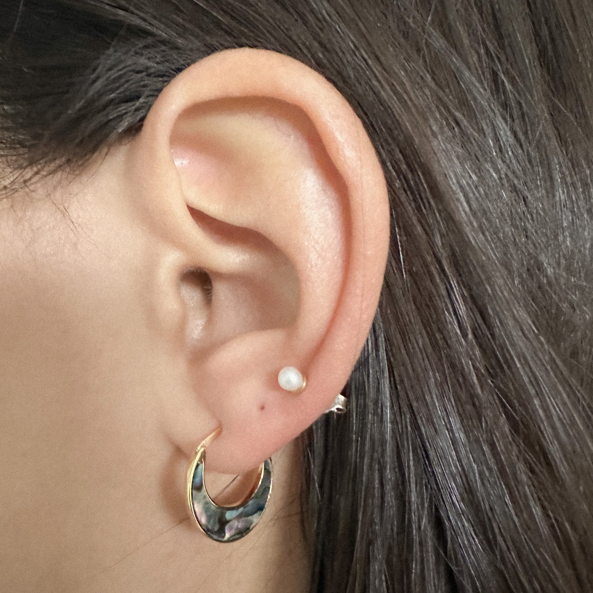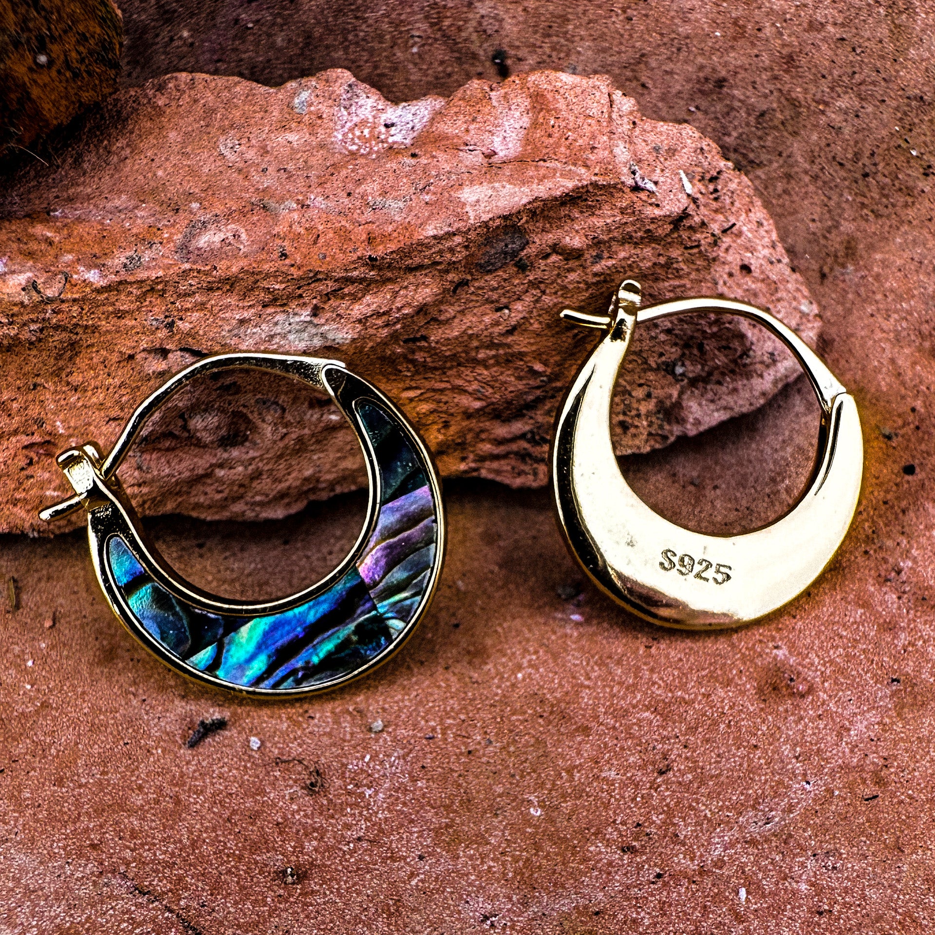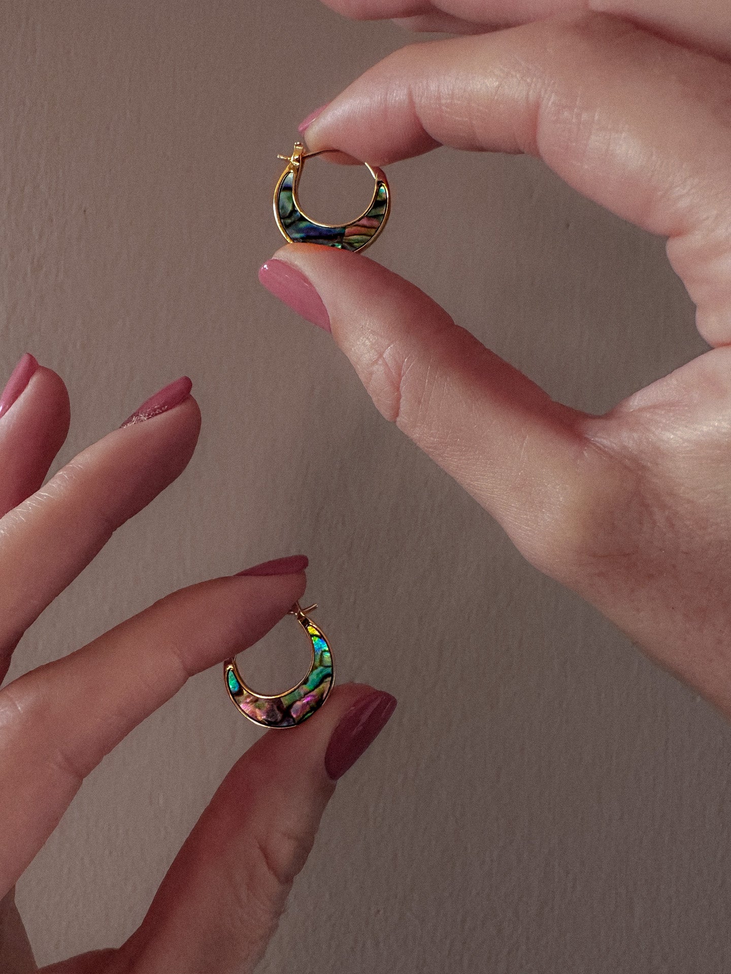 Orecchini ad anelle in Argento 925 placcato Oro 18k a forma di mezzaluna con madreperla abalone.