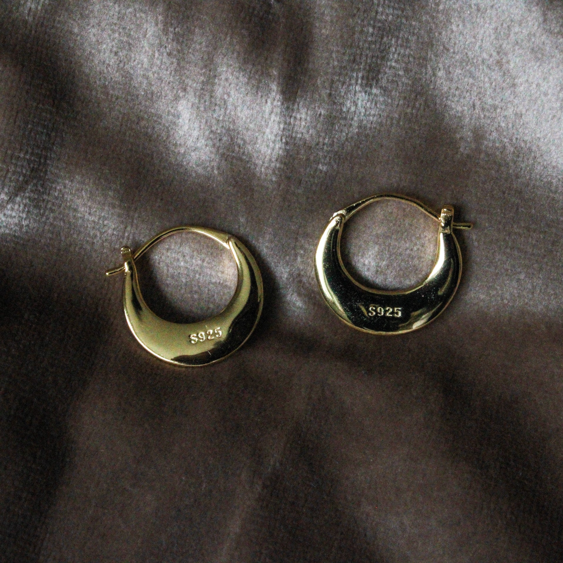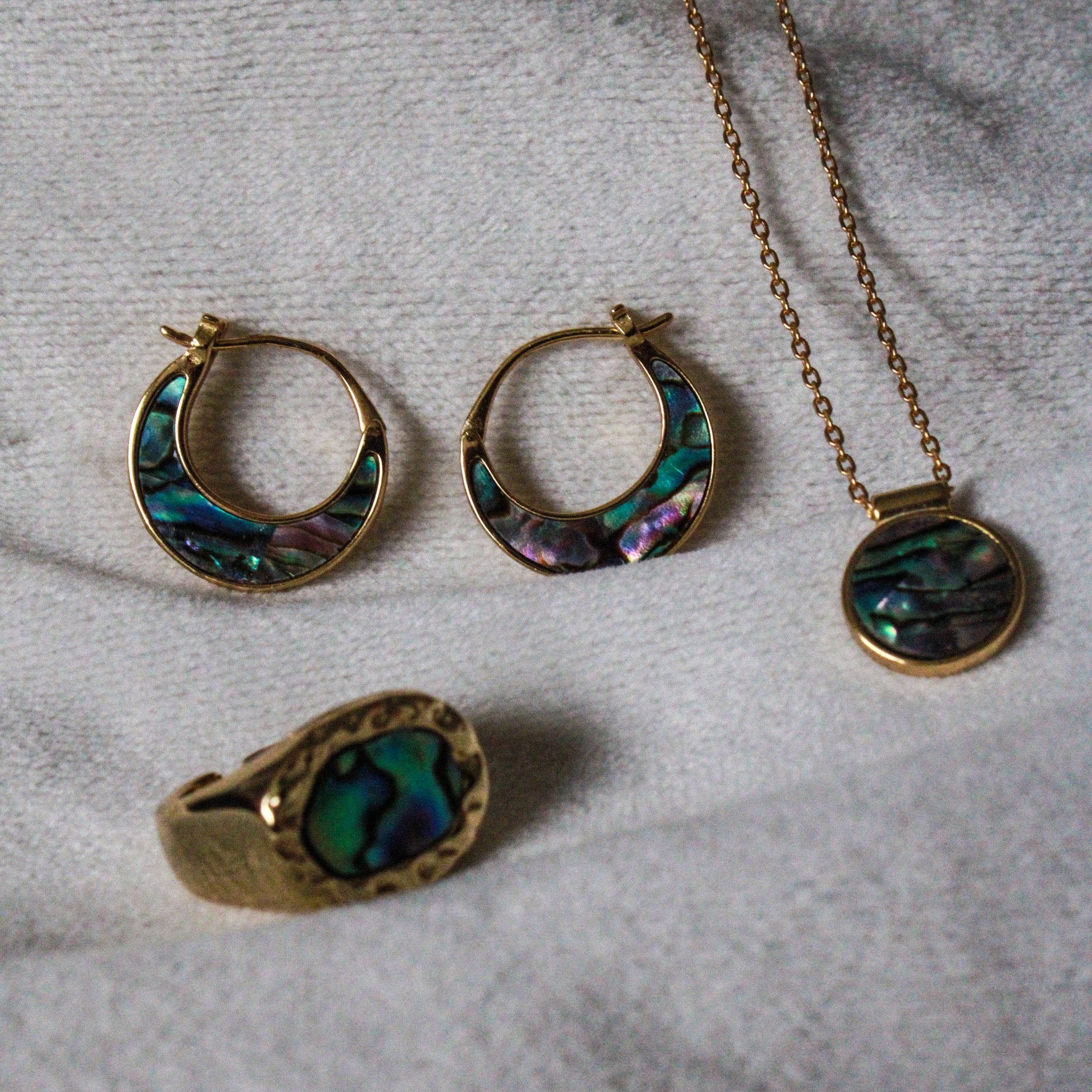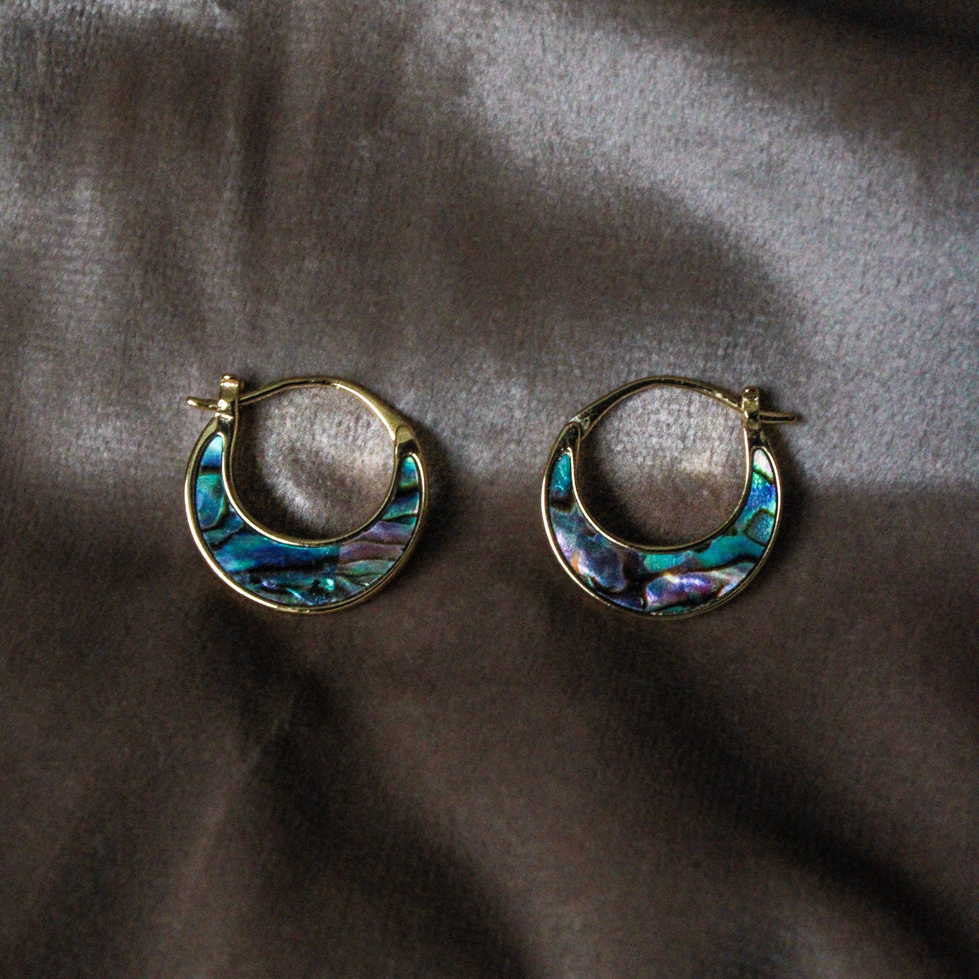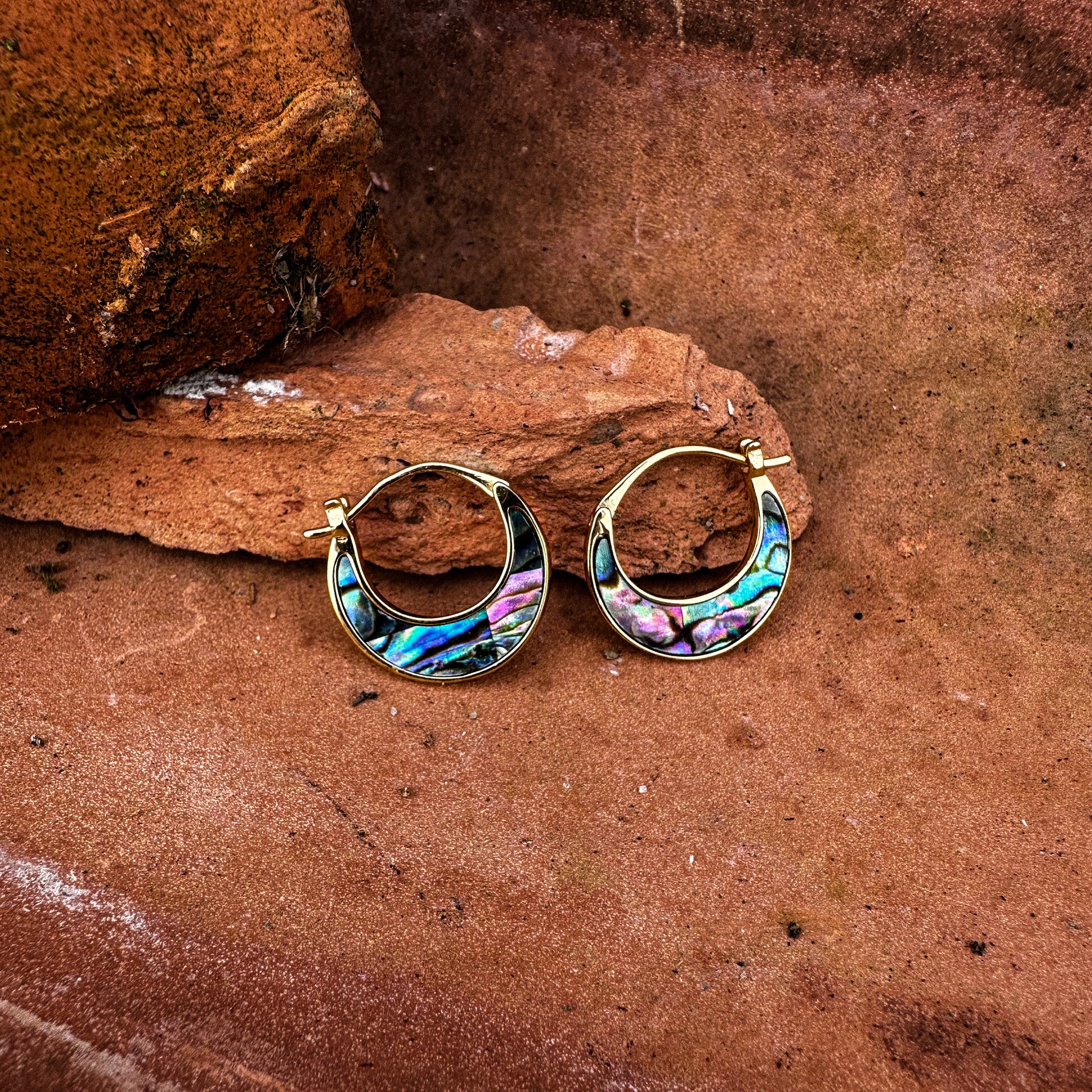 Orecchini ad anelle in Argento 925 placcato Oro 18k a forma di mezzaluna con madreperla abalone.