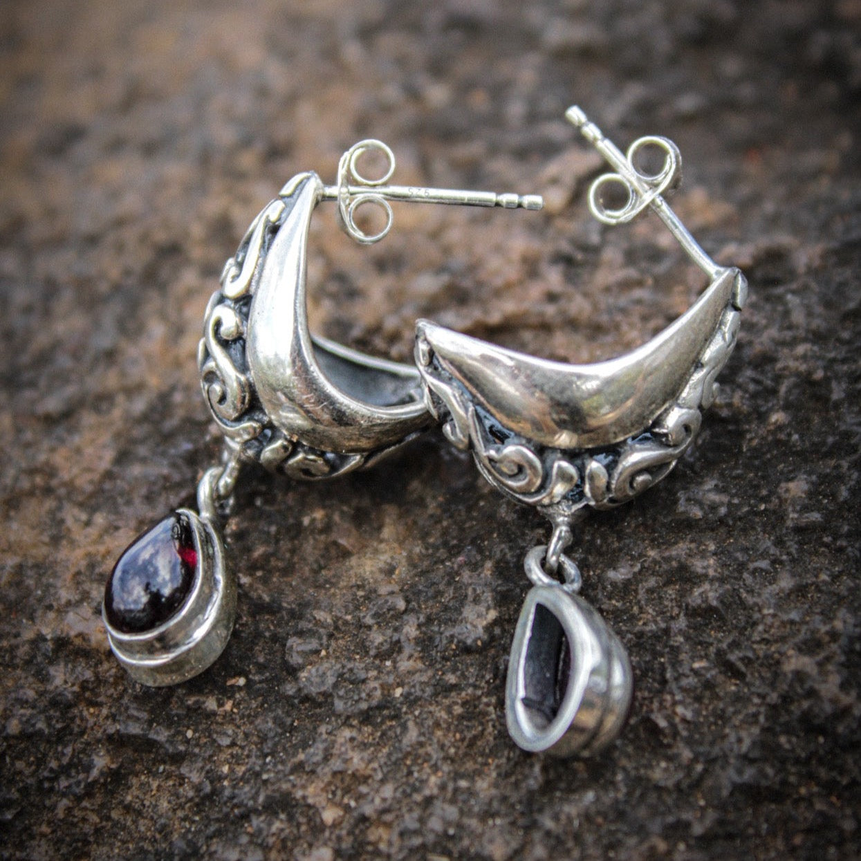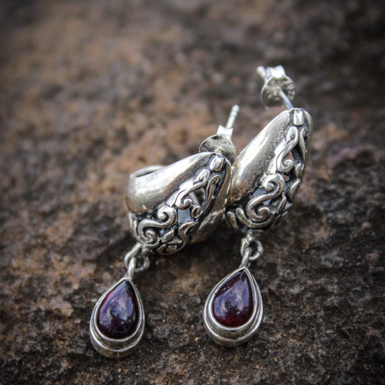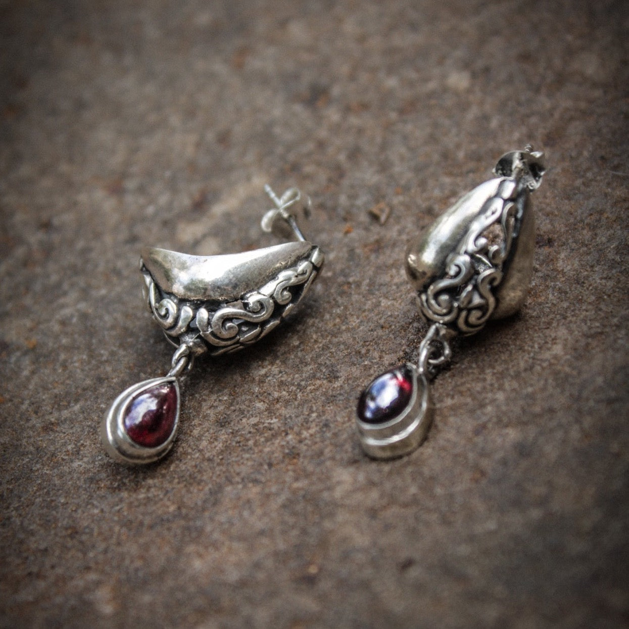Gli orecchini, con chiusura a farfallina richiamano lo stile a goccia sia legata al soprannome dello Sri Lanka (lacrima appunto) sia alla forma dei più iconici orecchini in voga quest’anno. Ho aggiunto un ulteriore ciondolo mobile, attaccato alla base, sempre contenente una gemma di granato di 0,4mm a forma di goccia.