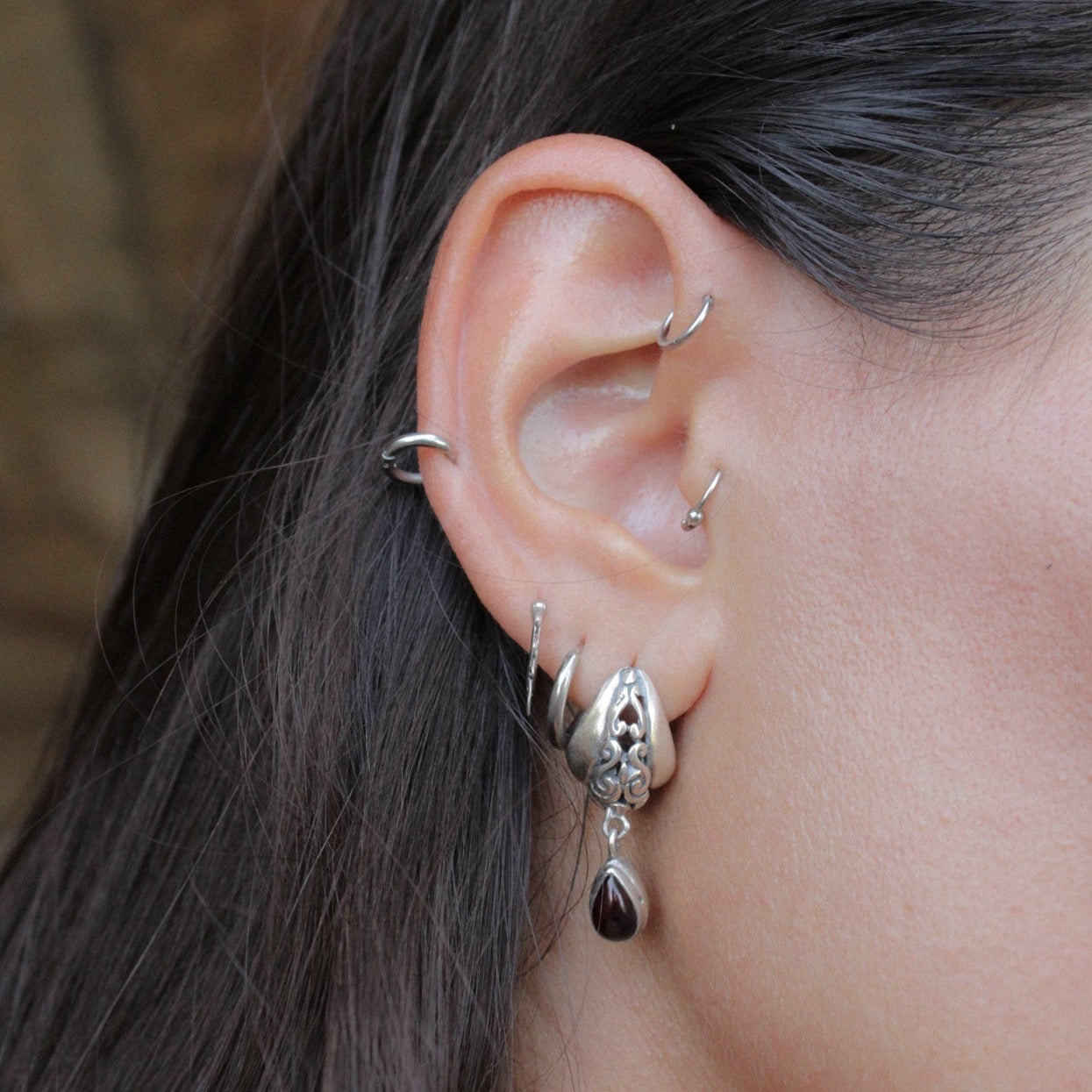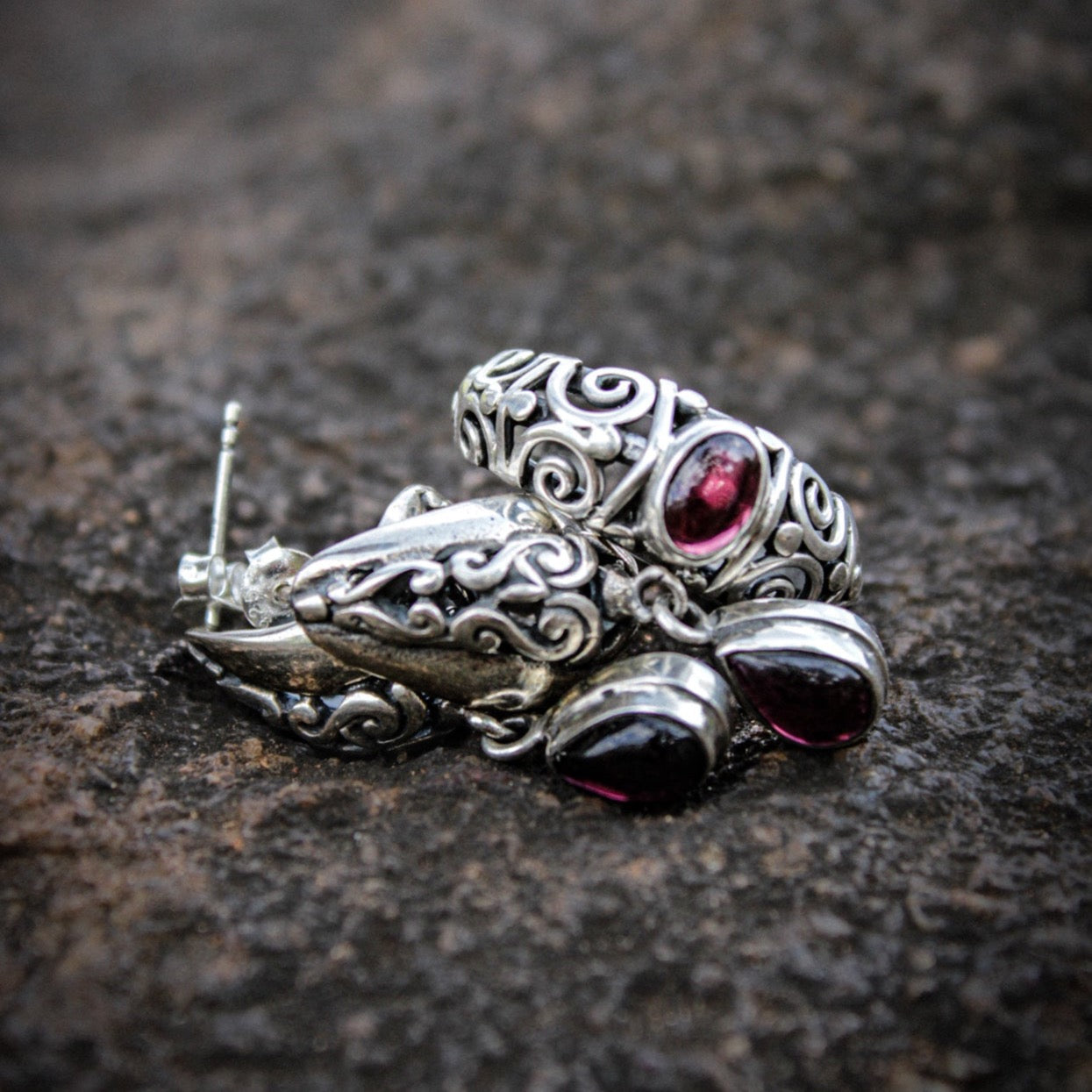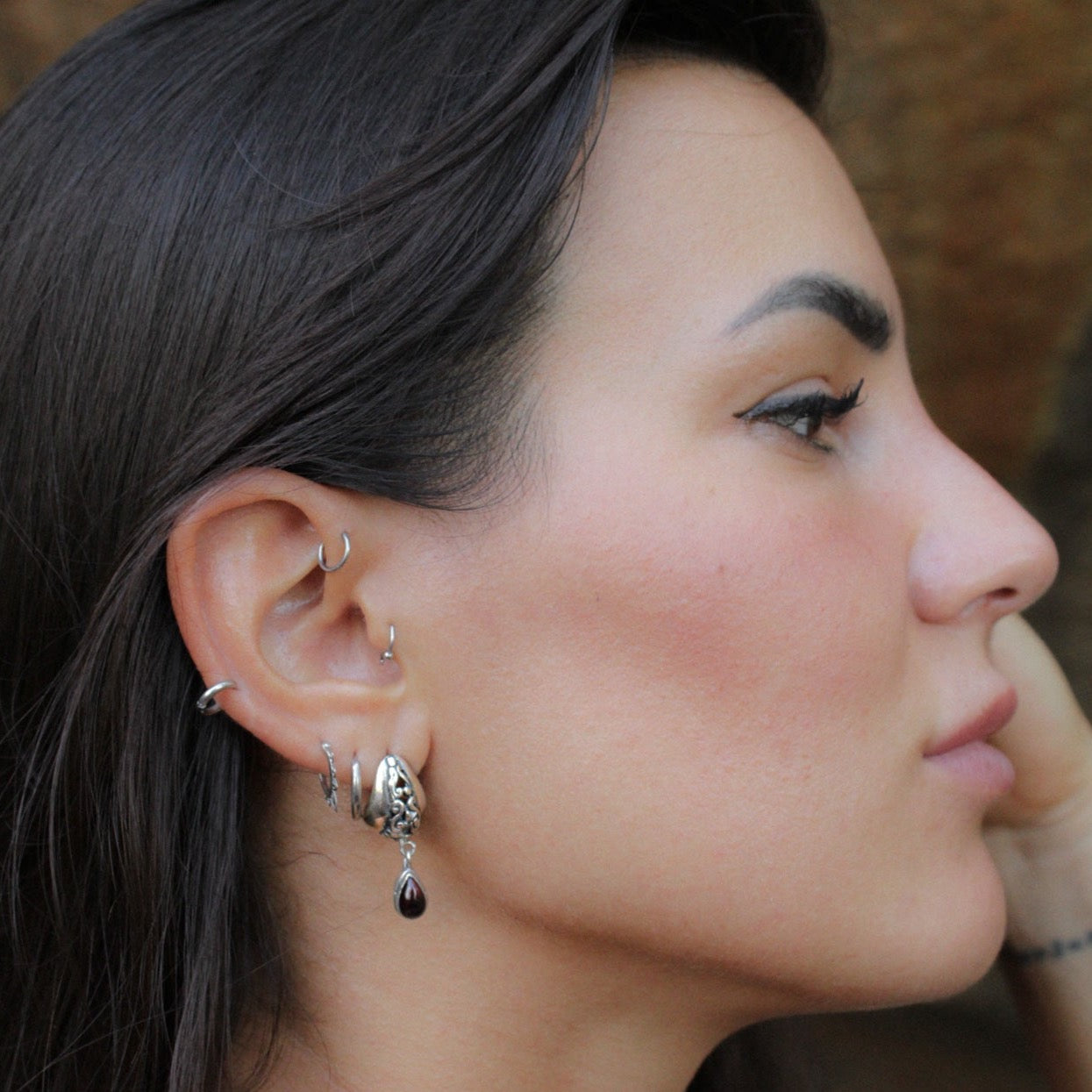 Gli orecchini, con chiusura a farfallina richiamano lo stile a goccia sia legata al soprannome dello Sri Lanka (lacrima appunto) sia alla forma dei più iconici orecchini in voga quest’anno. Ho aggiunto un ulteriore ciondolo mobile, attaccato alla base, sempre contenente una gemma di granato di 0,4mm a forma di goccia.