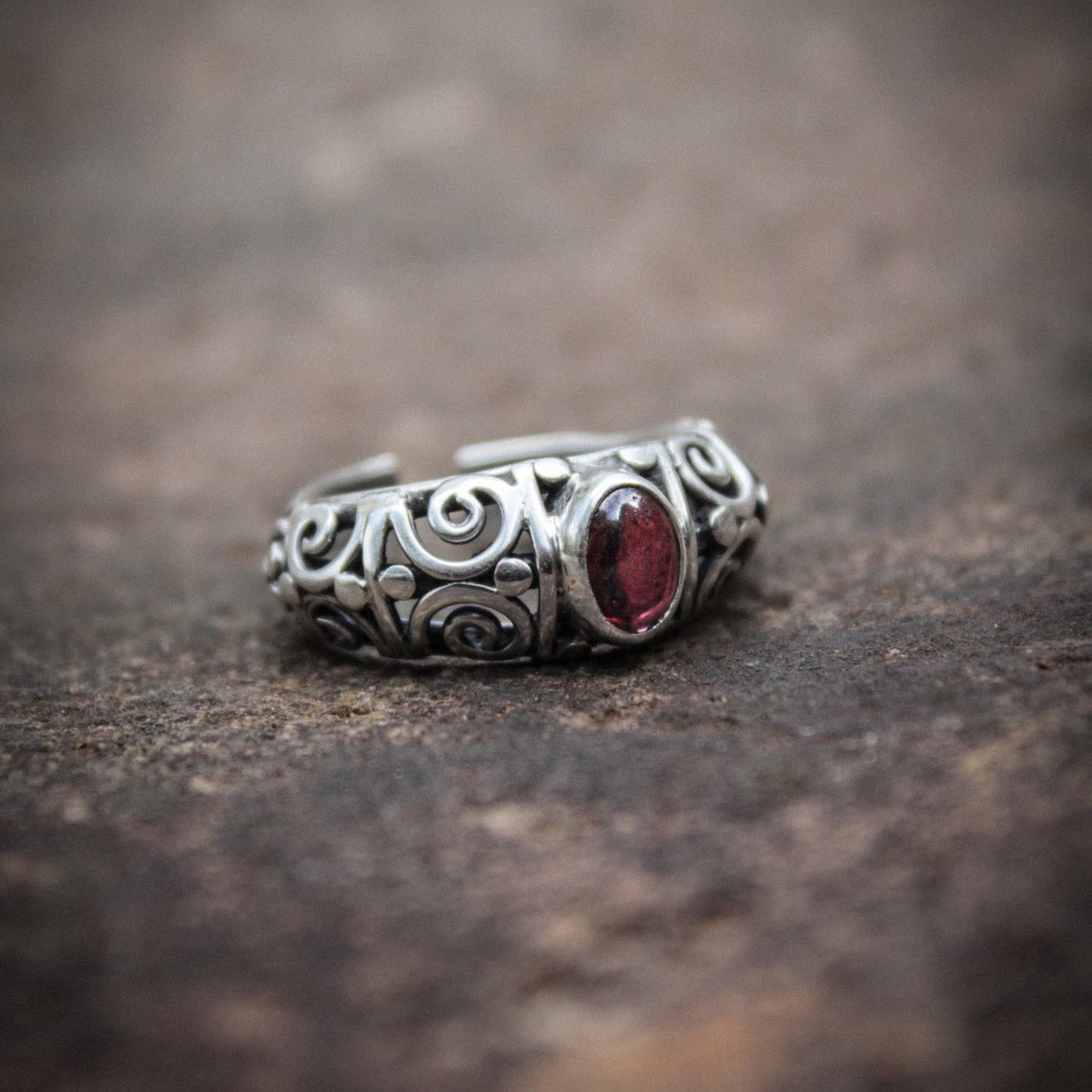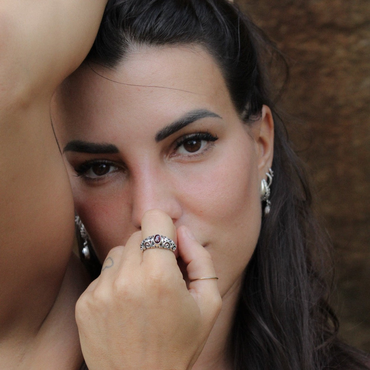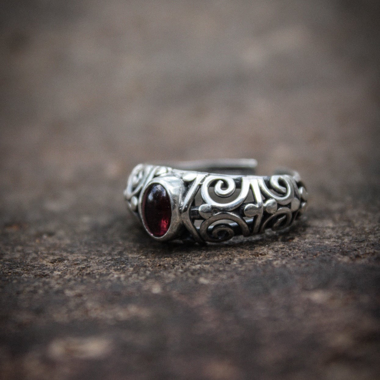 L’anello ha una fascia cava intagliata ma sufficientemente larga da renderlo molto resistente alla regolazione di taglia. Una gemma ovale di granato lunga 0,4 mm incastonata al centro amplifica l’effetto vintage dello stile annerito dovuto alla tecnica di ossidazione utilizzato su tutto il gioiello.