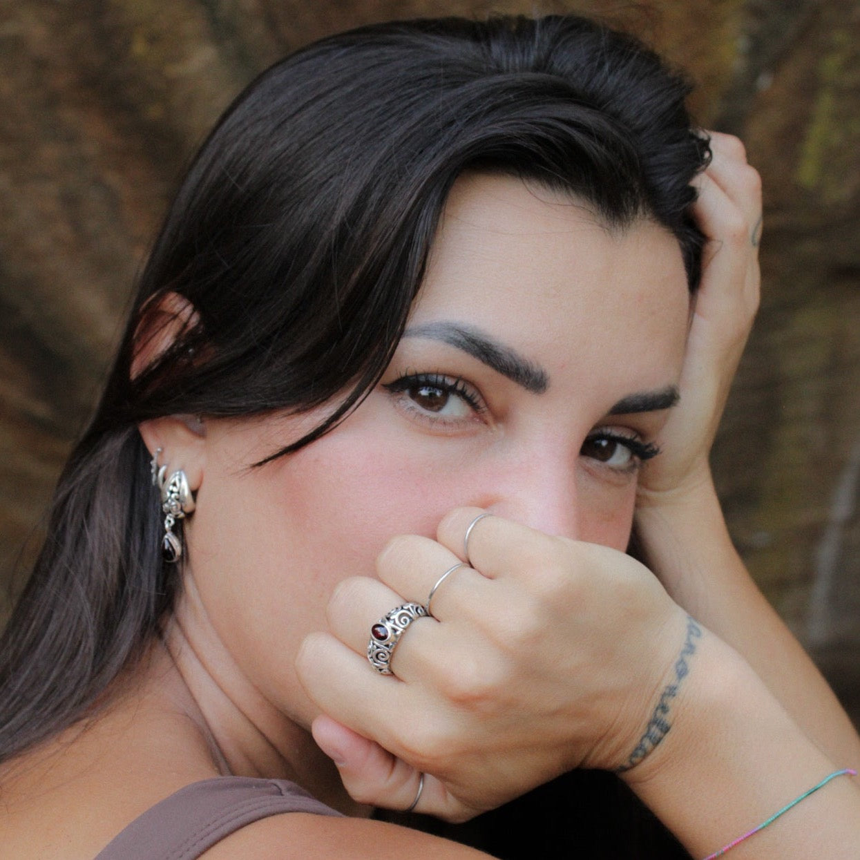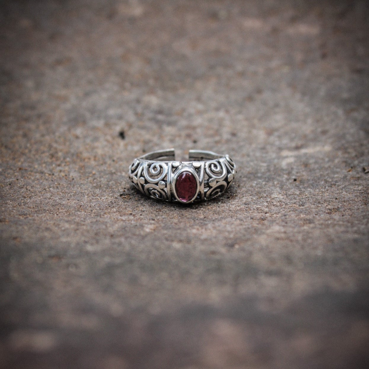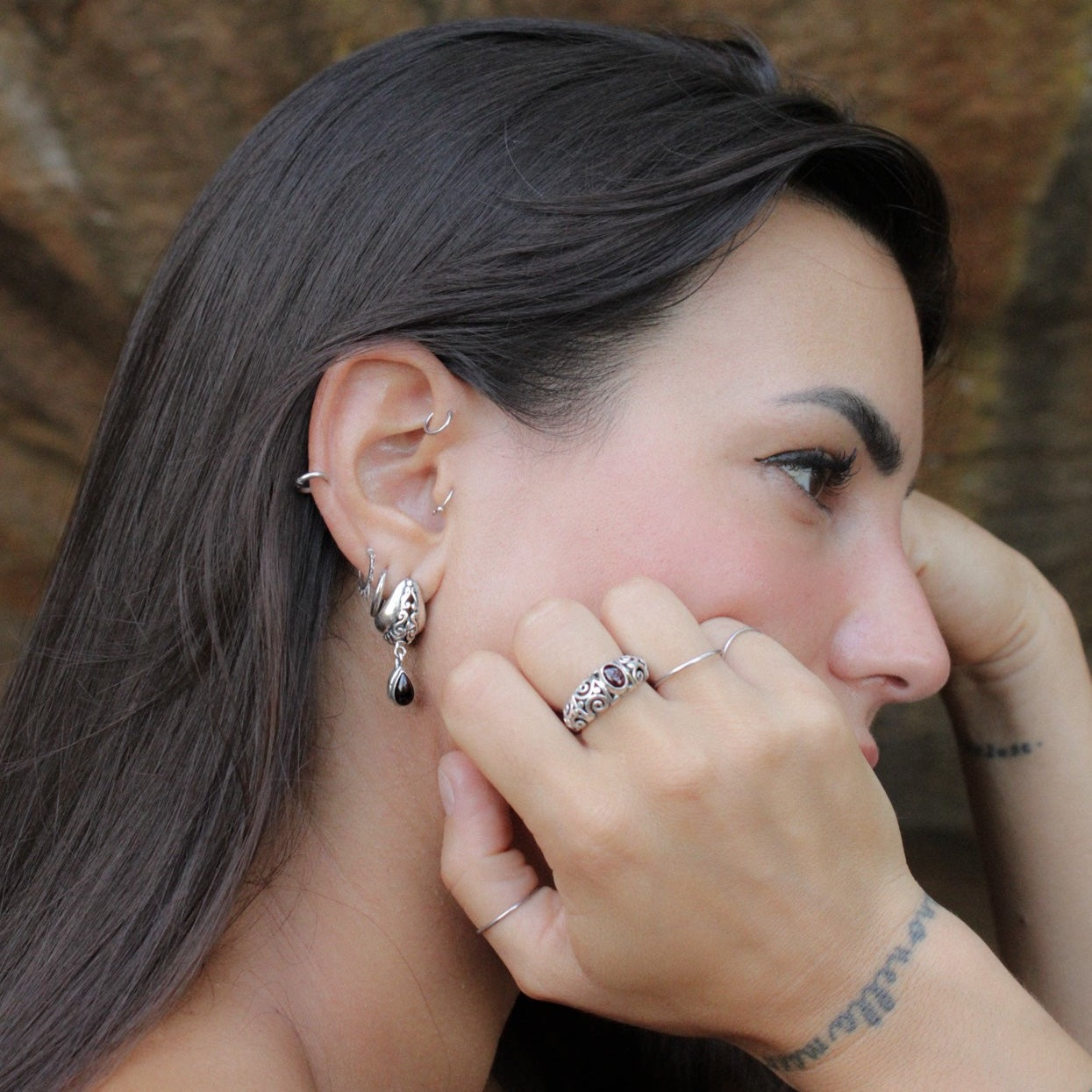 L’anello ha una fascia cava intagliata ma sufficientemente larga da renderlo molto resistente alla regolazione di taglia. Una gemma ovale di granato lunga 0,4 mm incastonata al centro amplifica l’effetto vintage dello stile annerito dovuto alla tecnica di ossidazione utilizzato su tutto il gioiello.