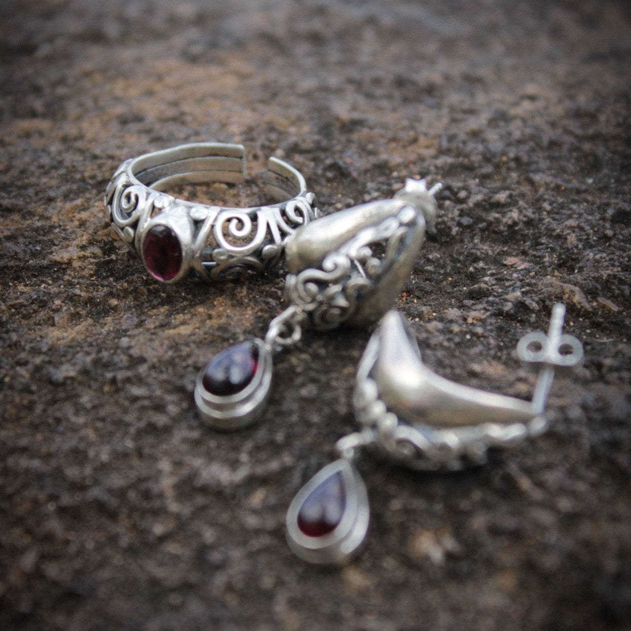 I gioielli ispirati alle curve del Nine Arch Bridge, con linee sottili e intrecciate che rendono il design di questa parure unica e delicata, leggera e morbida con un piccolo contrasto di tono grazie alla gemma di granato incastonata su di essi.