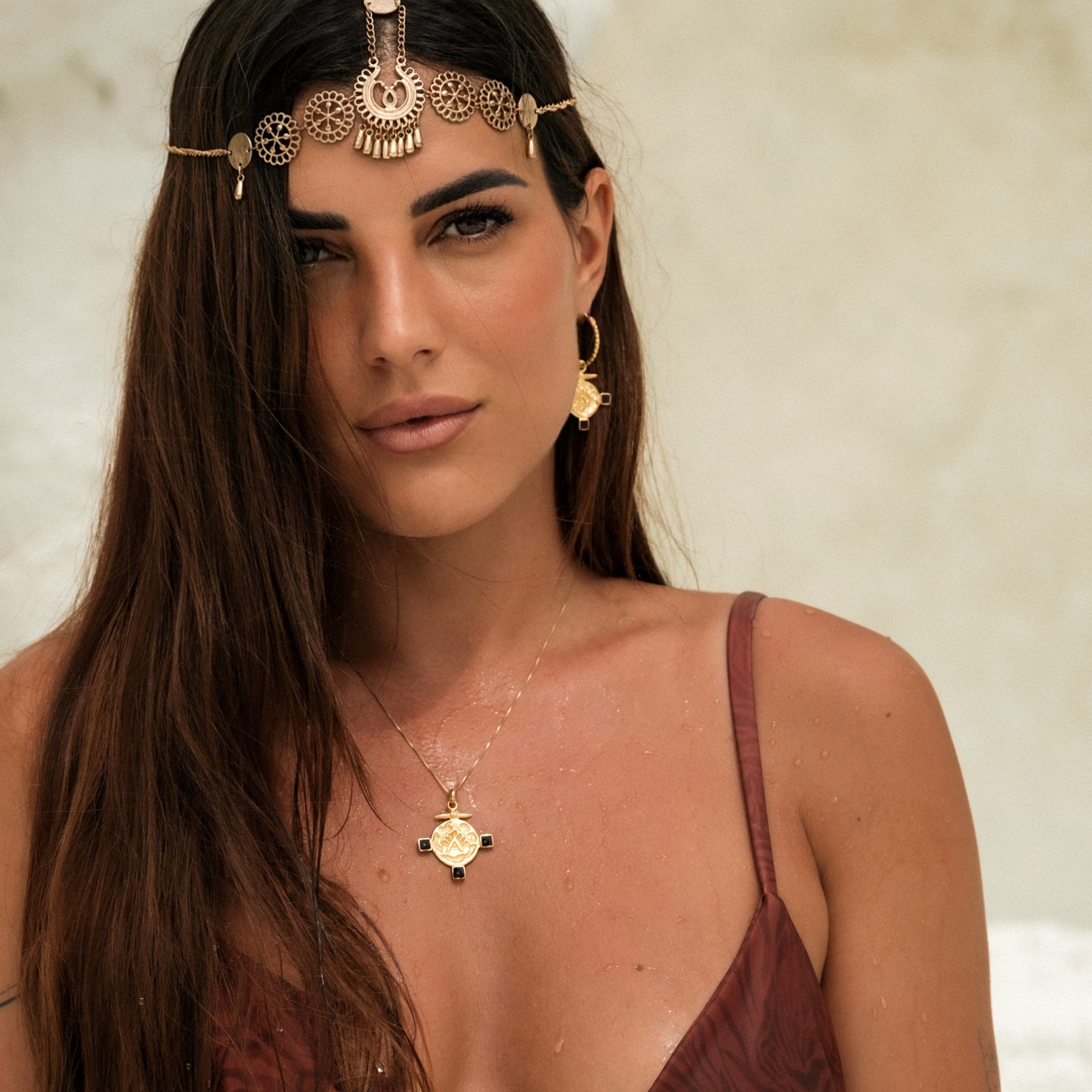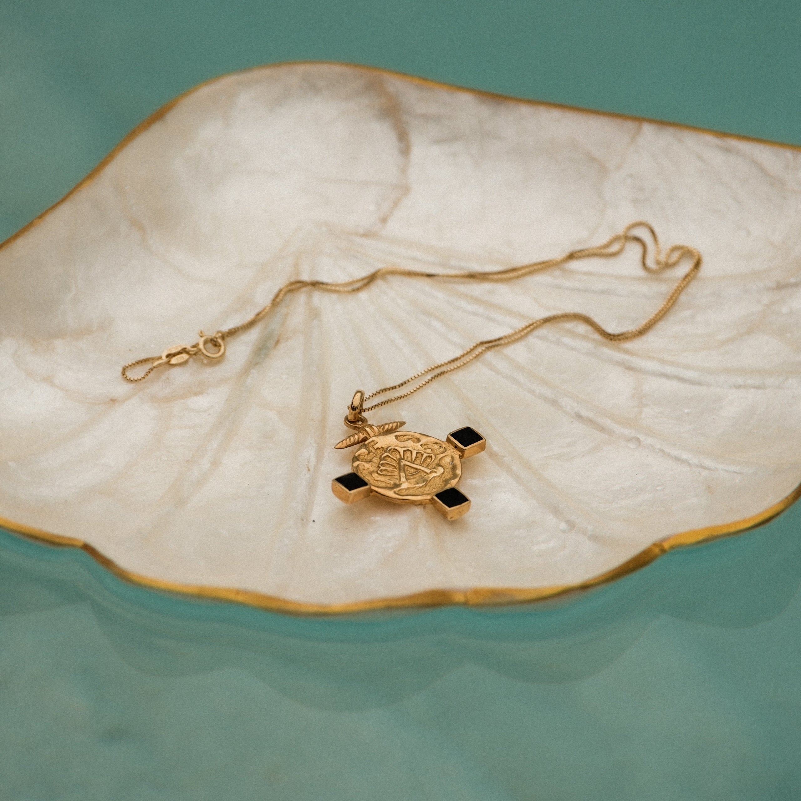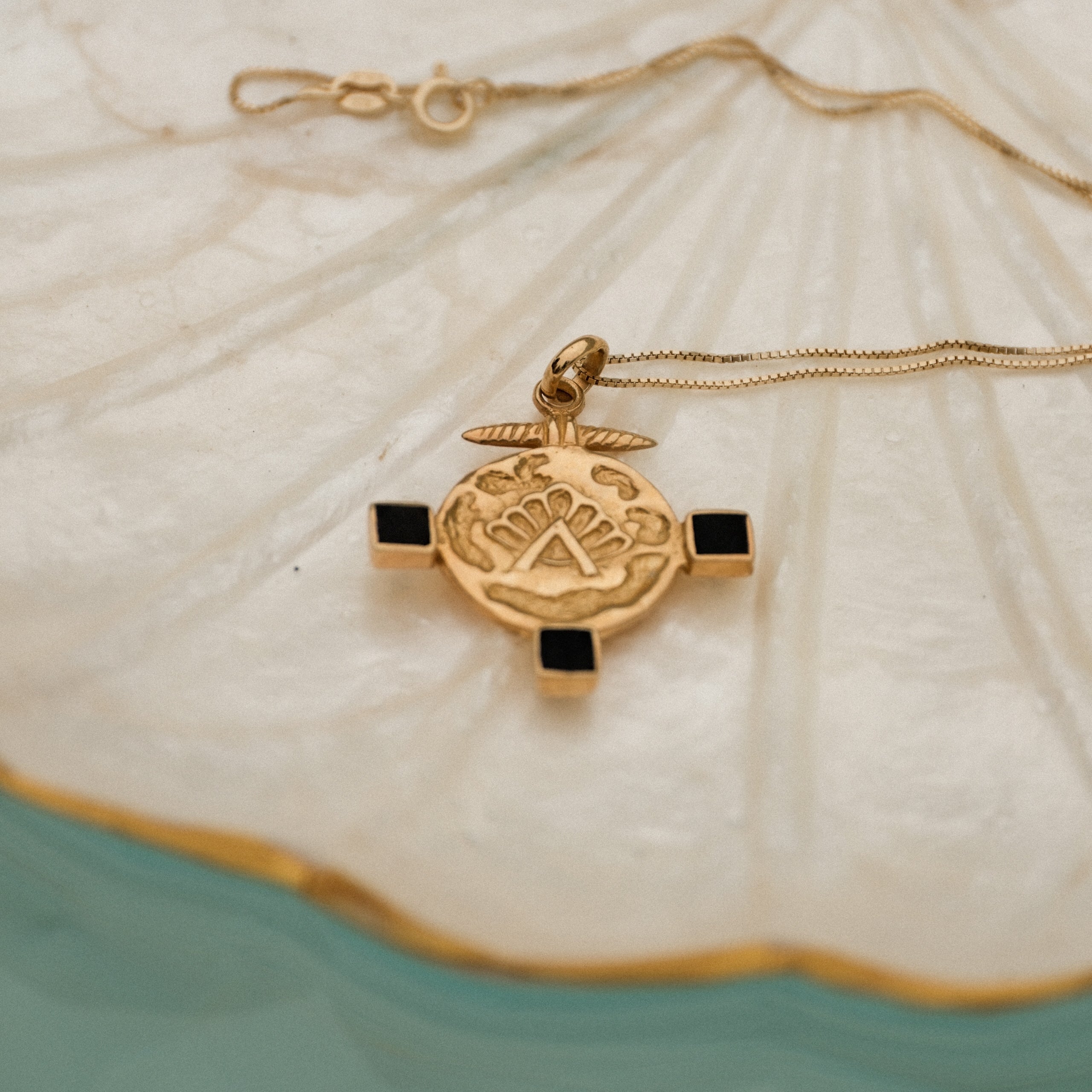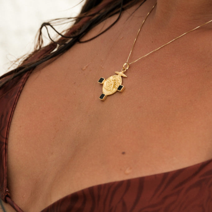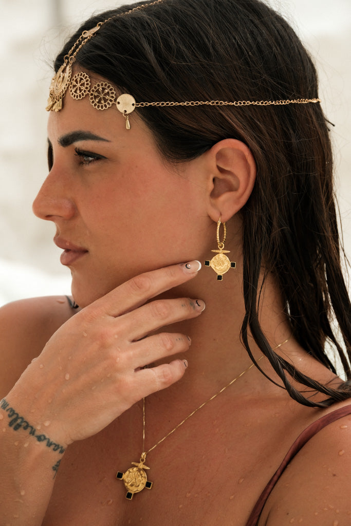✨ Collana Gizem – Un pendente di diametro 3 cm dal fascino misterioso, impreziosito da simboli di potere e protezione. Anche in questo caso, gli inserti neri sono realizzati in conchiglia, che dona profondità ed eleganza al gioiello, evocando i misteriosi simboli bizantini. Catena veneziana dorata di 45 cm.