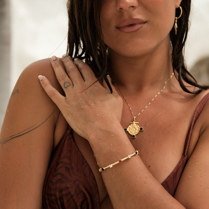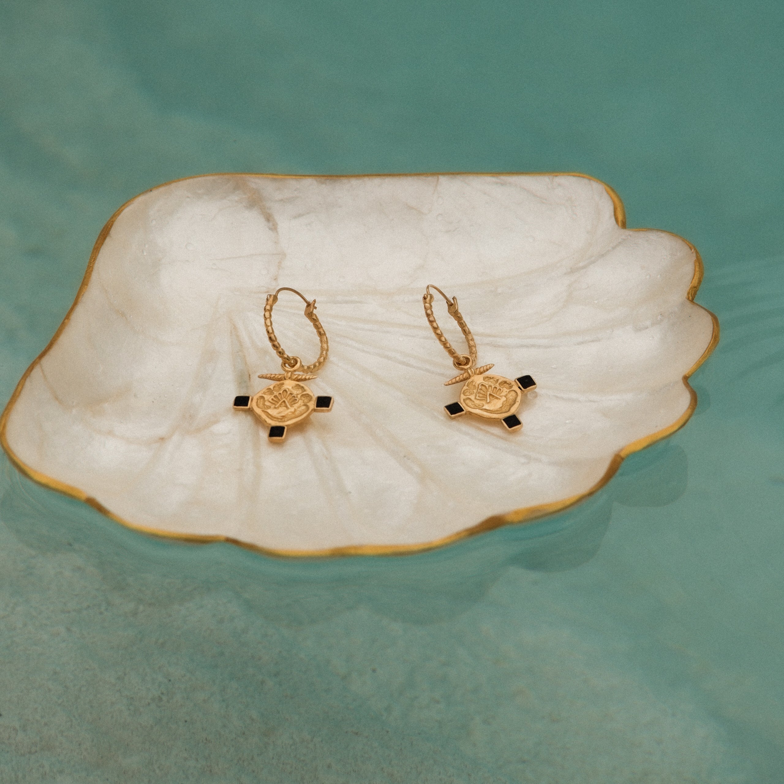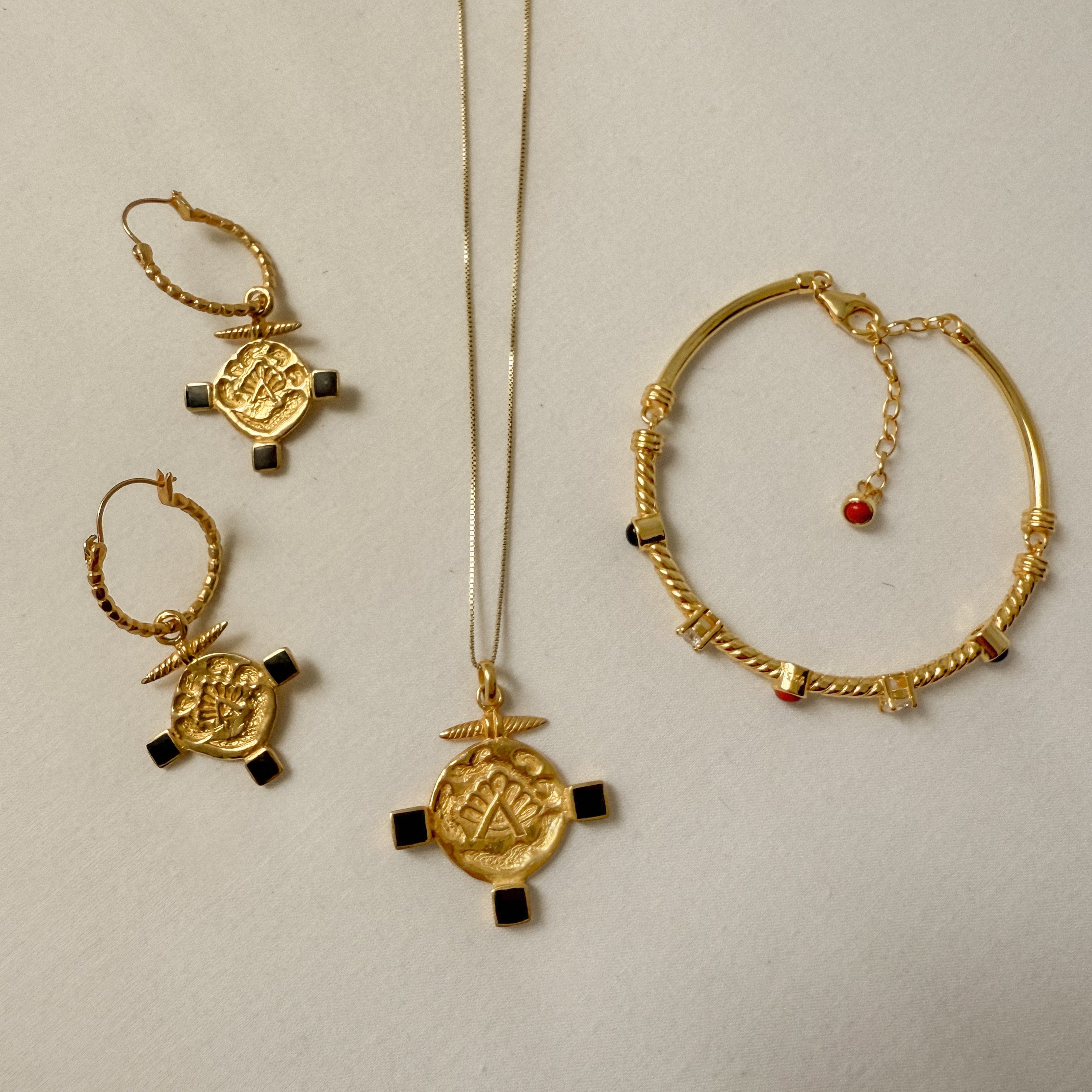 Realizzati in argento 925 placcato in oro 18K, questi gioielli richiamano l’arte bizantina, ottomana e anatolica. I colori e i materiali scelti hanno una storia: l’oro richiama la tessitura dei tappeti più pregiati, gli hereke , il nero dell’onice e della conchiglia nera simboleggiano gli schemi bizantini, mentre il rosso del corallo rappresenta i colori spesso utilizzati per i tappeti.