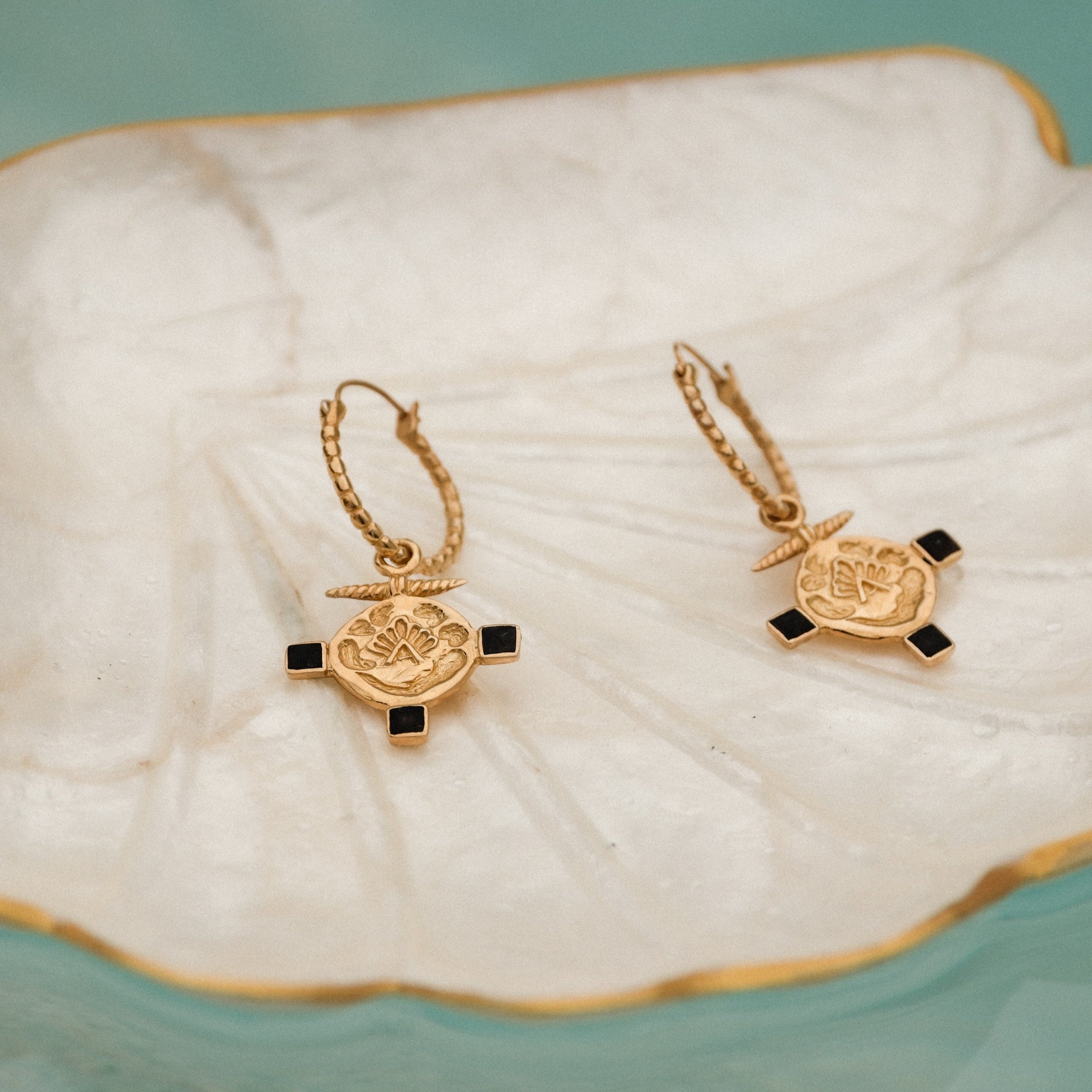 ✨ Orecchini pendenti – Cerchi di 2 cm di diametro con texture a sfere, da cui scendono pendenti decorati con rilievi ispirati agli antichi sigilli turchi. I tre dettagli neri presenti sono in conchiglia, materiale naturale legato alla protezione e all’energia della terra. Diametro pendenti 2,5 cm