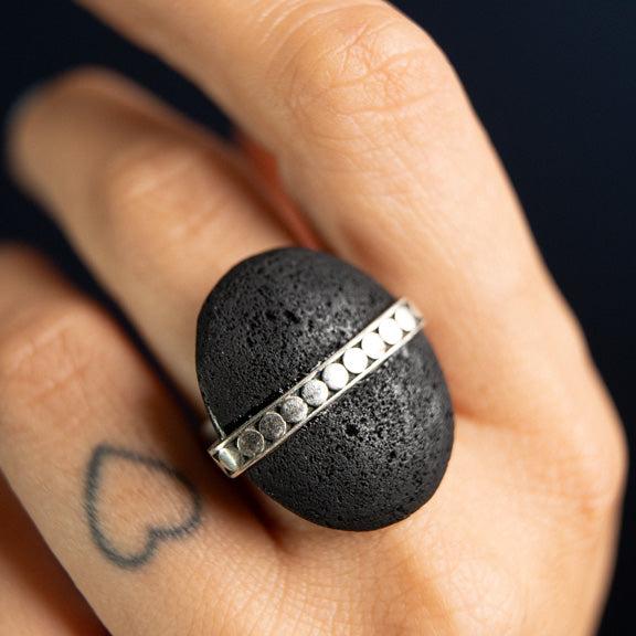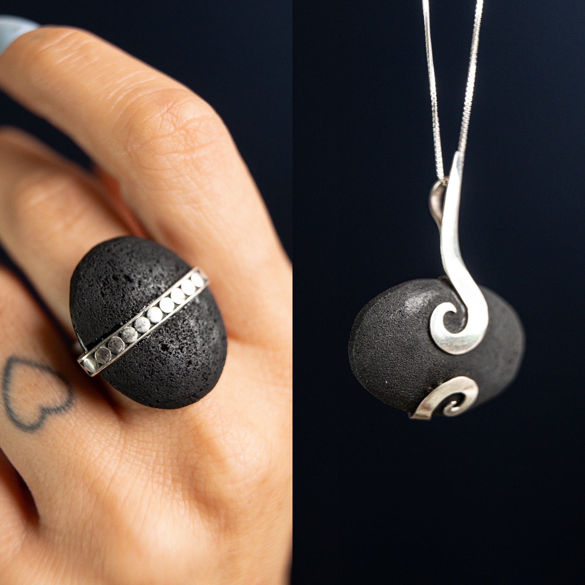 Anello e collana regolabili in Argento 925 con pietra lavica.