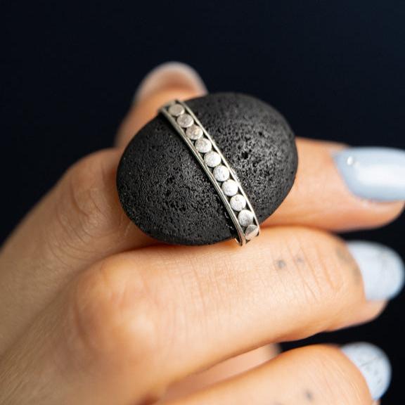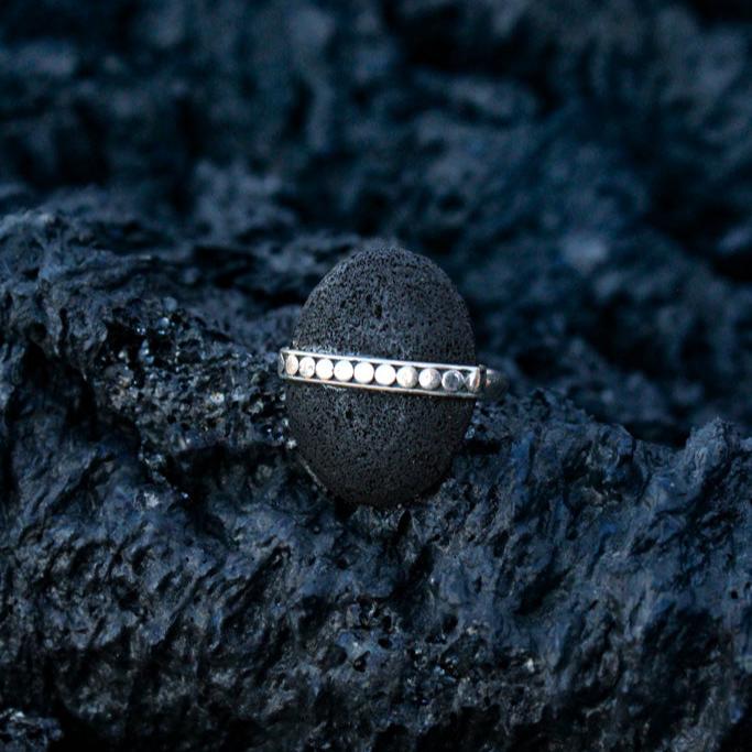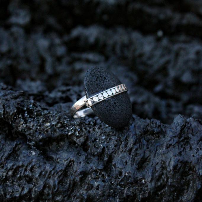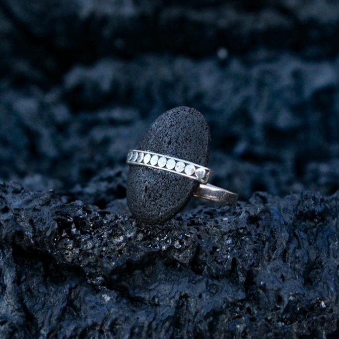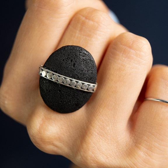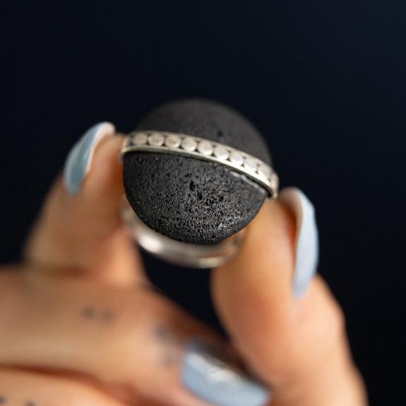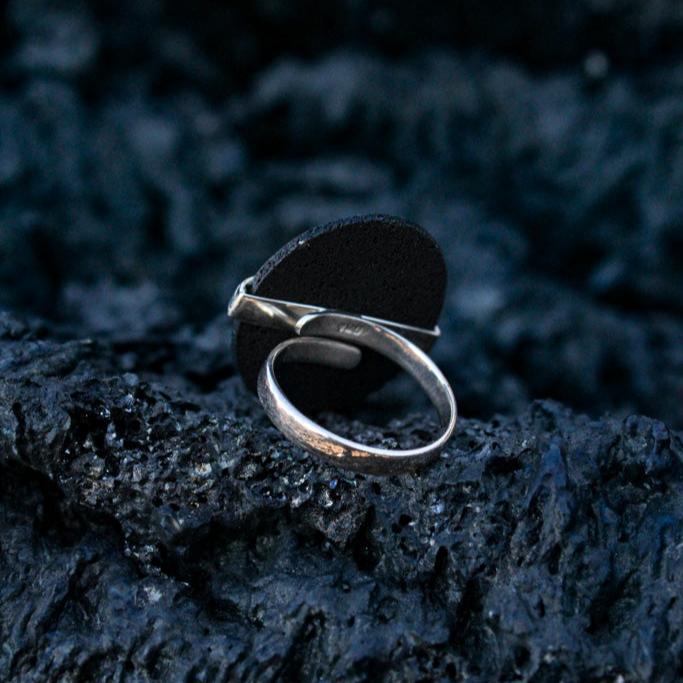 Ogni gioiello è una finestra su panorami inesplorati: la sua superficie scura, quasi lunare, evoca i campi di lava solidificata dell’Islanda, dove il calore si è trasformato in quiete eterna.