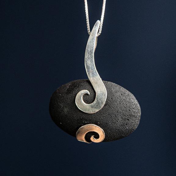 La pietra lavica, con la sua texture porosa e l’aspetto opaco, racconta storie antiche di eruzioni vulcaniche, di fiumi incandescenti che si raffreddano sotto il cielo artico. La pietra della collana è incastonata in un design fluido per richiamare la prima fase della colata lavica, quando ancora si muove prima di depositarsi raffreddandosi, quello dell’anello richiama un design più rigido, per portare alla seconda fase della trasformazione della lava in roccia lavica, dura e fredda, quasi vitrea.