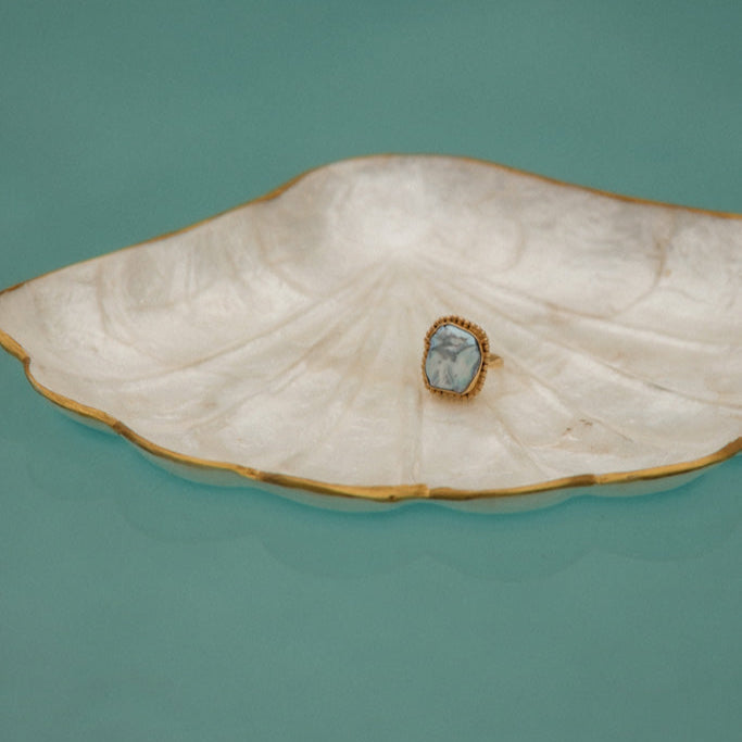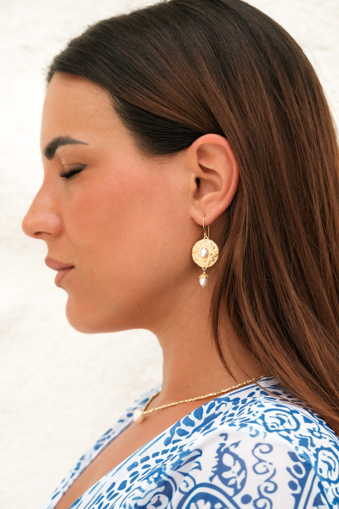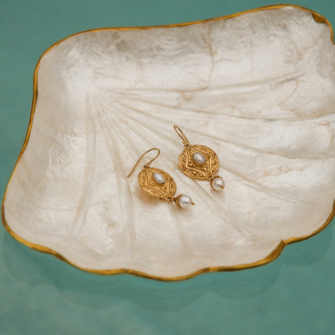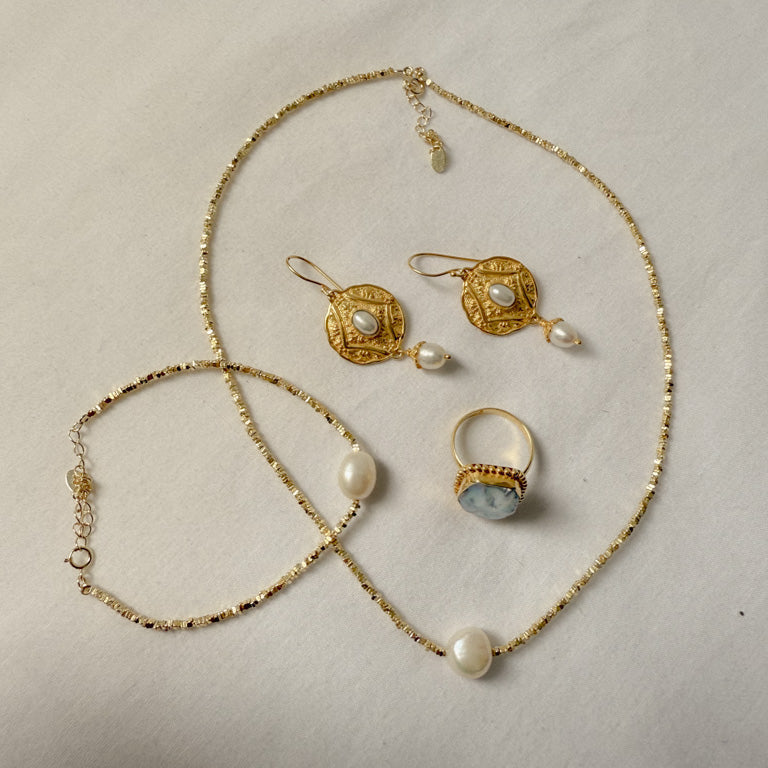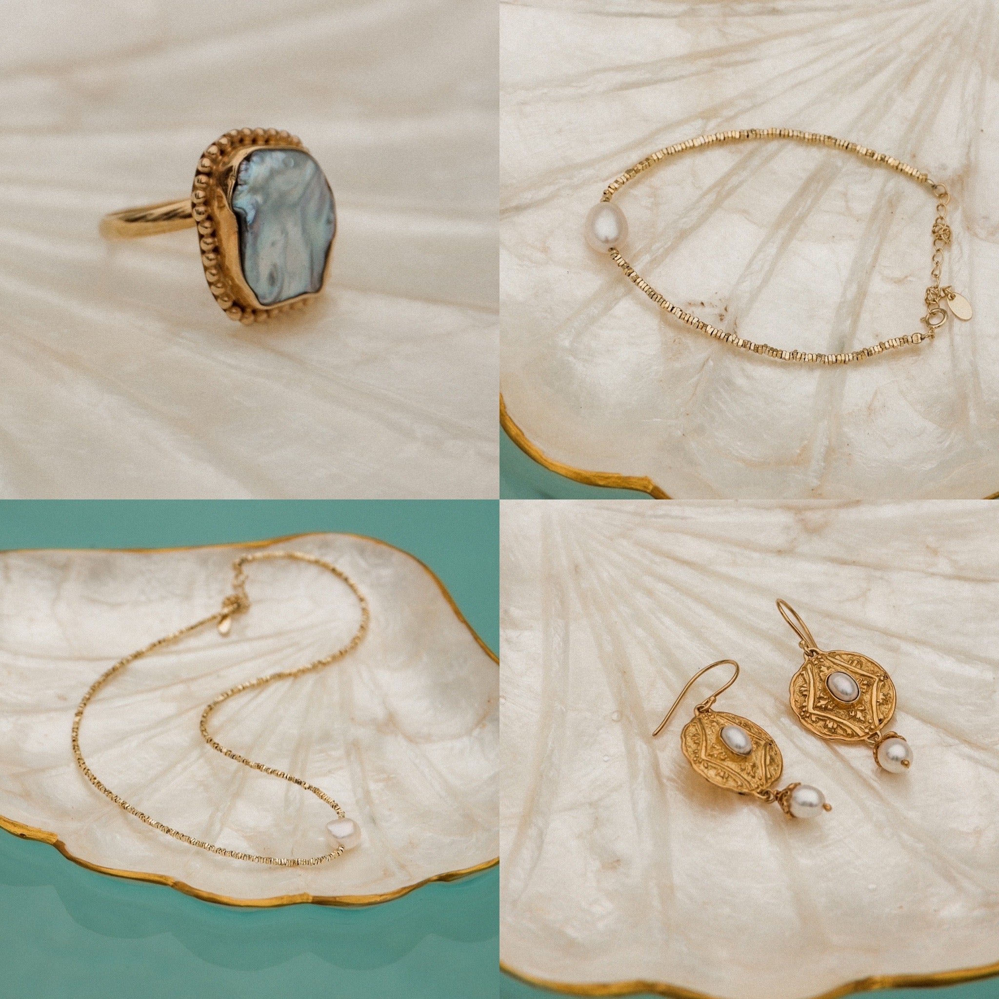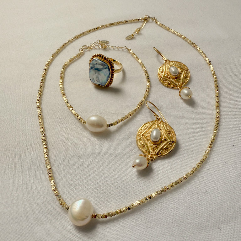 Gli orecchini, con incantevoli perle incastonate in strutture dorate finemente lavorate, sono amuleti carichi di significato, mentre l’anello, la collana e il bracciale riflettono la dolcezza e l’equilibrio dell’anima.