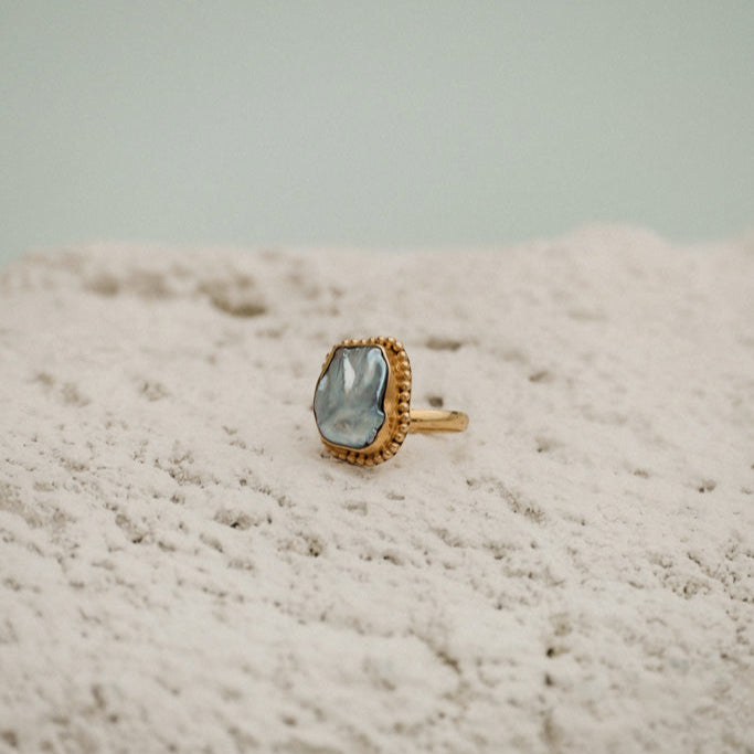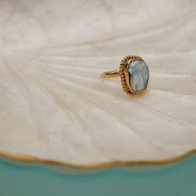 Anello: regolabile sulla parte alta con perla barocca irregolare di 2 cm circa, diametro di partenza 1,8 cm.