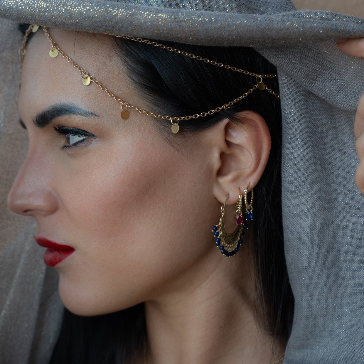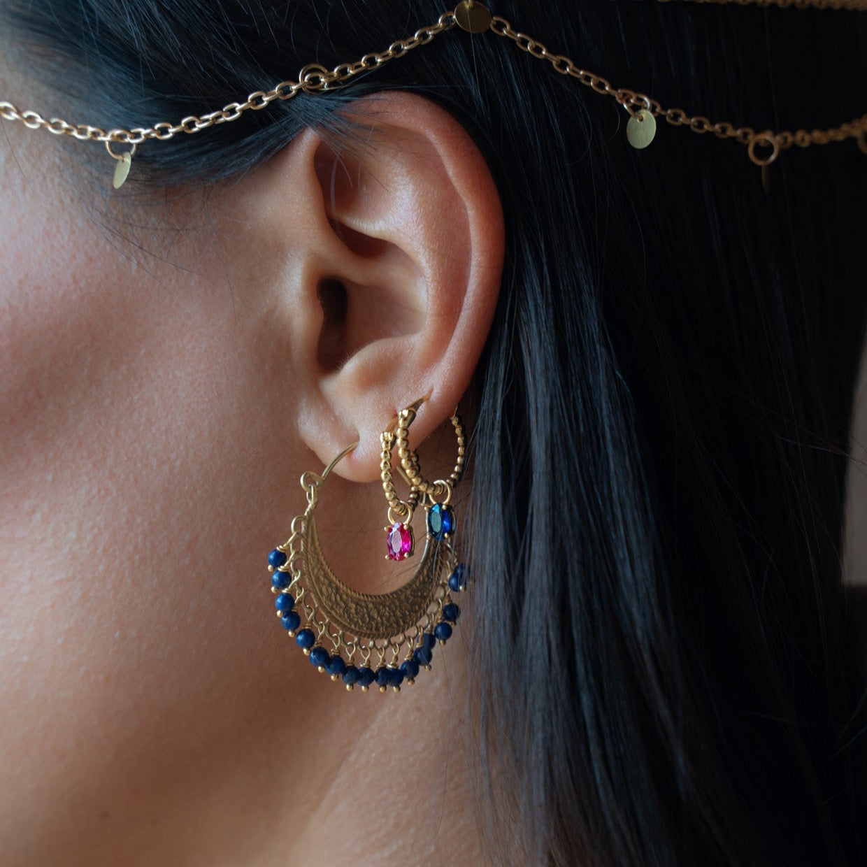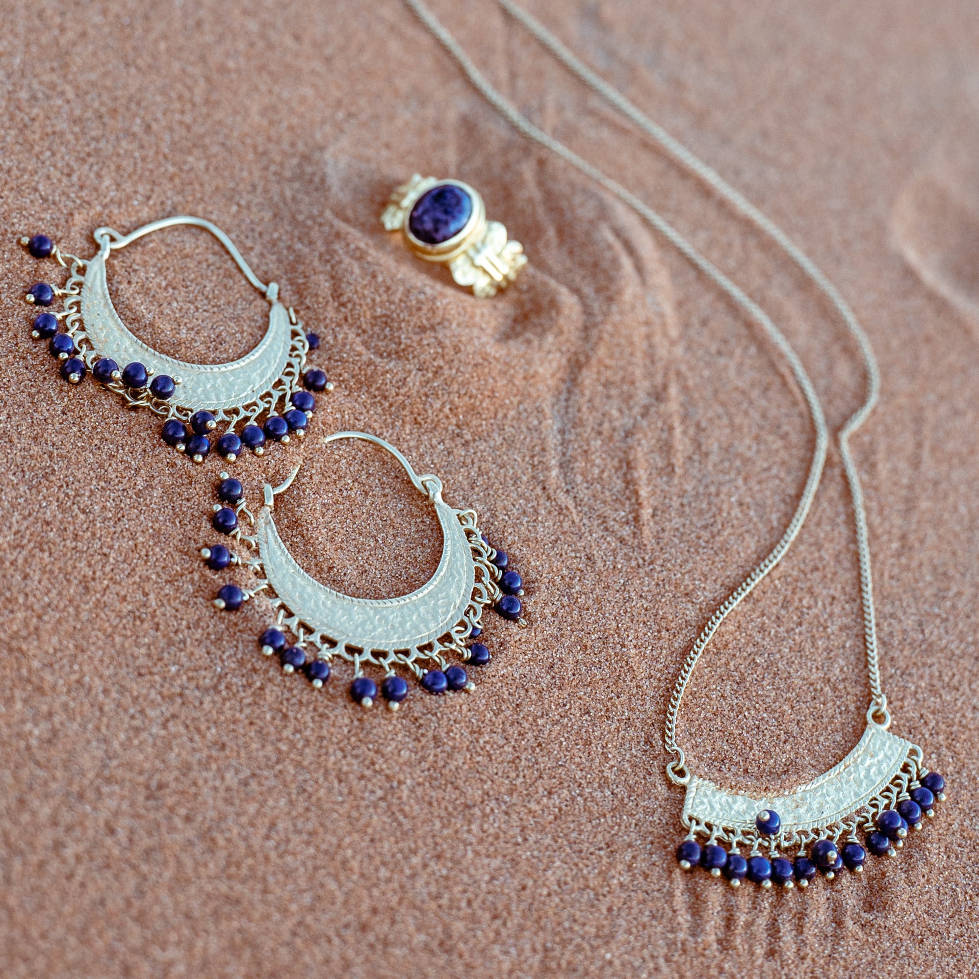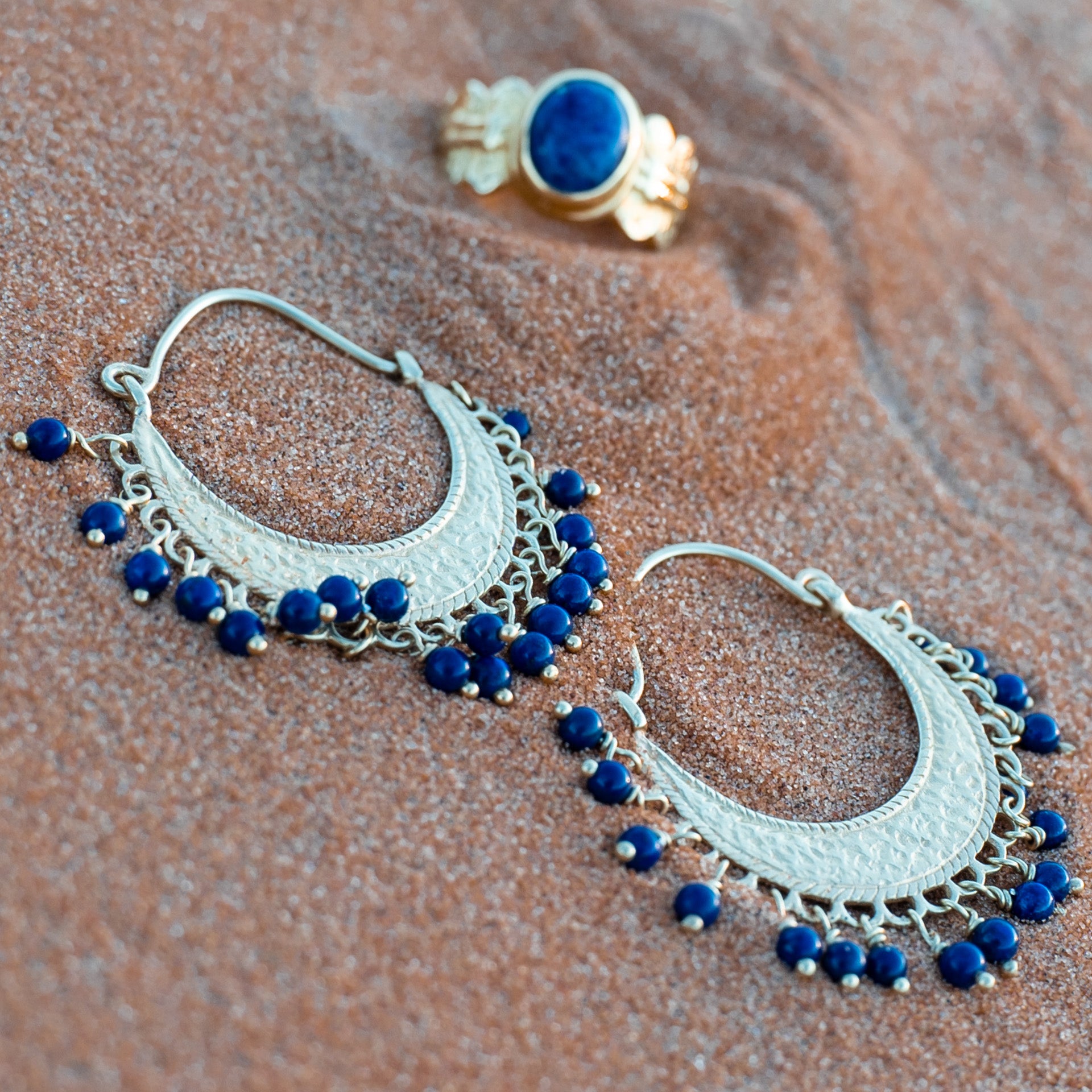 Gli orecchini, con anelle ad incastro a forma di mezzaluna hanno ben 19 lapislazzuli, un diametro di 3 cm e un altezza di 4cm; anch’esse ruvide davanti e lisce dietro.
