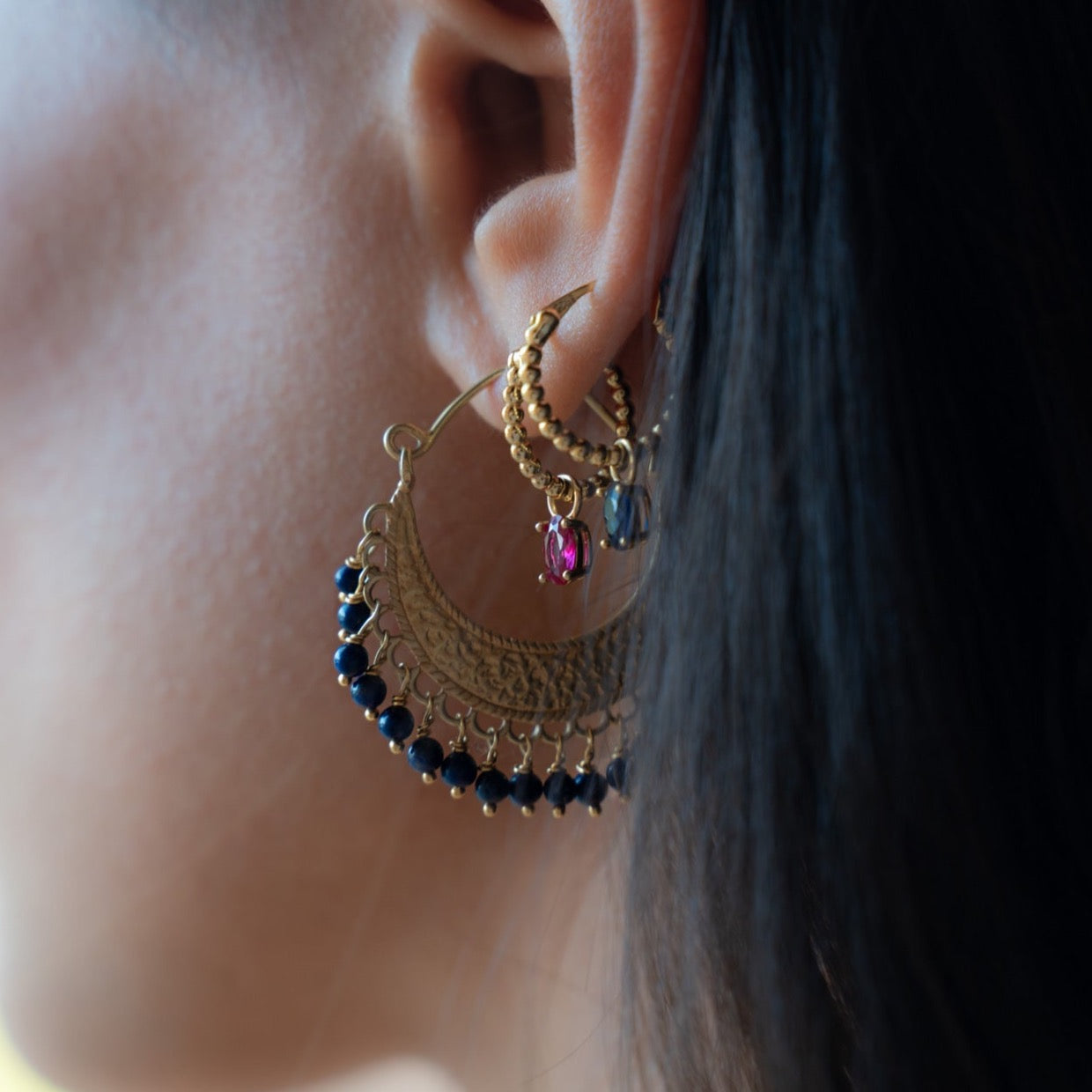 Io l’ho immaginato cosi: forme a mezza luna con intagli e ricami decisi unite a piccole perle di lapislazzuli mobili.