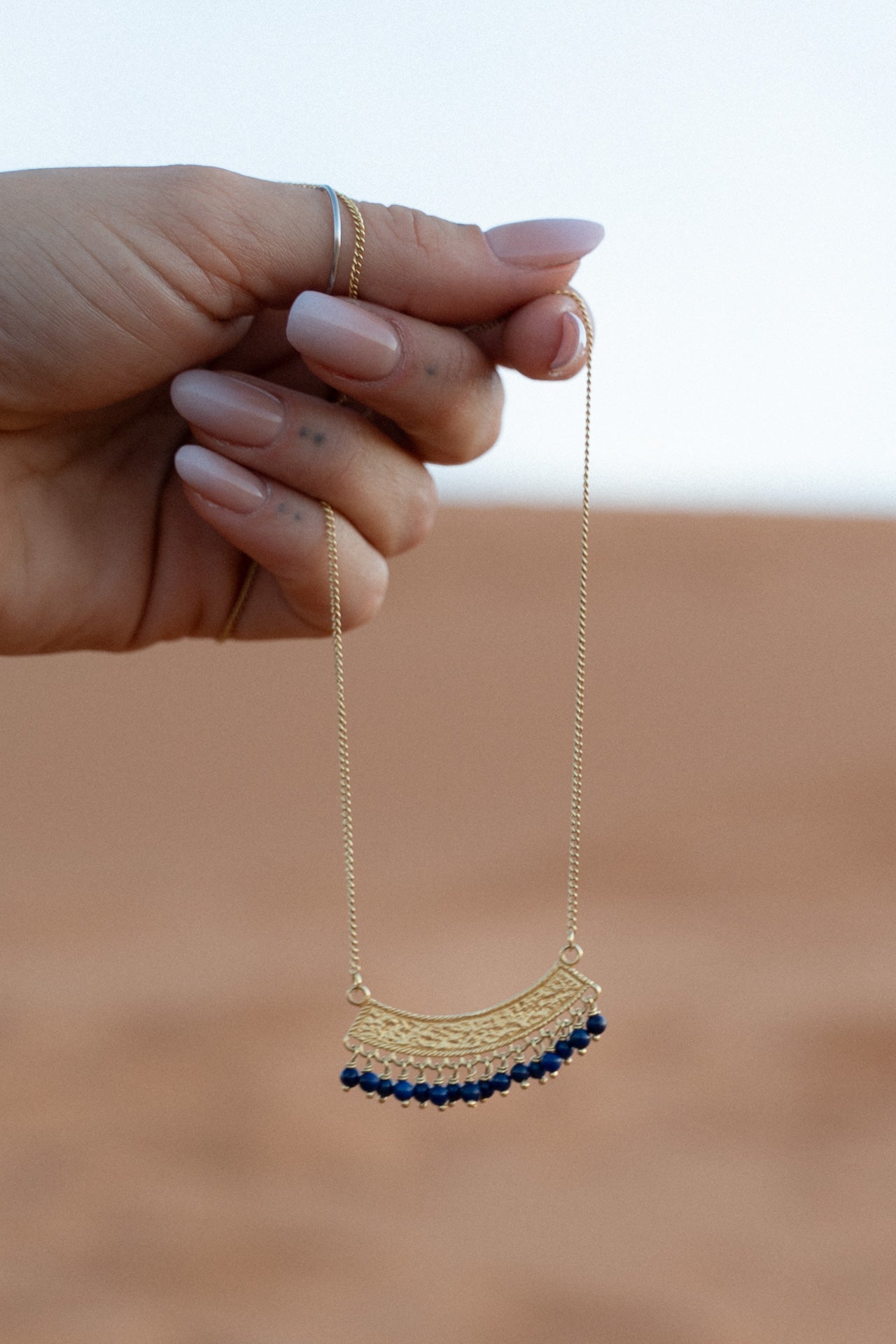La collana, lunga 50 cm, ha un pendente ruvido davanti e liscio dietro largo 4cm con 16 piccoli lapislazzuli pendenti.