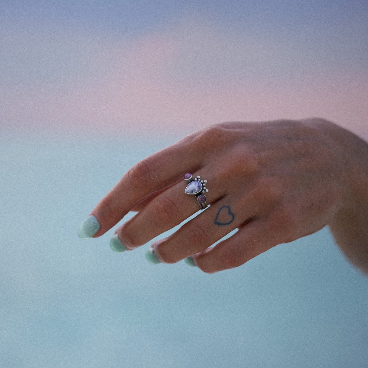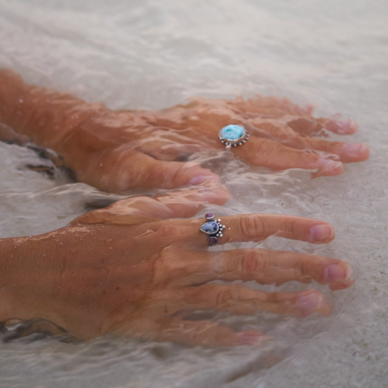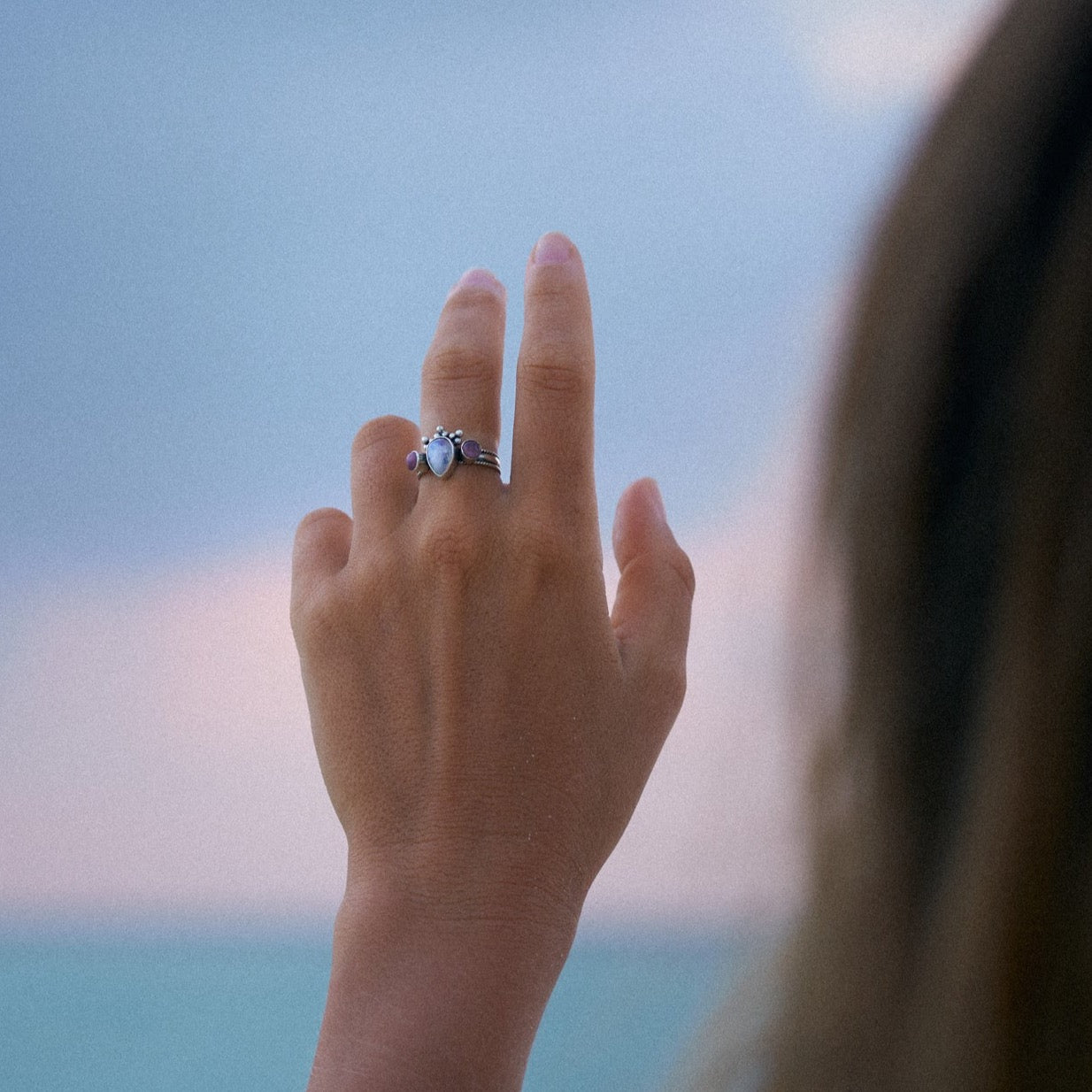 E’ un anello che grazie all’accostamento di queste pietre richiama i colori del cielo quando albeggia e tramonta sull’Oceano Indiano.