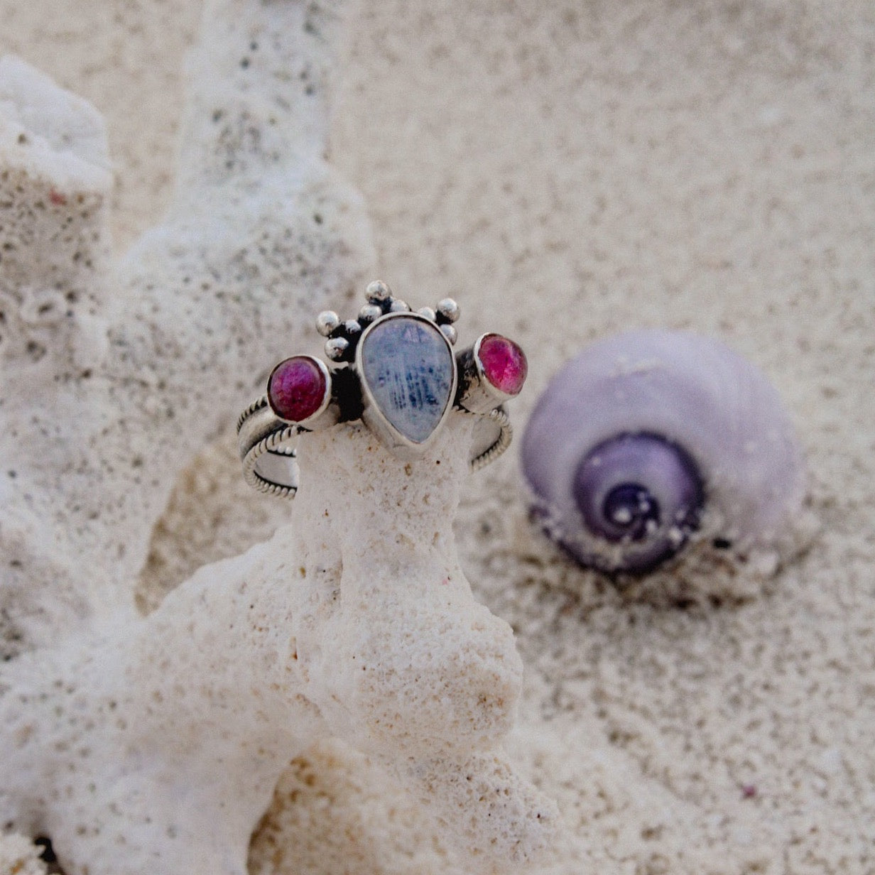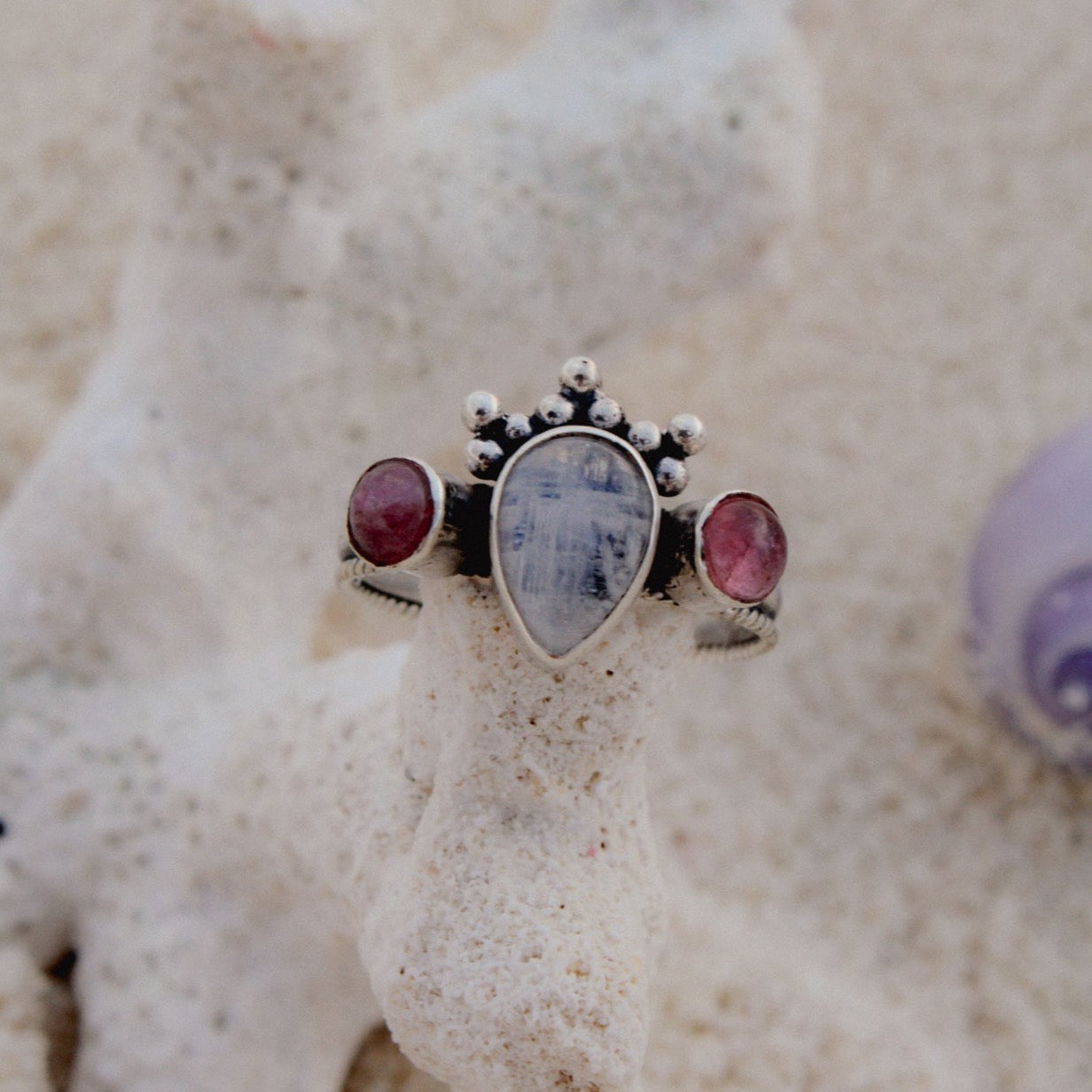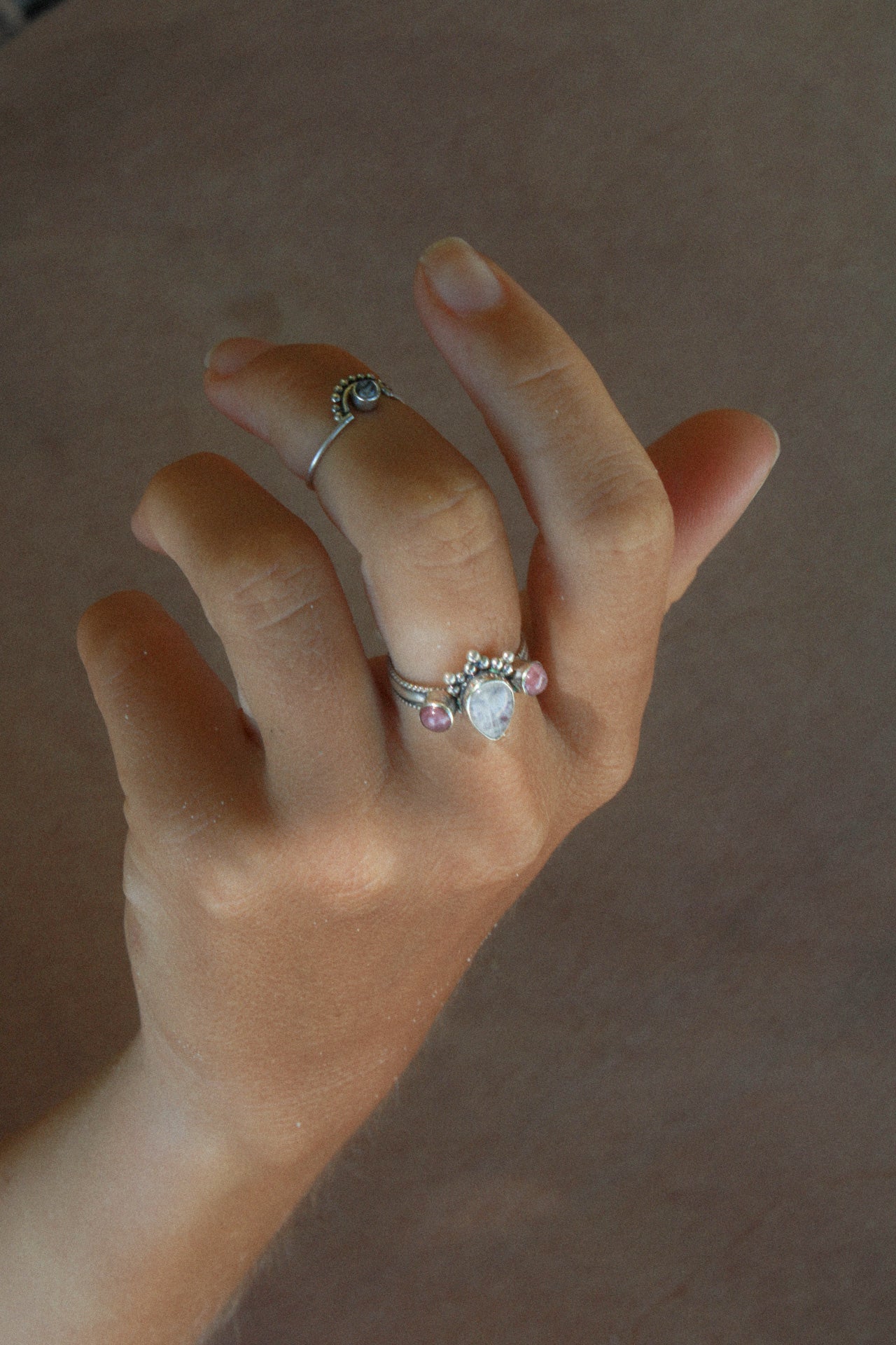 Anello in Argento 925 regolabile con pietra di Luna e Tormalina rosa.