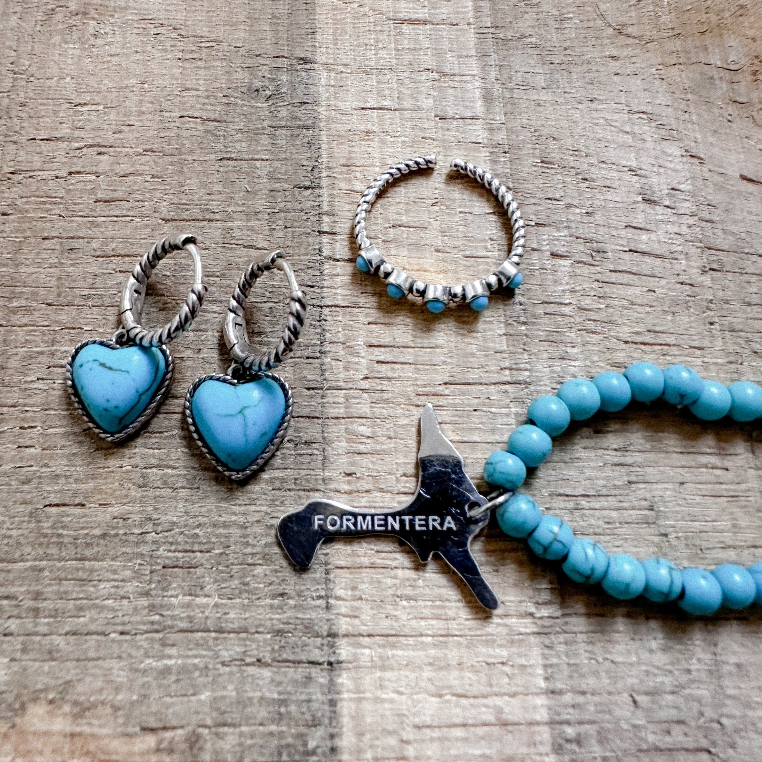 Le pietre turchesi, accuratamente selezionate, catturano l'essenza del mare che circonda questa spiaggia paradisiaca, un'acqua così limpida e brillante da sembrare una piscina naturale. Ogni gioiello della collezione riflette la purezza e la vivacità del turchese, richiamando alla mente le sfumature cristalline che si fondono tra il cielo e il mare di Ses Illetes.