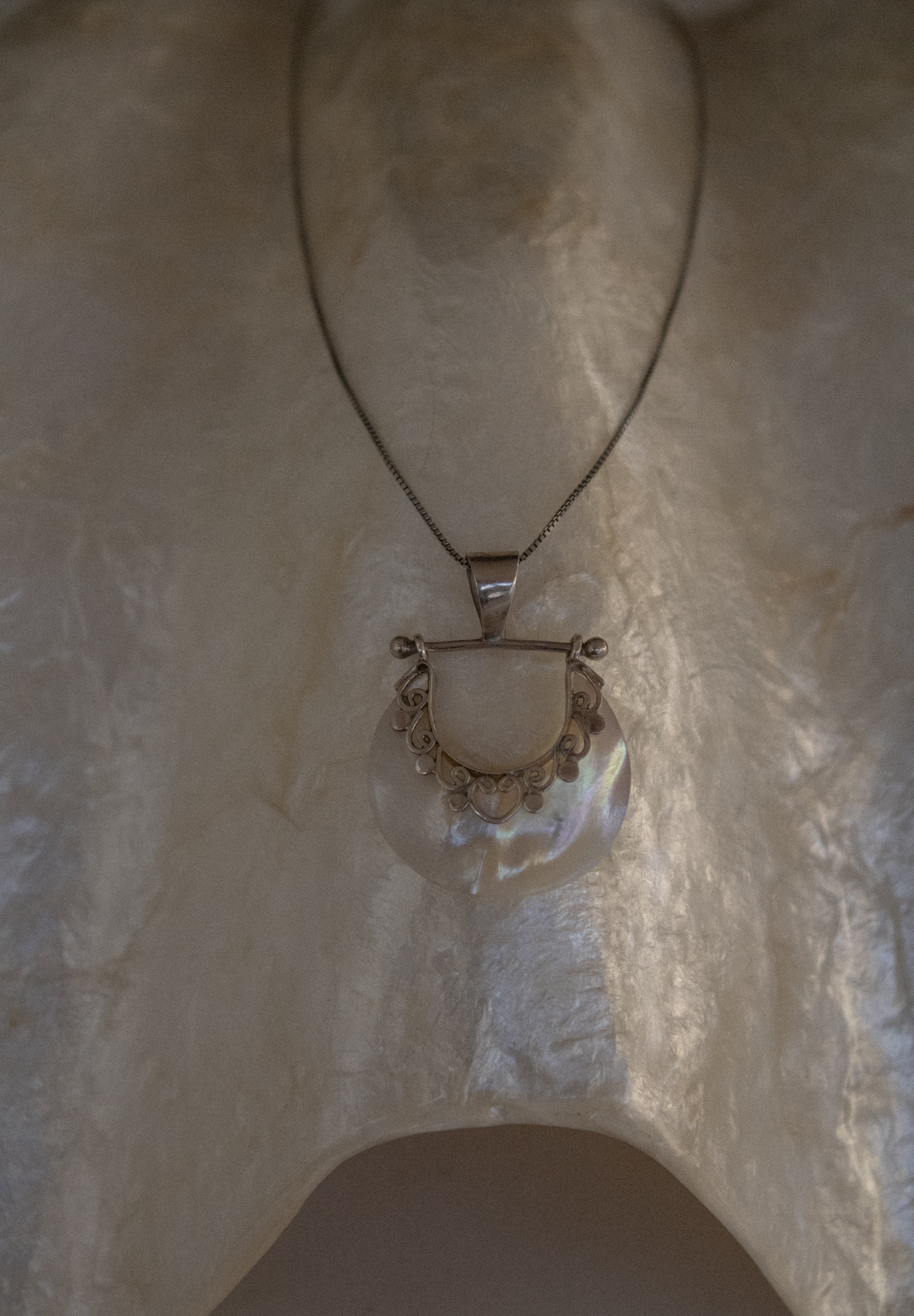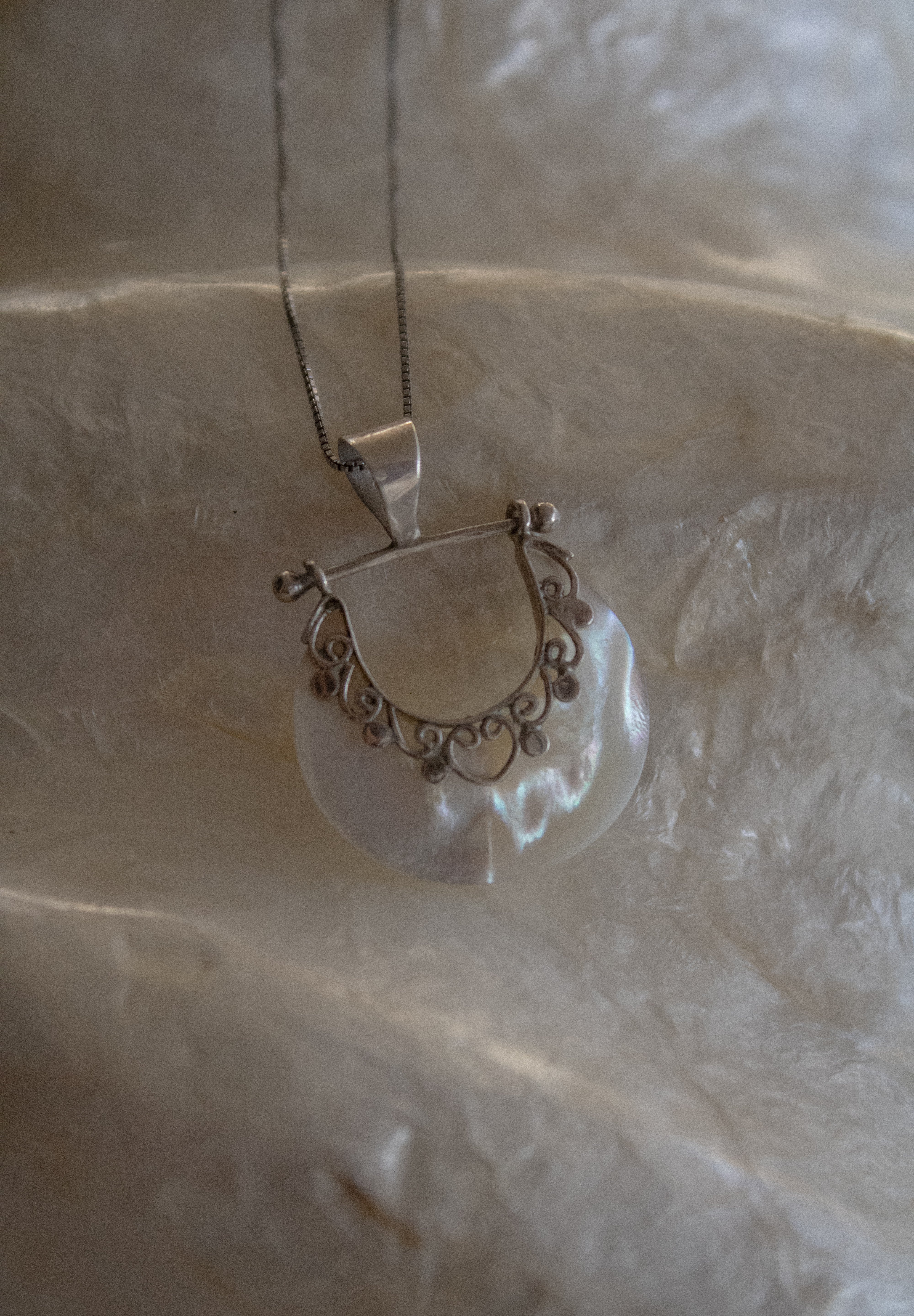 La collana, con catena snake 45cm ha un ciondolo in madreperla a mezza luna incastrato in una struttura swing di 2,5 cm è una decorazione armonica lungo la curva superiore.