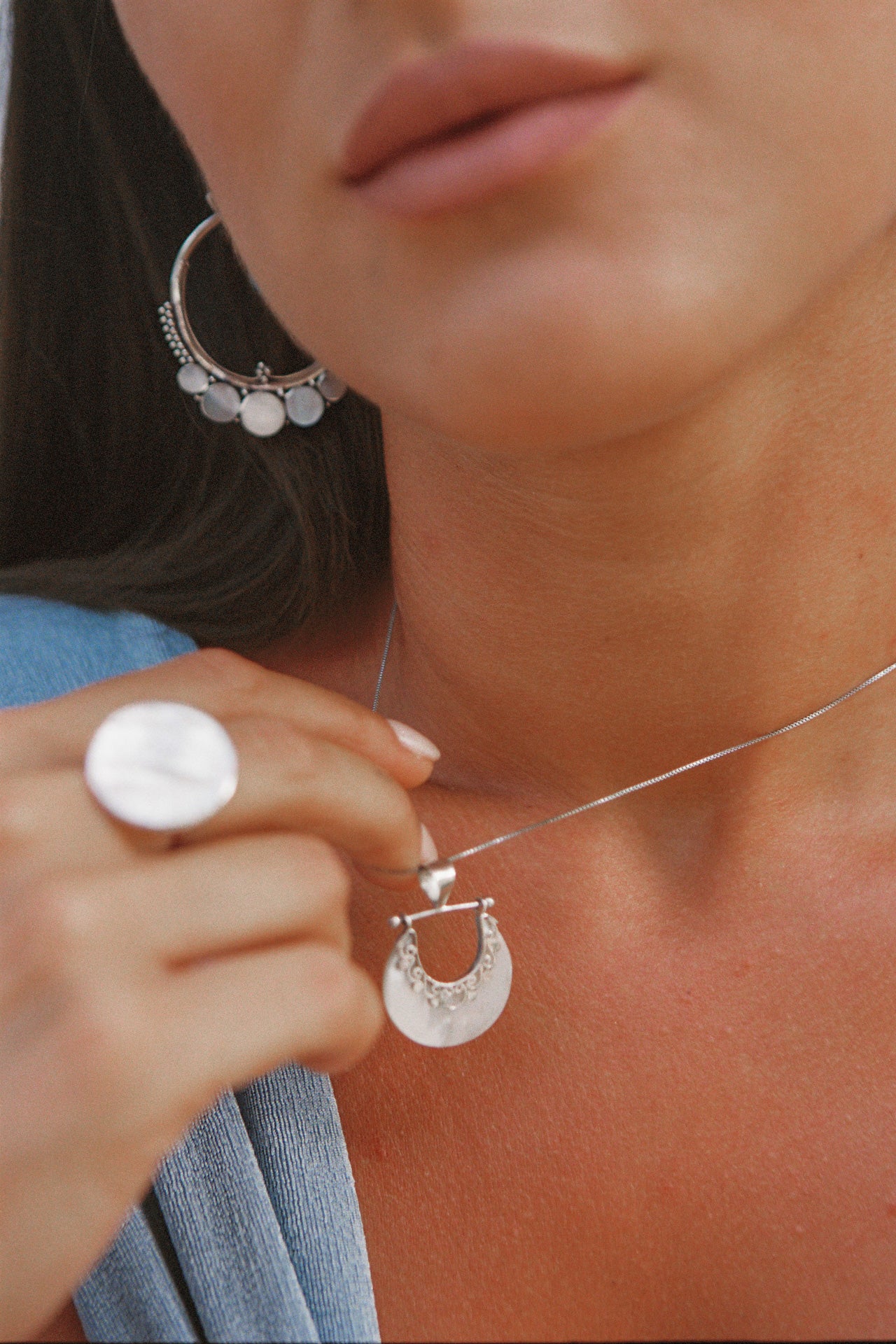 Questa parure di gioielli, realizzata a mano in argento 925, cattura l'essenza luminosa di Formentera, l'isola baciata dal sole e circondata dal mare cristallino.