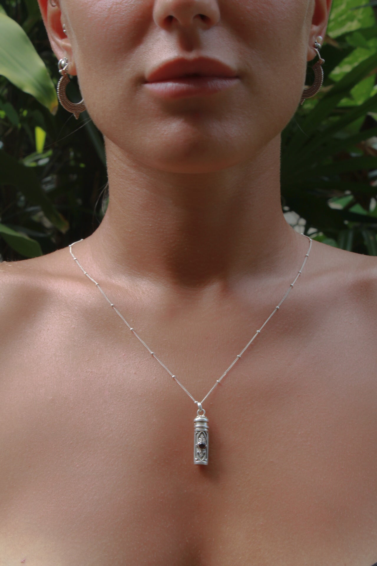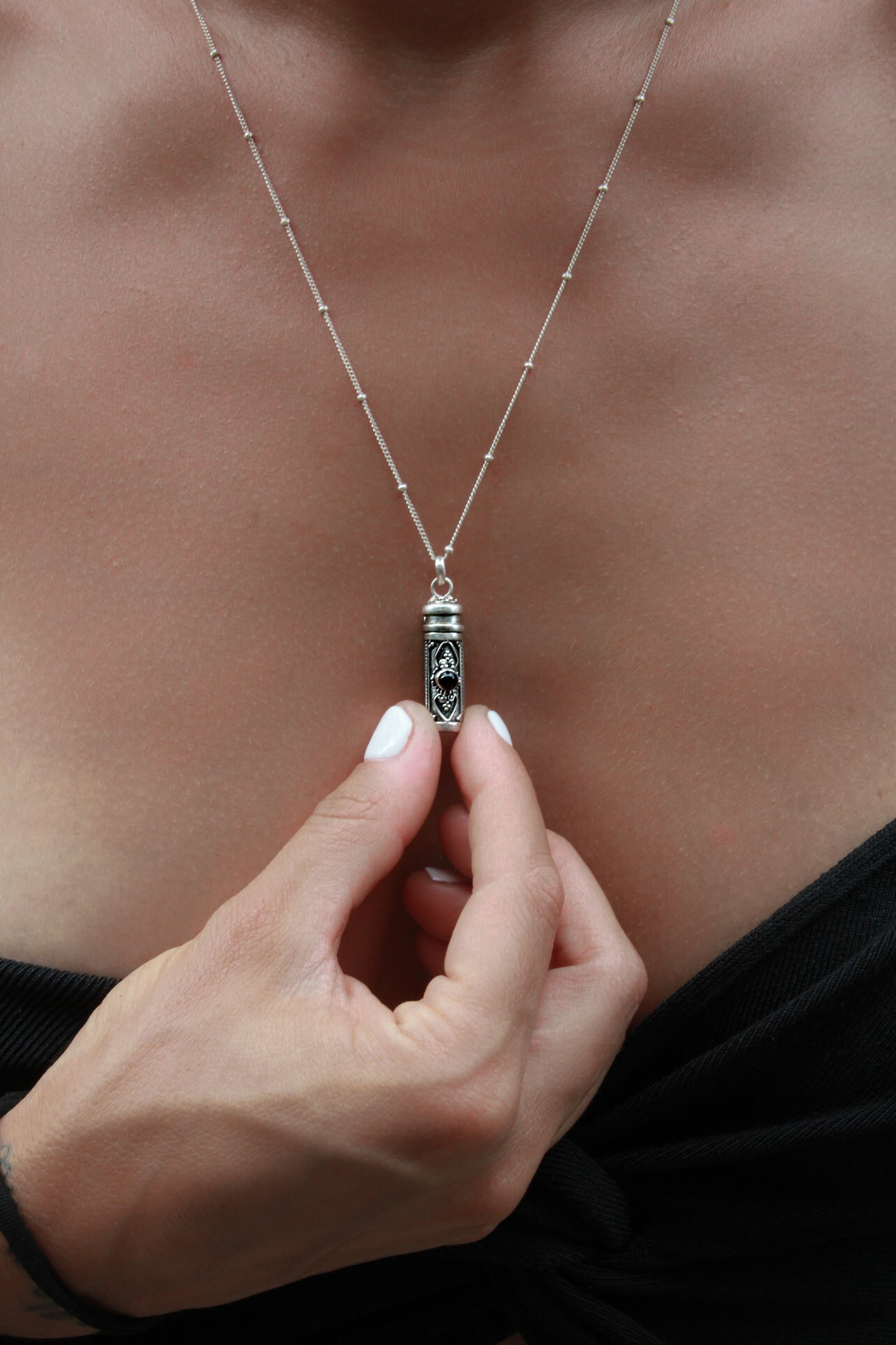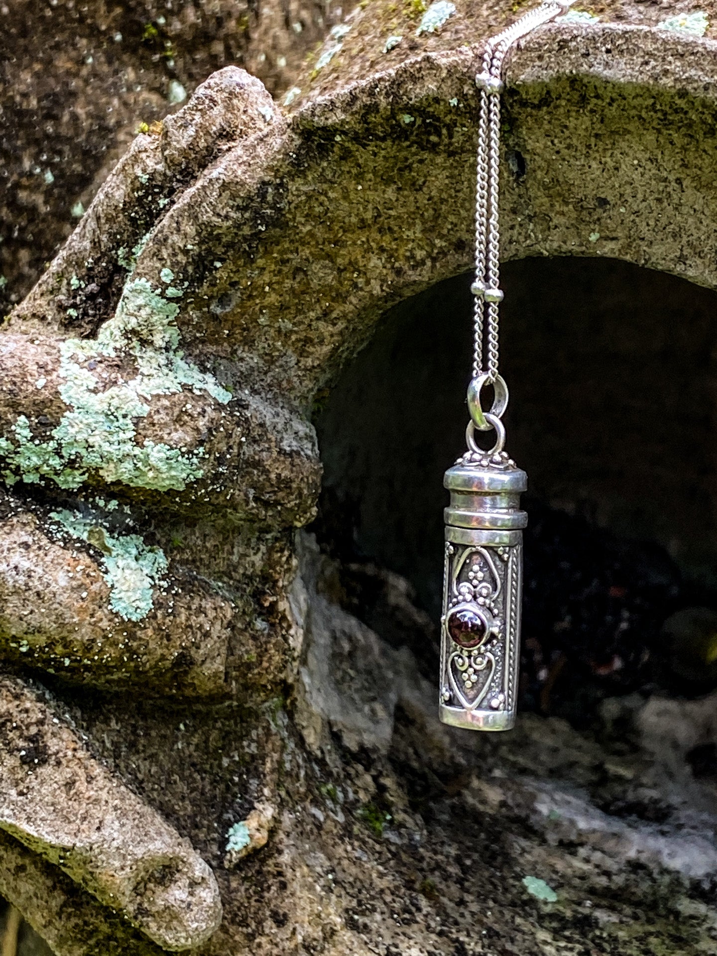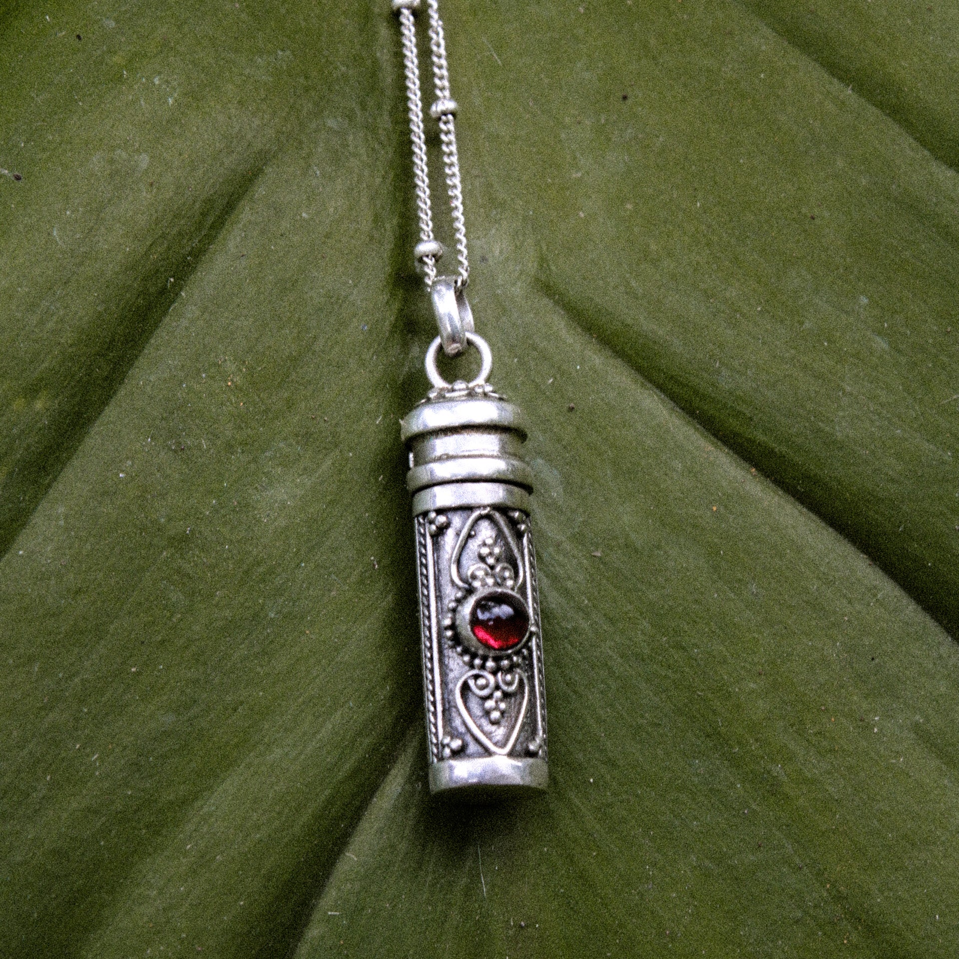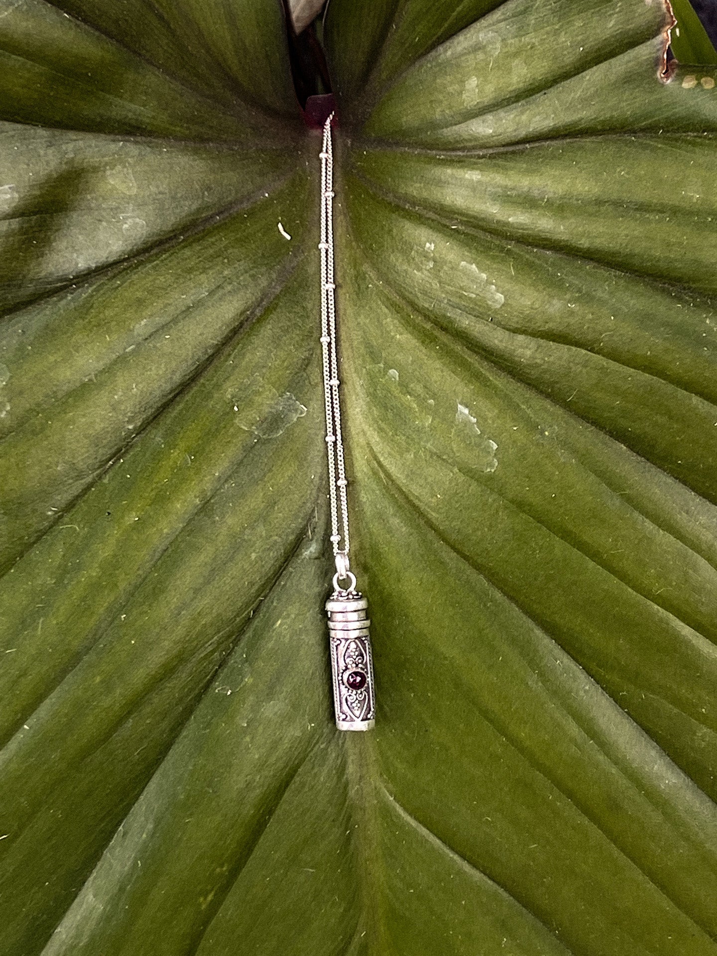 Collana con ciondolo a cilindro contenitore una argento 925 fatto a mano con decori e pietra granata.