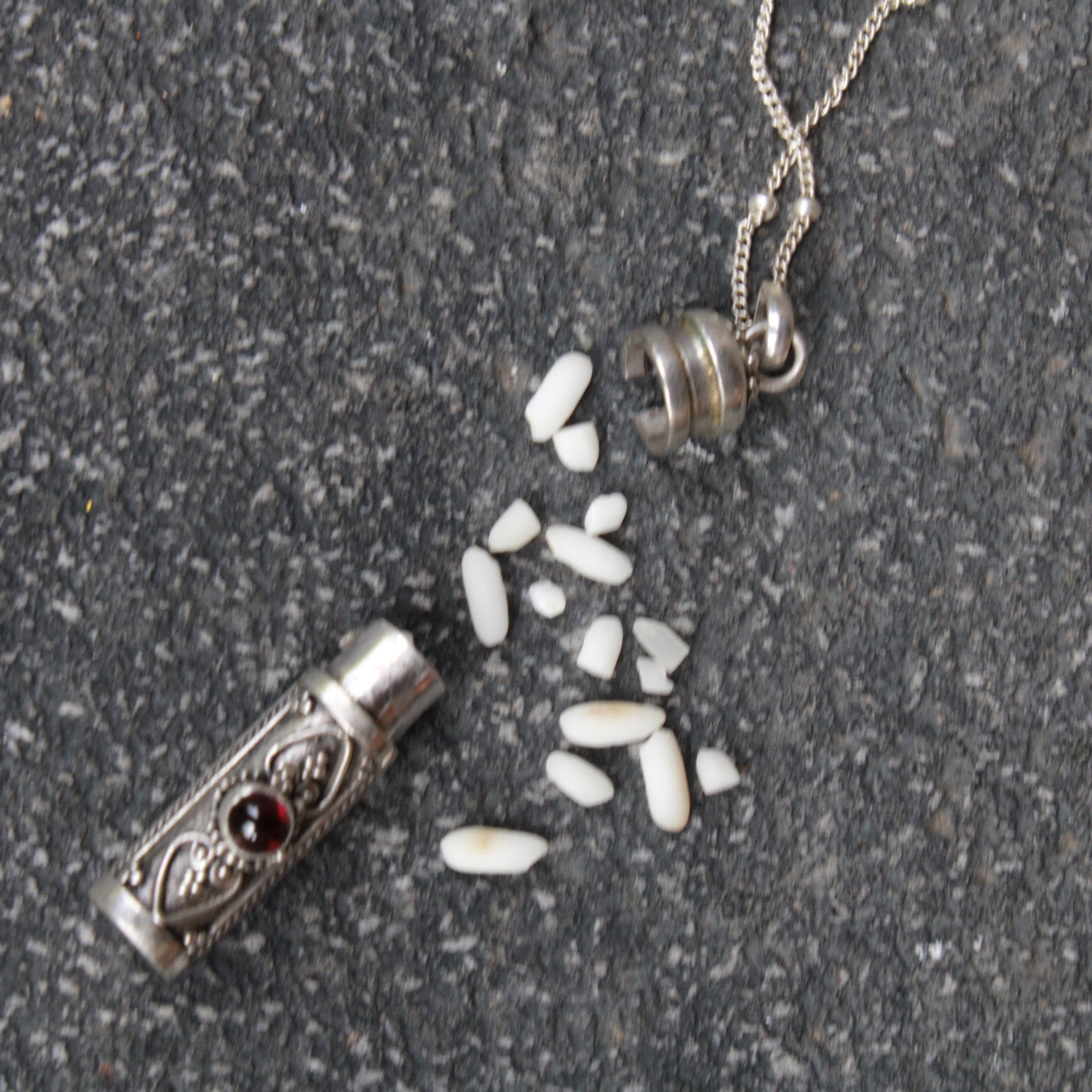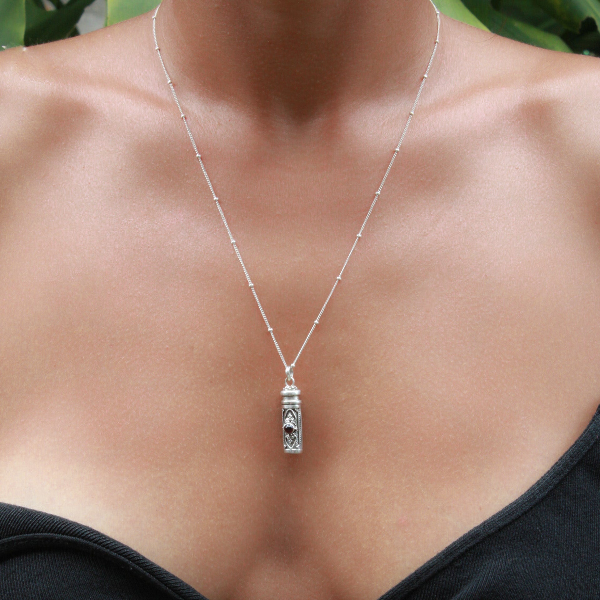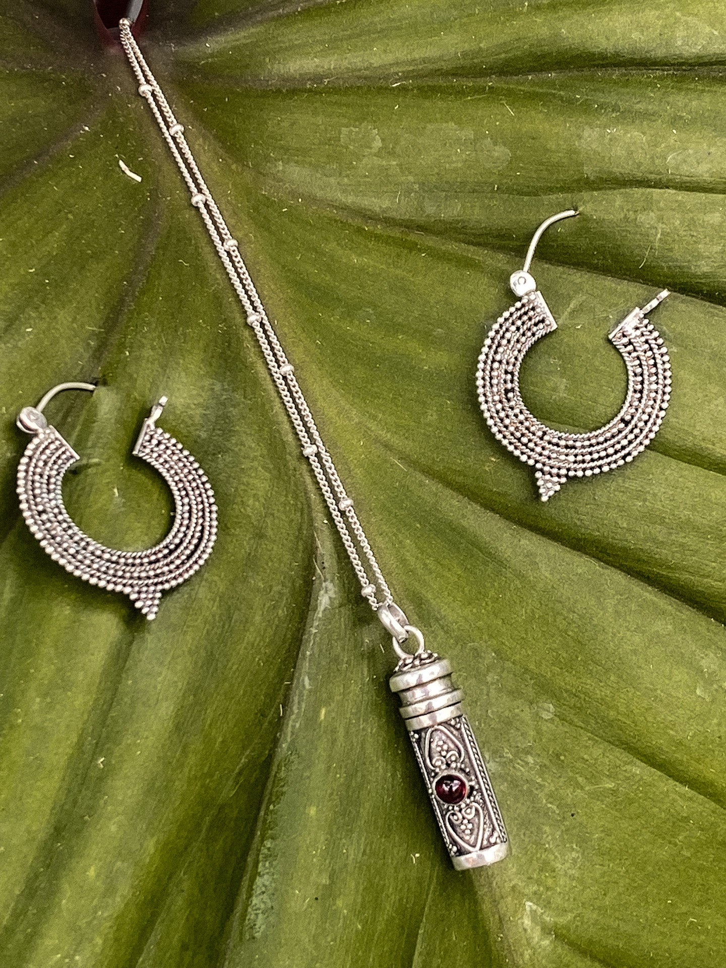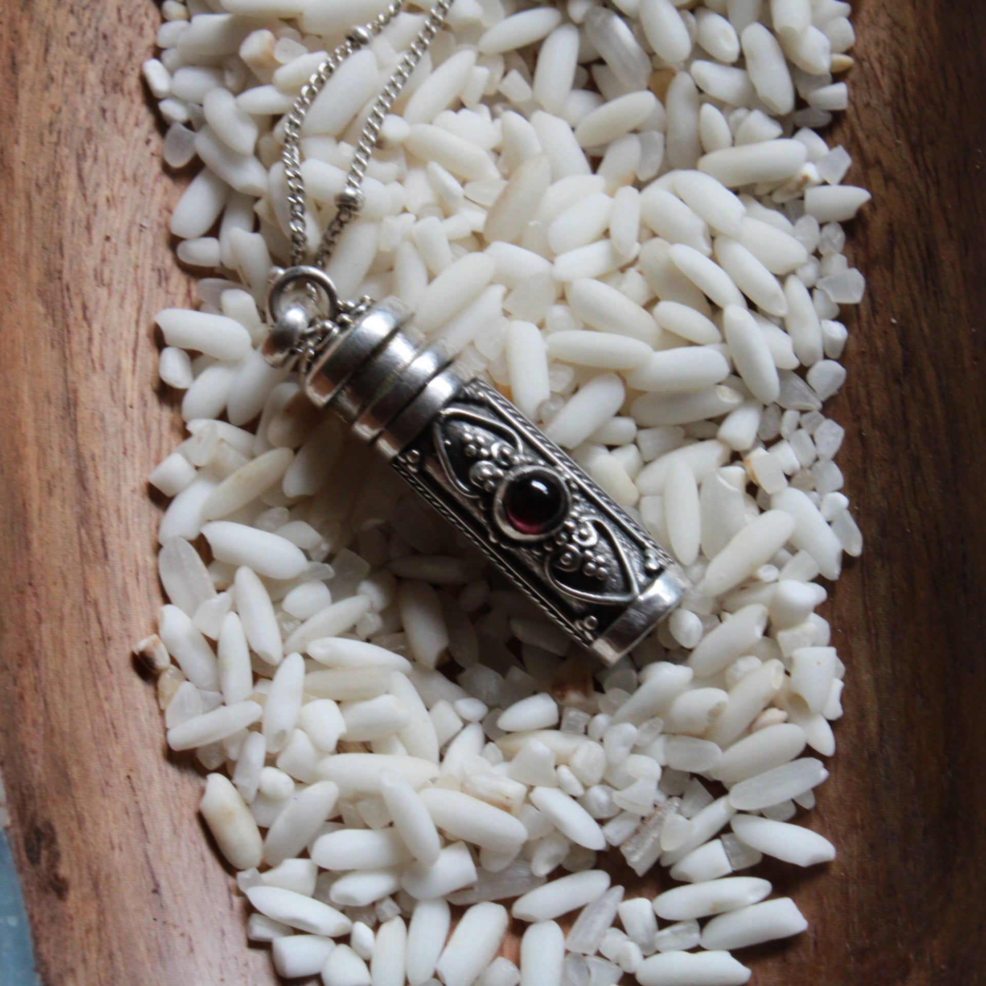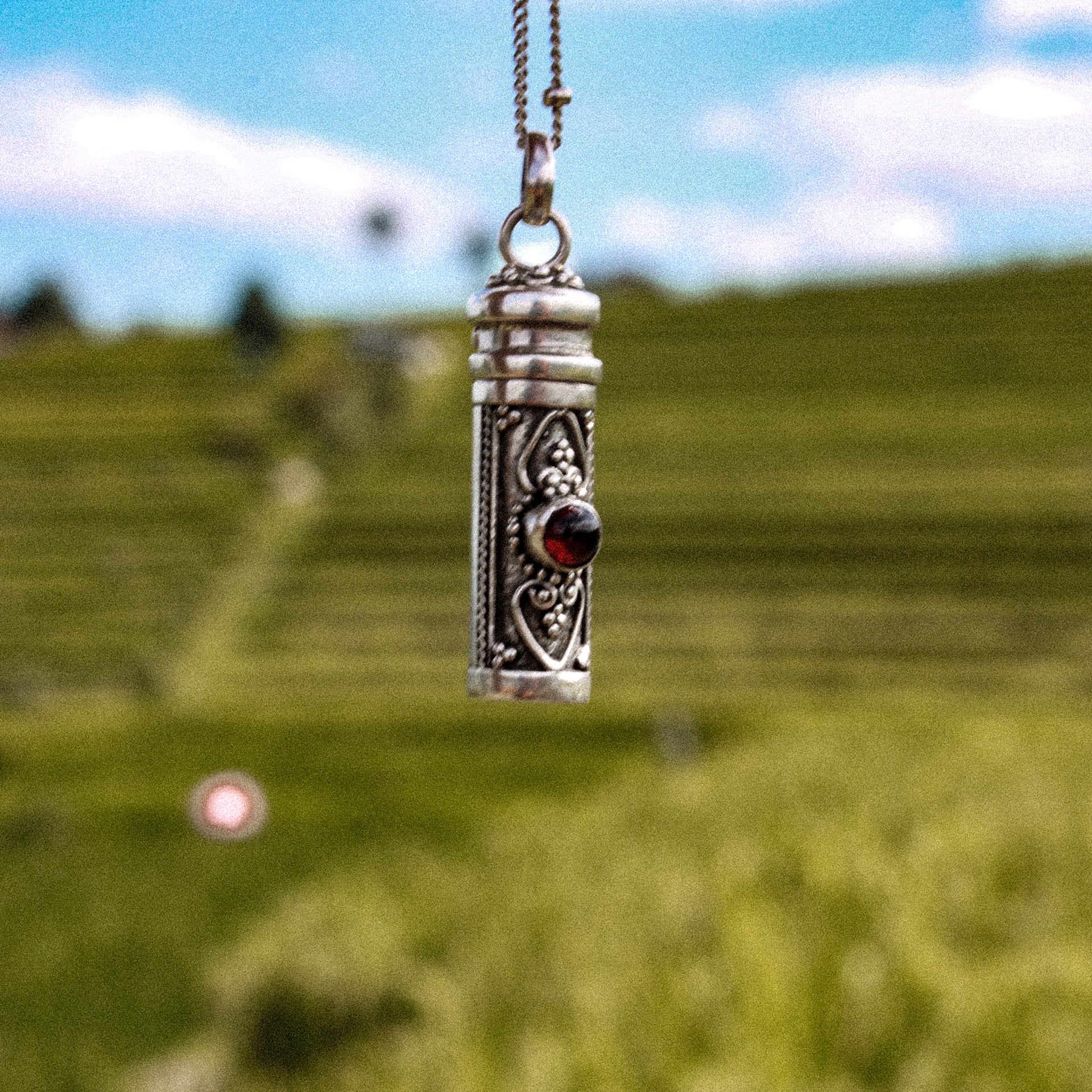 Collana con ciondolo a cilindro contenitore una argento 925 fatto a mano con decori e pietra granata.