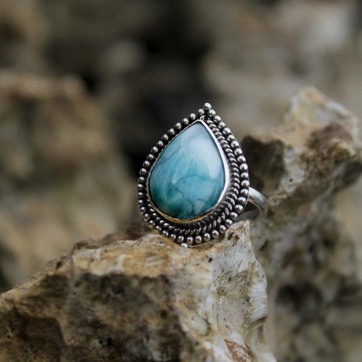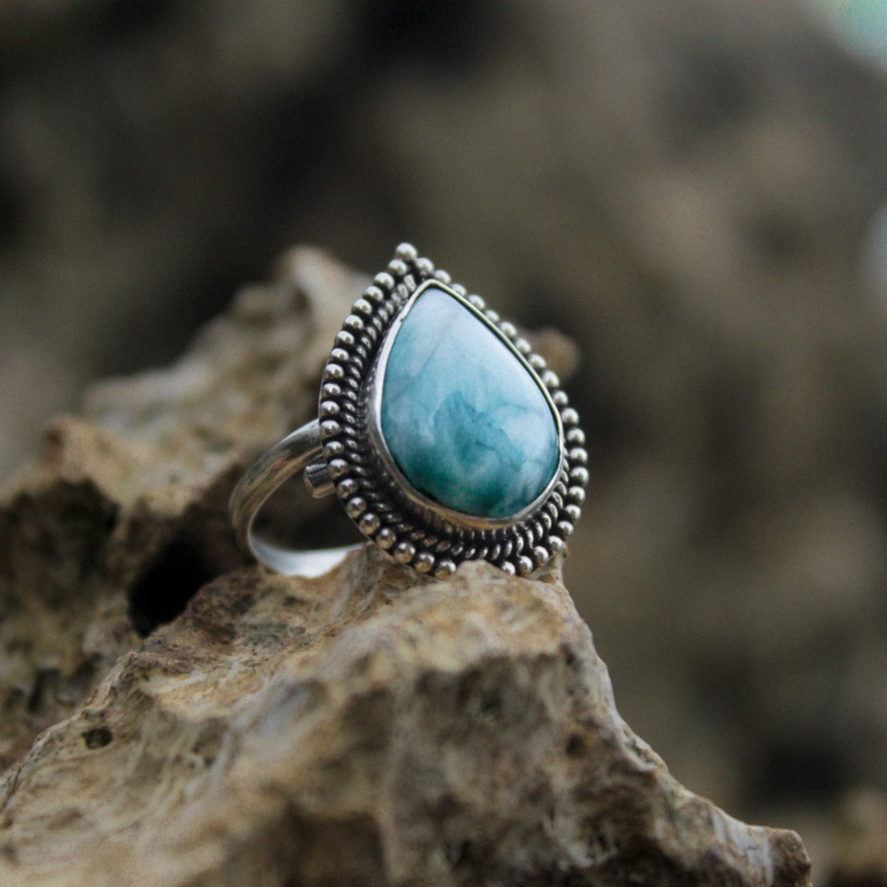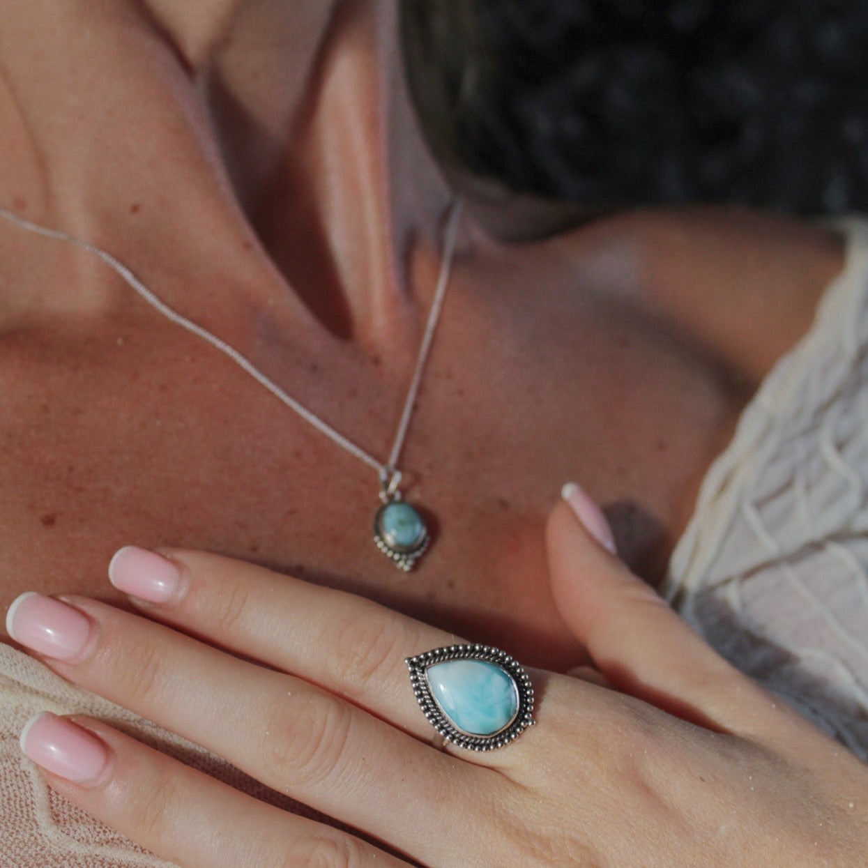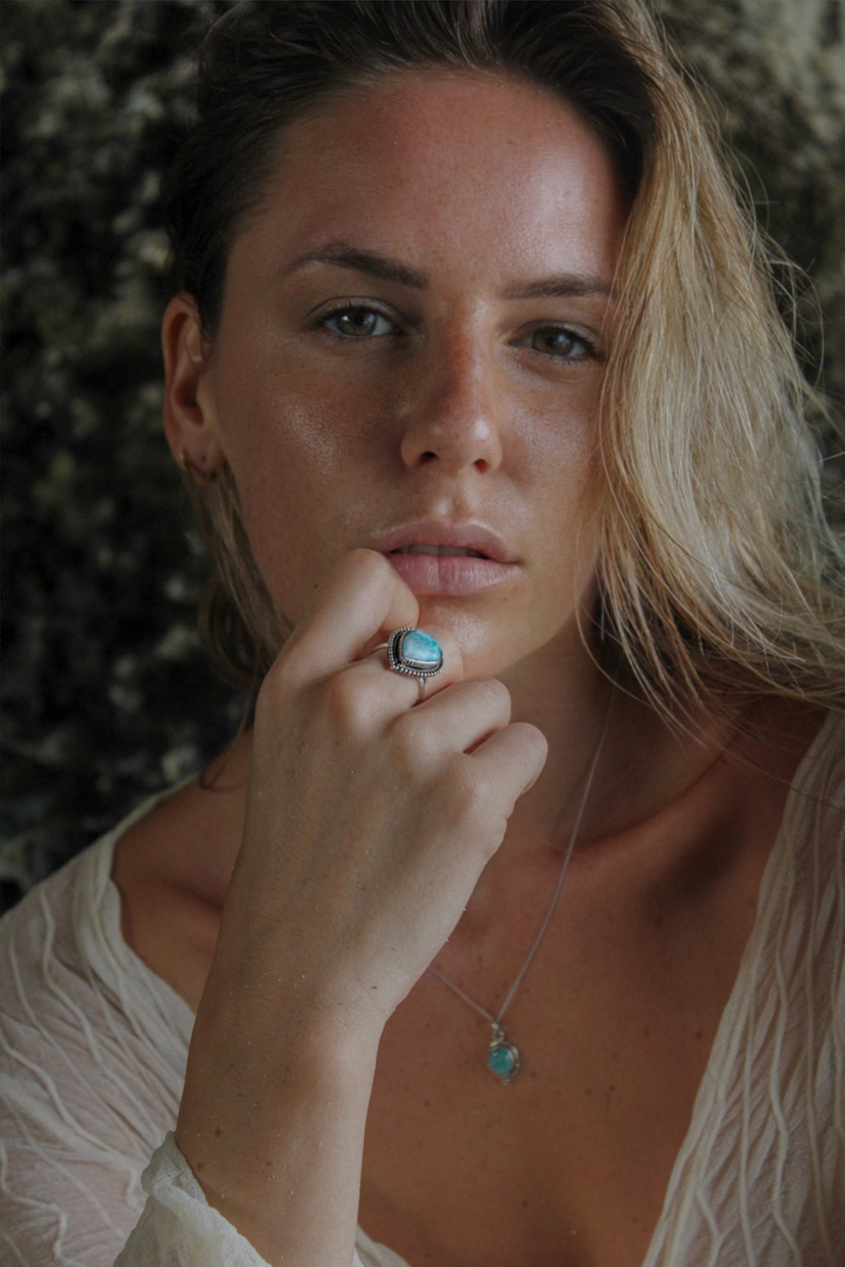 Ho utilizzato gemme di Larimar perchè è una pietra che amo e che richiama il colore dell’Oceano Indiano, che bagna l’Isola.