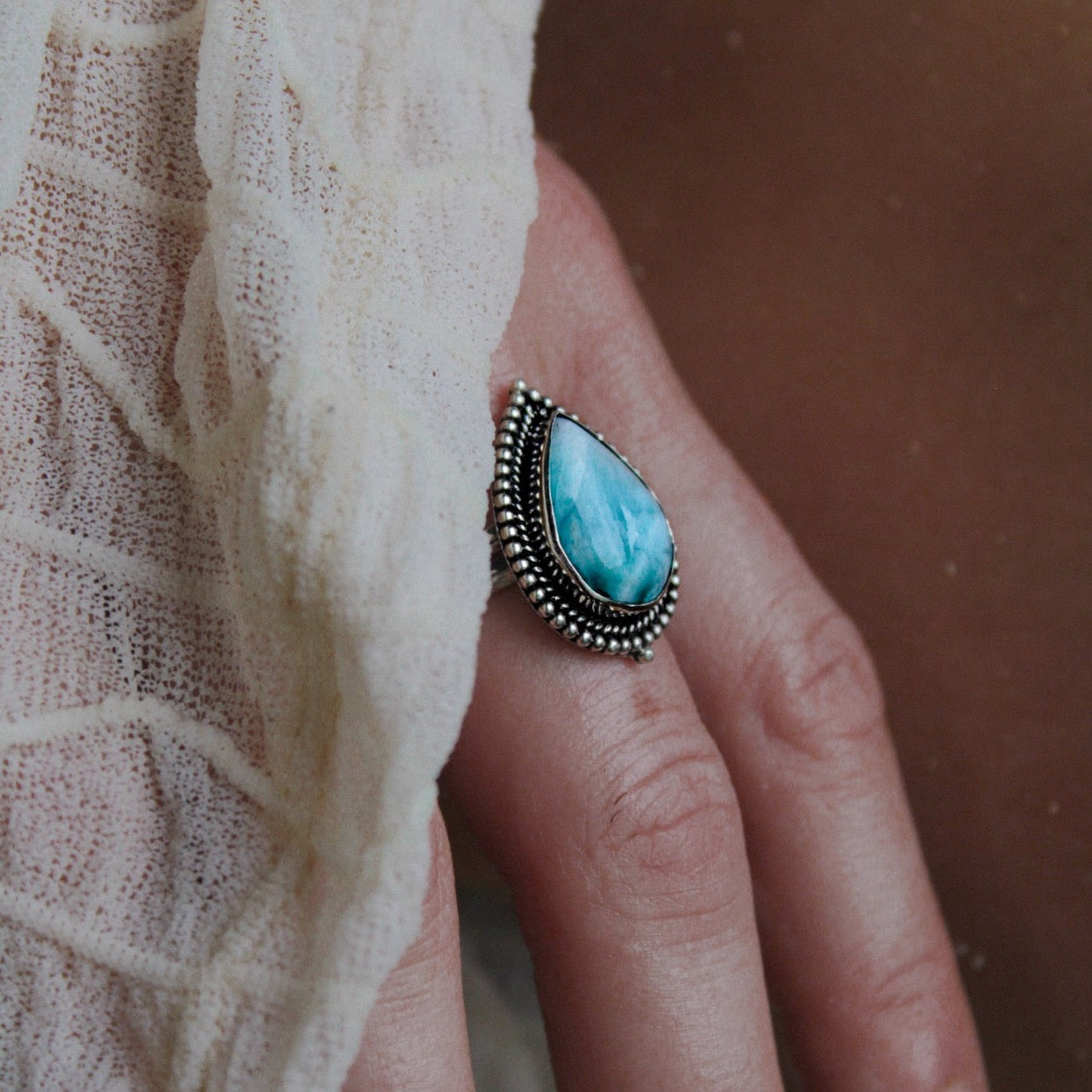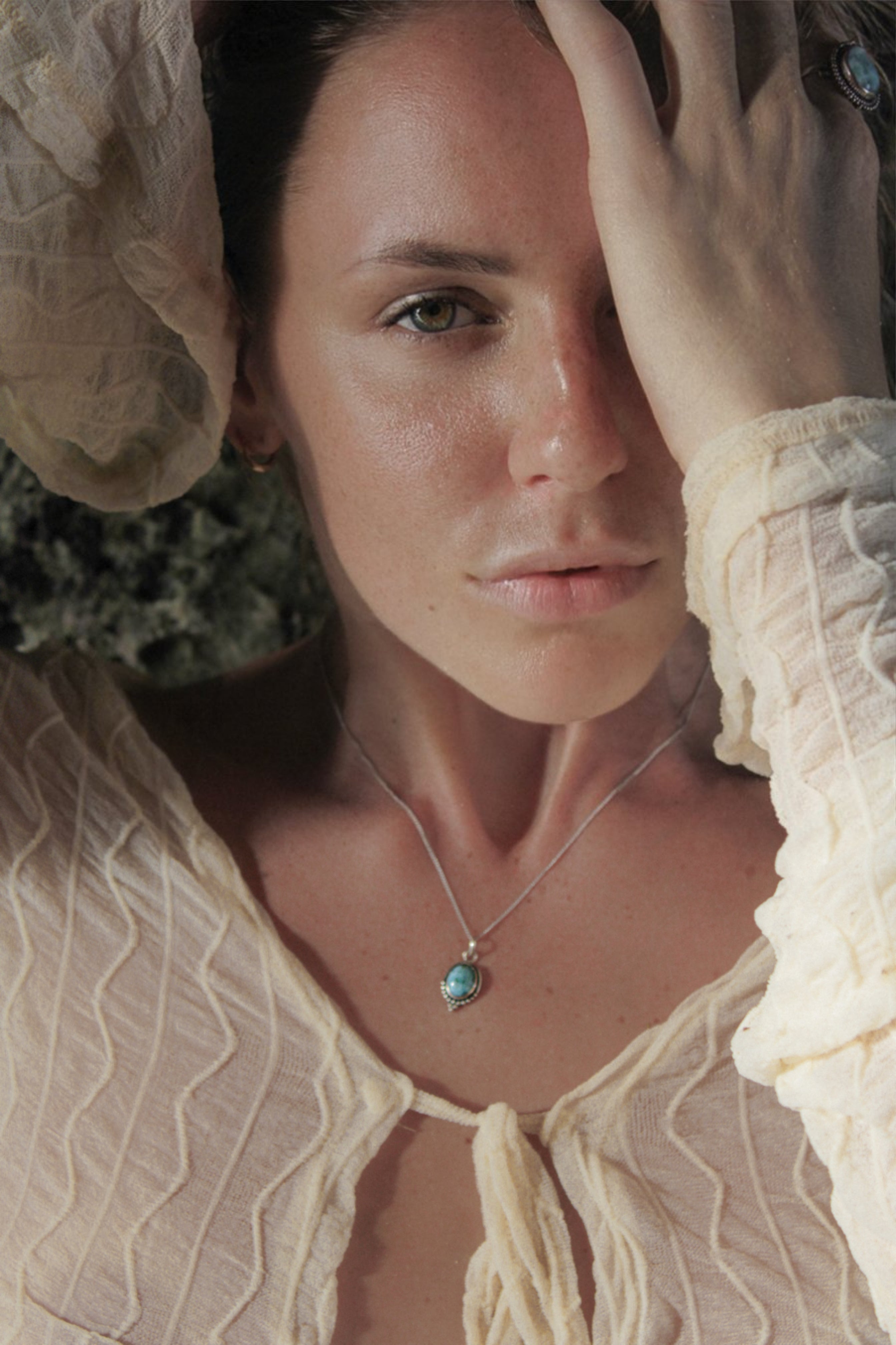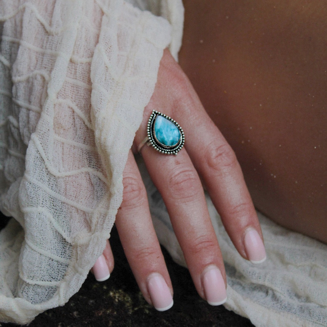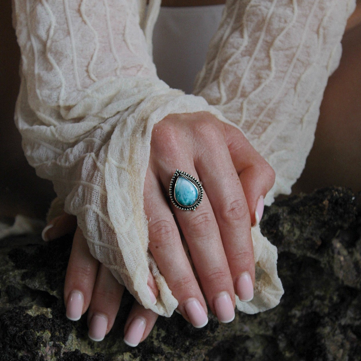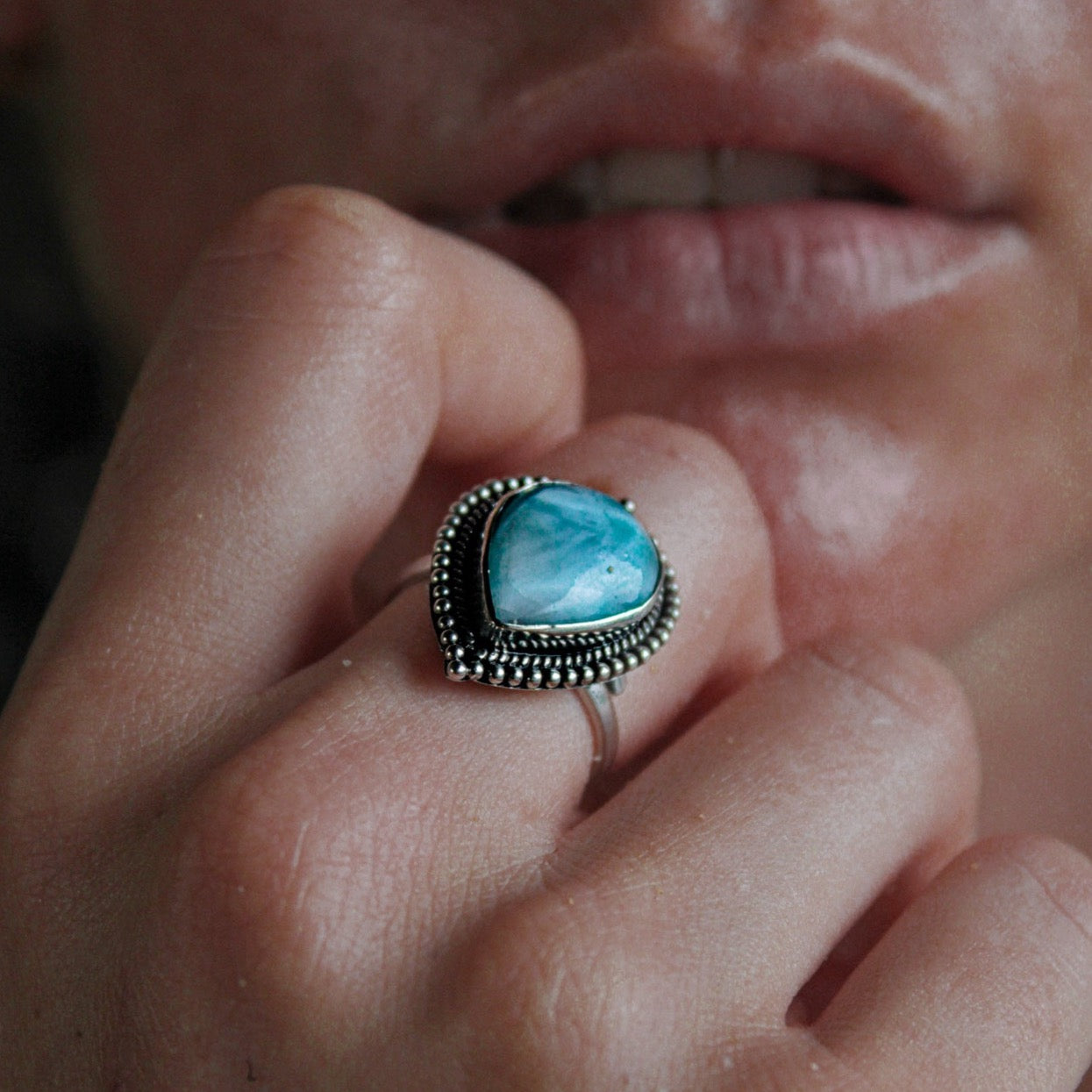 Ho utilizzato gemme di Larimar perchè è una pietra che amo e che richiama il colore dell’Oceano Indiano, che bagna l’Isola.