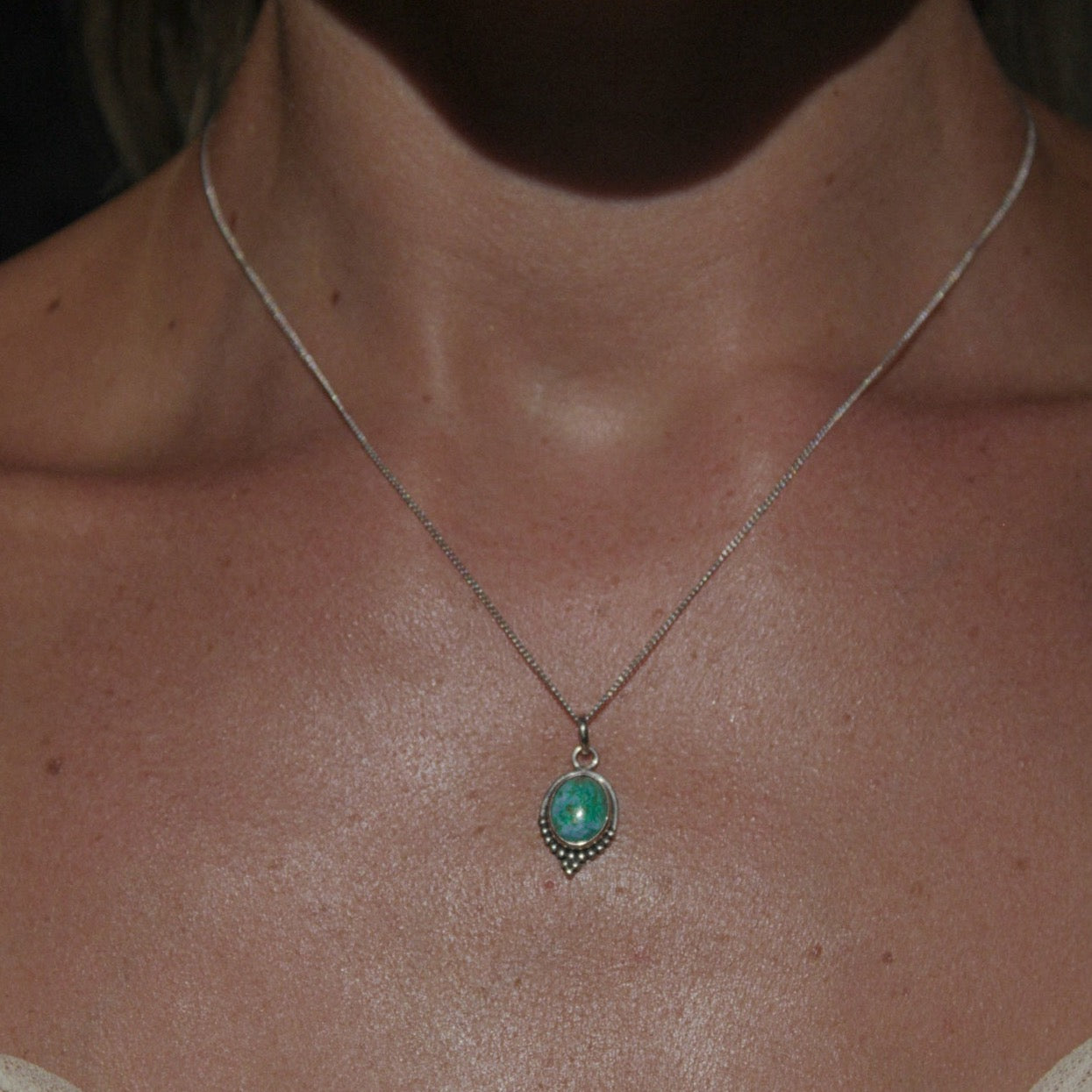 La collana, lunga 45 cm ha un pendente con una gemma di 1 cm e nella metà inferiore una decorazione di piccole sfere.