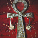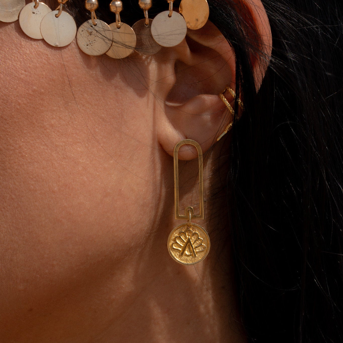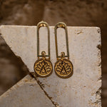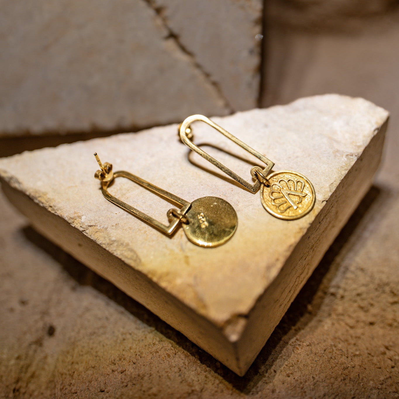 Realizzati a mano in argento 925 placcato oro 18k, questi orecchini portano con sé l’eco di quei simboli antichi: tratti che sembrano scrollarsi di dosso millenni di storia per tornare a brillare sulla pelle.