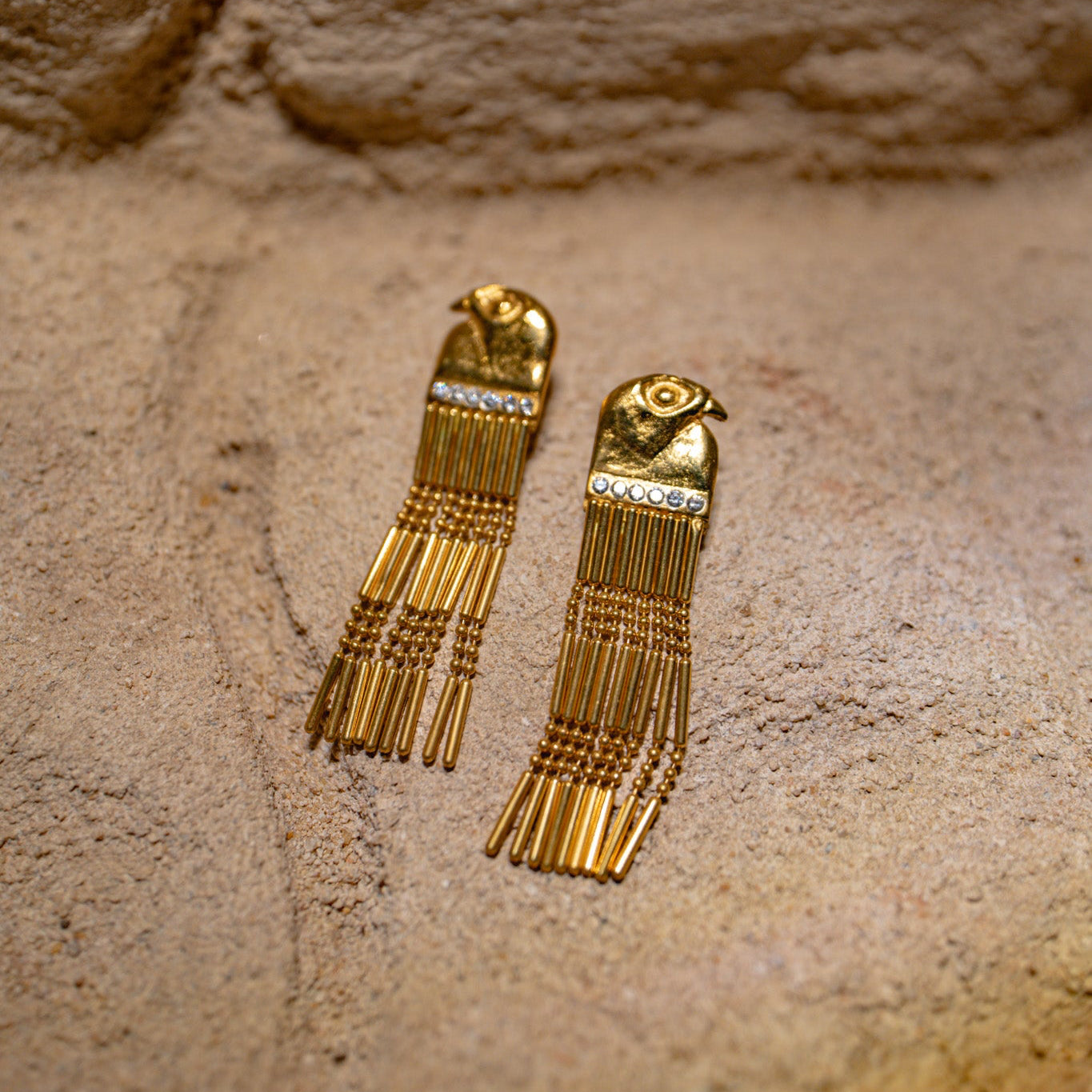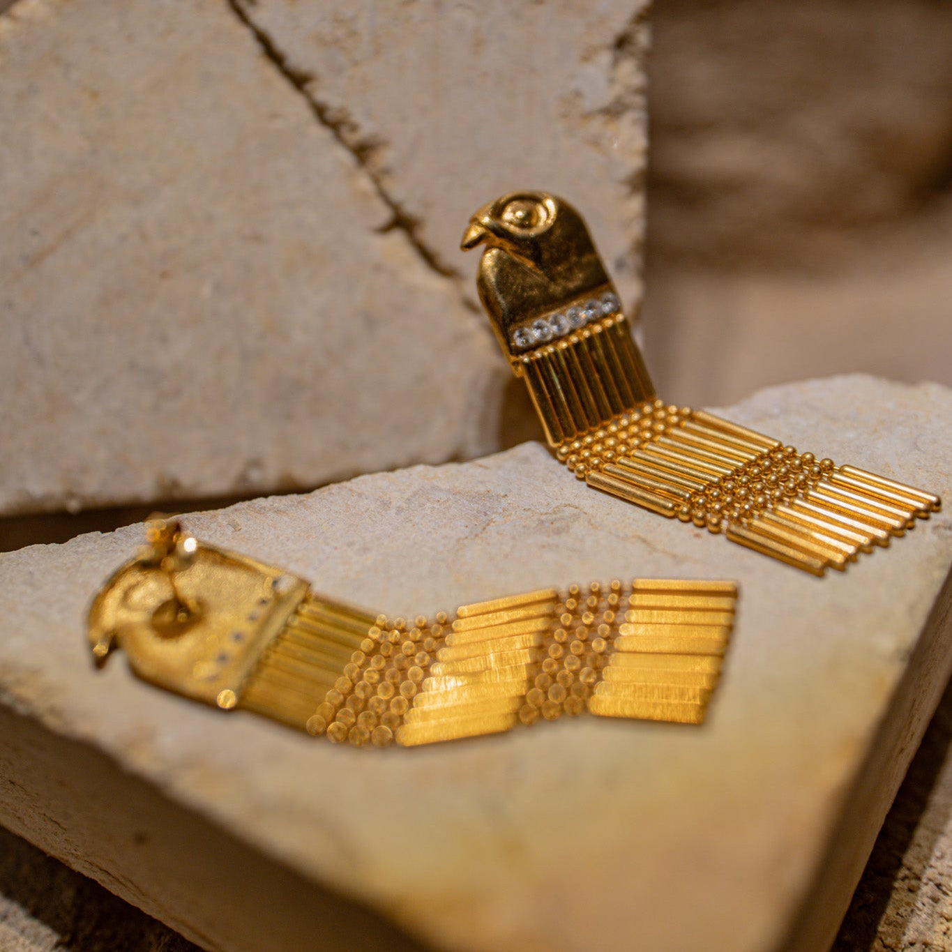 Orecchini pendenti con falco egizio, fatti a mano in Argento 925 placcati Oro 18k con chiusura a farfallina.