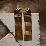 Le frange (semirigide) lunghe e ordinate ricordano i pendenti cerimoniali indossati da sacerdotesse e sovrane, simbolo di potere, grazia e connessione con il divino.