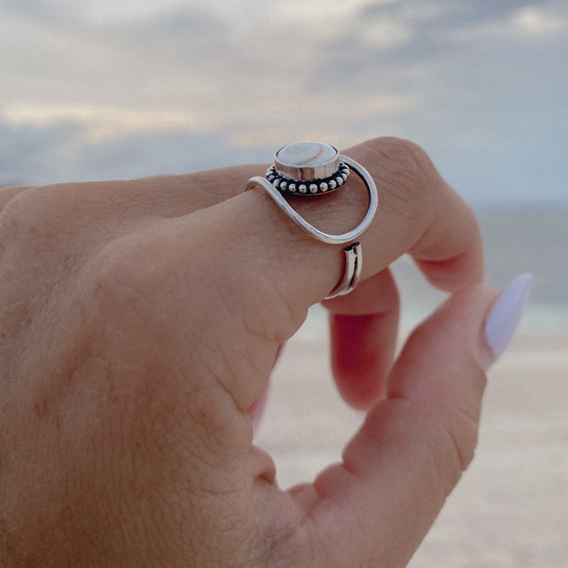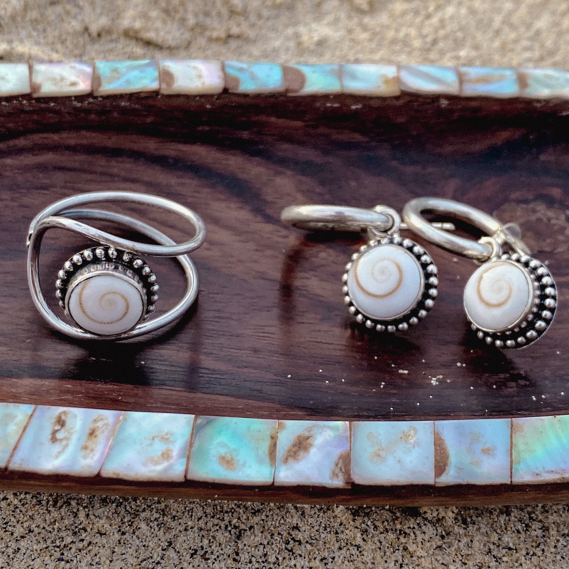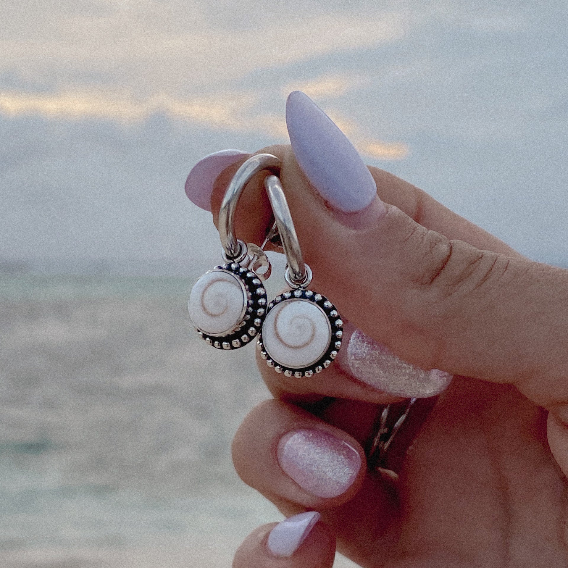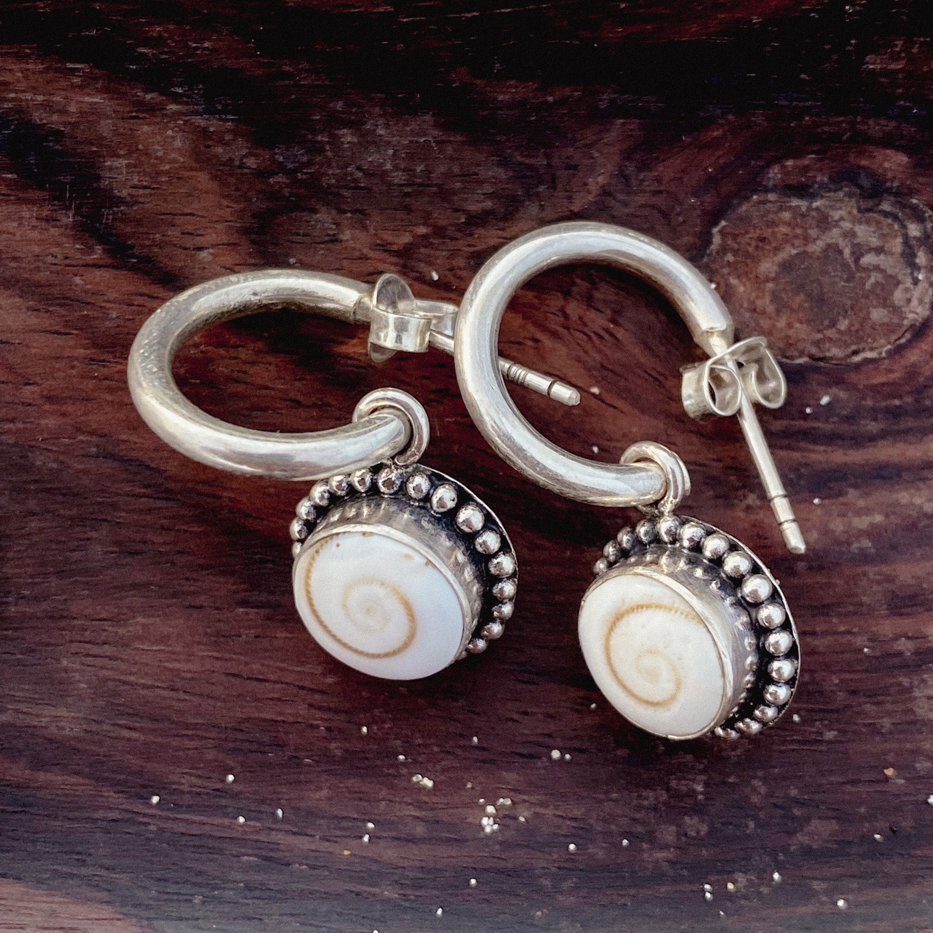 Orecchini in argento 925 con anella semichiusa e chiusura a farfallina, dettaglio con conchiglia Occhio di Shiva e cornice di sfere d'argento.