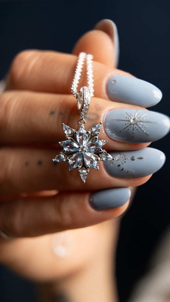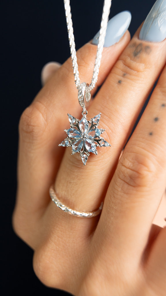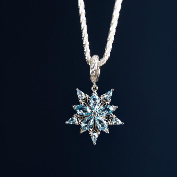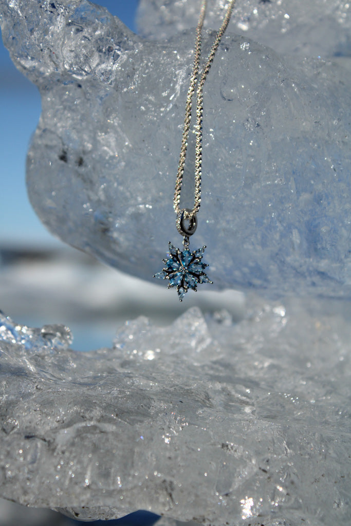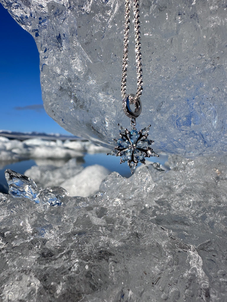 Il ciondolo, un fiocco di neve di 2cm, con zirconi azzurri e bianchi richiama tutte le forme del prisma esagonale.
