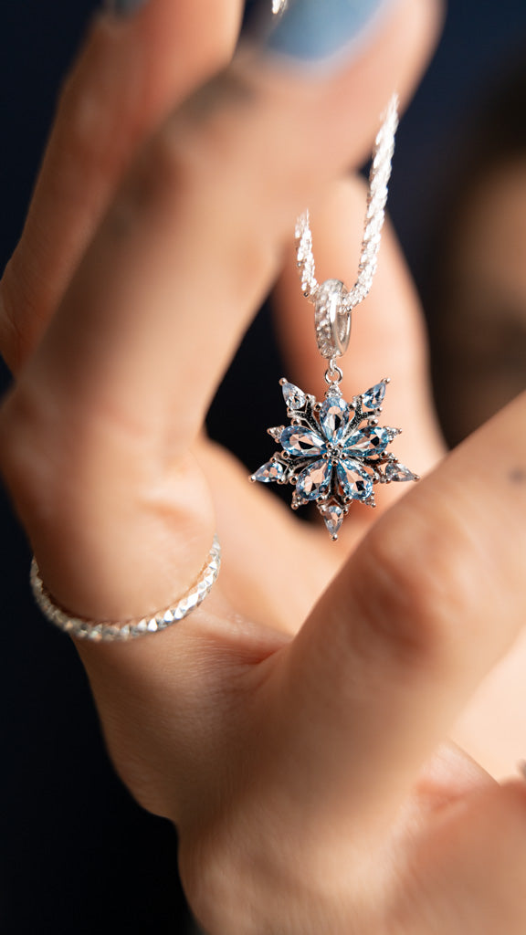 Collana in argento 925 con ciondolo fiocco di neve in zirconi bianchi e azzurri abbinata a bracciale e anello regolabile.