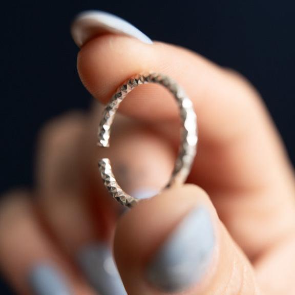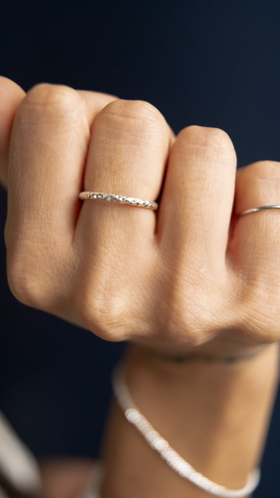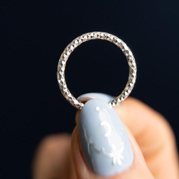 Anello, cavo e regolabile ha un diametro di partenza di 2cm, anch’esso con una texture super brillante realizzata da piccolissimi rombi incastrati tra loro in un perfetto gioco di luci.